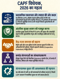 केंद्रीय सशस्त्र पुलिस बल (CAPF) विधेयक, 2026 भारत की आंतरिक सुरक्षा बलों के प्रशासनिक ढांचे में सुधार का एक महत्त्वपूर्ण प्रयास प्रस्तुत करता है, जिसका उद्देश्य एकरूपता और दक्षता सुनिश्चित करना है, किंतु इसकी सफलता इस बात पर निर्भर करेगी कि यह न्यायसंगतता, स्वायत्तता और न्यायिक सिद्धांतों के बीच संतुलन स्थापित करते हुए बलों के मनोबल और संचालनात्मक प्रभावशीलता की रक्षा किस प्रकार करता है।