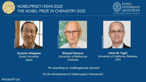 वर्ष 2025 का रसायन विज्ञान का नोबेल पुरस्कार सुसुमु कितागावा, रिचर्ड रॉब्सन और ओमर याघी को ‘मेटल-ऑर्गेनिक फ्रेमवर्क्स’ (MOFs) के क्षेत्र में अग्रणी कार्य के लिए प्रदान किया गया है, ये ऐसे पदार्थ हैं, जिनकी विशिष्ट छिद्रयुक्त संरचना (Porous Structure) अनेक वैज्ञानिक एवं औद्योगिक अनुप्रयोगों को संभव बनाती है।