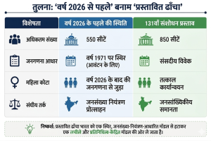 परिसीमन पर बहस केवल सीटों के विस्तार तक सीमित नहीं है, बल्कि यह लोकतांत्रिक समानता और संघवाद के बीच मूल संतुलन से जुड़ी हुई है, जैसा कि 131वाँ संविधान संशोधन विधेयक के पारित न होने से स्पष्ट होता है। केवल जनसंख्या-आधारित दृष्टिकोण संघीय असंतुलन का जोखिम उत्पन्न करता है, जबकि अत्यधिक कठोरता लोकतांत्रिक वैधता को कमजोर करती है; अतः भारत के लिए केवल एक बड़ी संसद नहीं, बल्कि एक संतुलित, दूरदर्शी संवैधानिक ढाँचा आवश्यक है।
