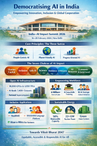 वर्ष 2026 में, AI का लोकतंत्रीकरण भारत की राष्ट्रीय रणनीति का एक आधारशिला है, जो “तकनीकी अभिजात वर्ग” से आगे बढ़कर इसकी वृद्धि के केंद्र में स्थित 1.45 अरब लोगों को सशक्त बनाने की दिशा में काम करेगा।