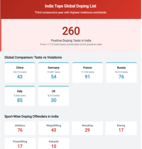 विश्व डोपिंग रोधी एजेंसी (WADA) की हालिया रिपोर्ट के अनुसार, भारत लगातार तीसरे वर्ष डोपिंग उल्लंघनों में सबसे बड़ा योगदानकर्ता बनकर उभरा है, जिससे वर्ष 2030 राष्ट्रमंडल खेलों और वर्ष 2036 ओलंपिक खेलों की मेजबानी की महत्त्वाकांक्षाओं के बीच संस्थागत विश्वसनीयता को लेकर चिंताएँ बढ़ गई हैं।