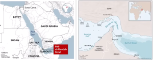 | बाब-अल-मंदेब (Bab-el-Mandeb) | लाल सागर का प्रवेश द्वार, जो स्वेज नहर से जुड़ा है। | यूरोप-एशिया व्यापार के लिए अत्यंत महत्वपूर्ण। यहाँ व्यवधान से मालभाड़ा दरें बढ़ती हैं और खाद्य सुरक्षा संबंधी खतरे उत्पन्न होता है। |