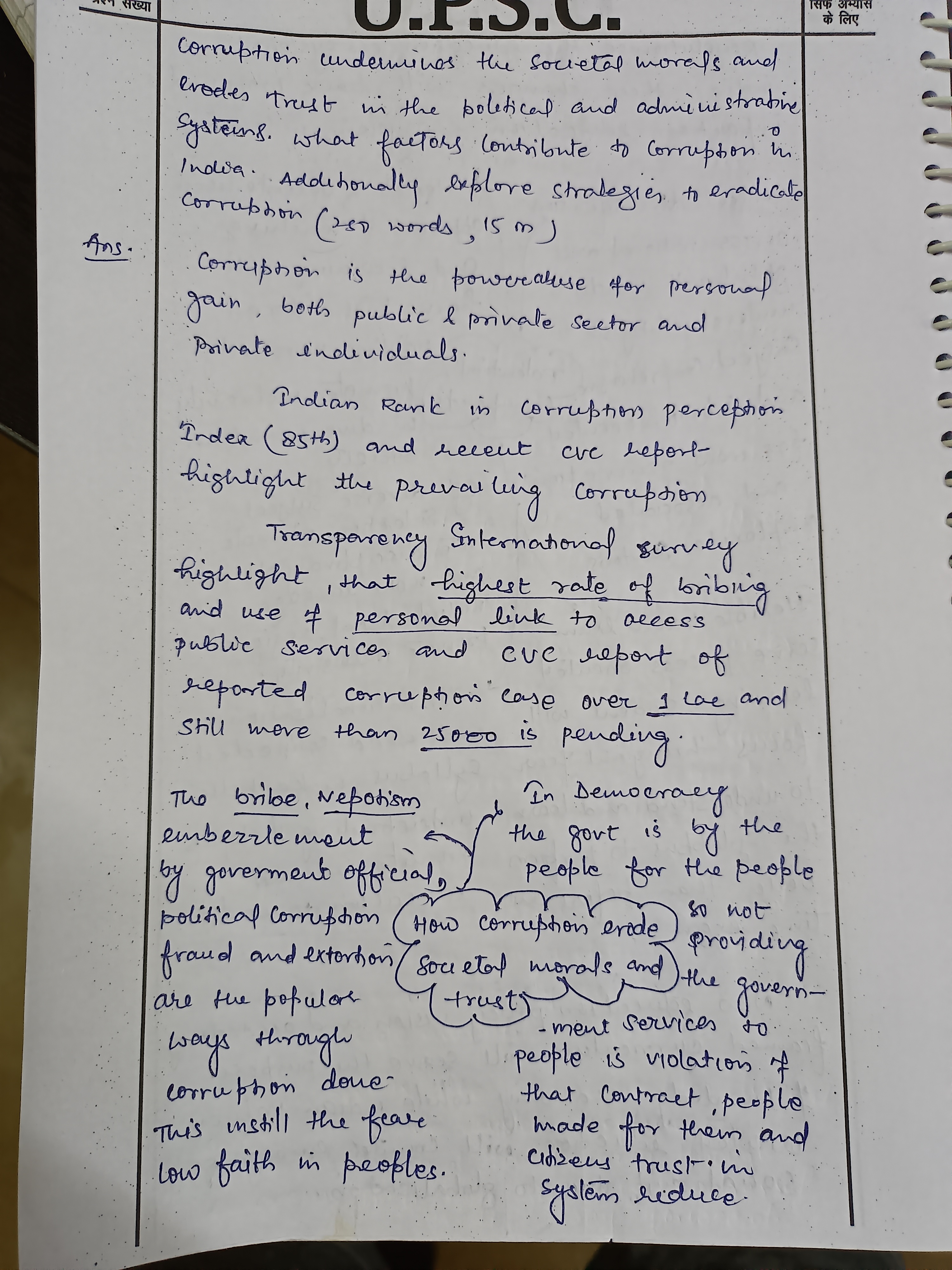 Corruption is a deep-rooted issue that undermines societal morals and erodes trust in political and administrative systems. It hampers economic development, exacerbates inequality, and undermines the democratic values of a society. In India, corruption is rampant and manifests in various forms, from petty bribes to large scale frauds. It costs 5 per cent of the GDP through corruption.