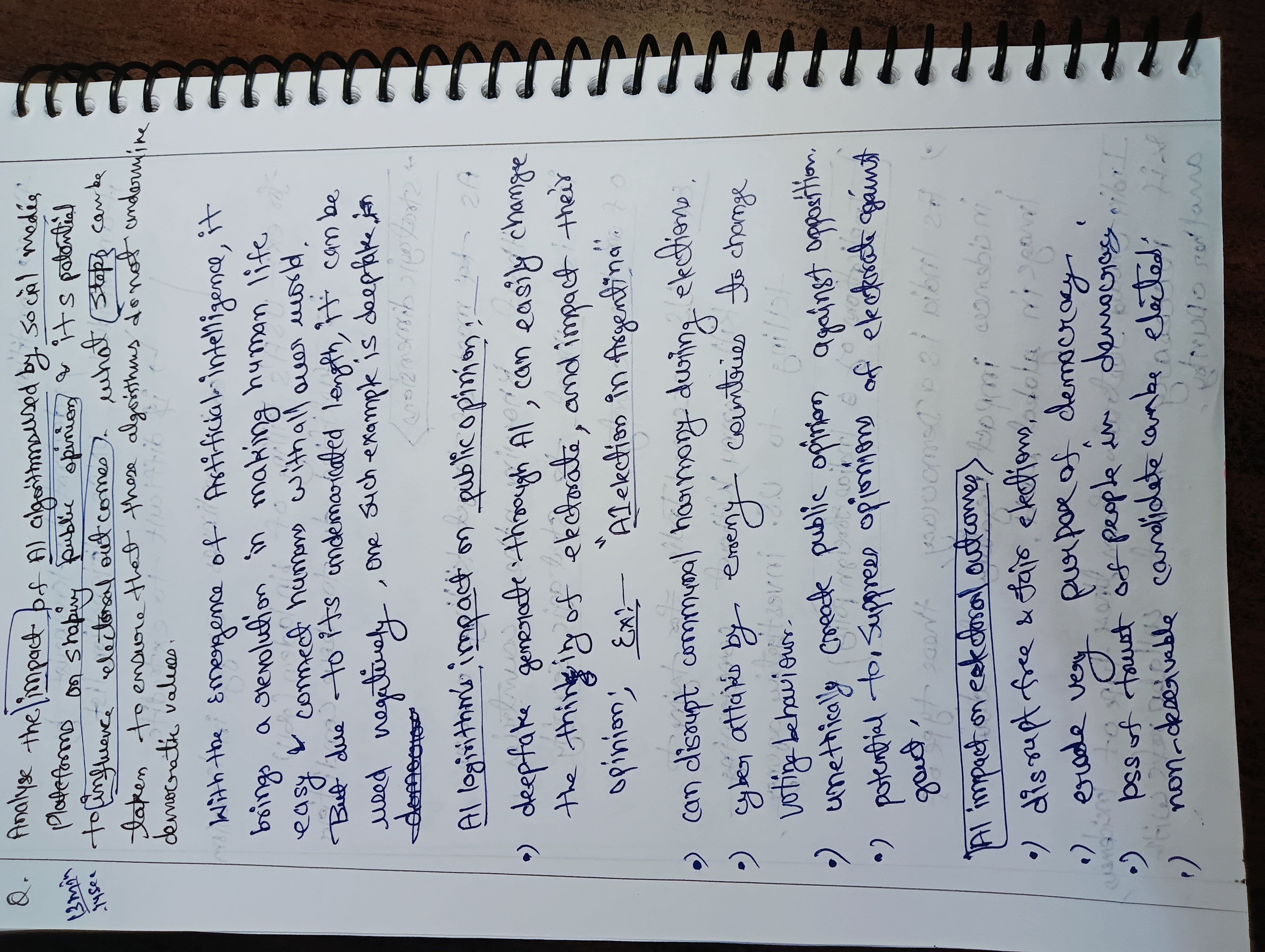 AI algorithms on social media platforms have a profound impact on shaping public opinion and can influence electoral outcomes, particularly in a diverse and populous country like India. While these algorithms can foster engagement, they can also lead to polarization, disinformation, and manipulation. To ensure democratic values are not undermined, stakeholders should prioritize regulation, transparency, ethical AI design, and public awareness. By taking these steps, society can mitigate the risks associated with AI algorithms and promote a more inclusive and democratic environment.