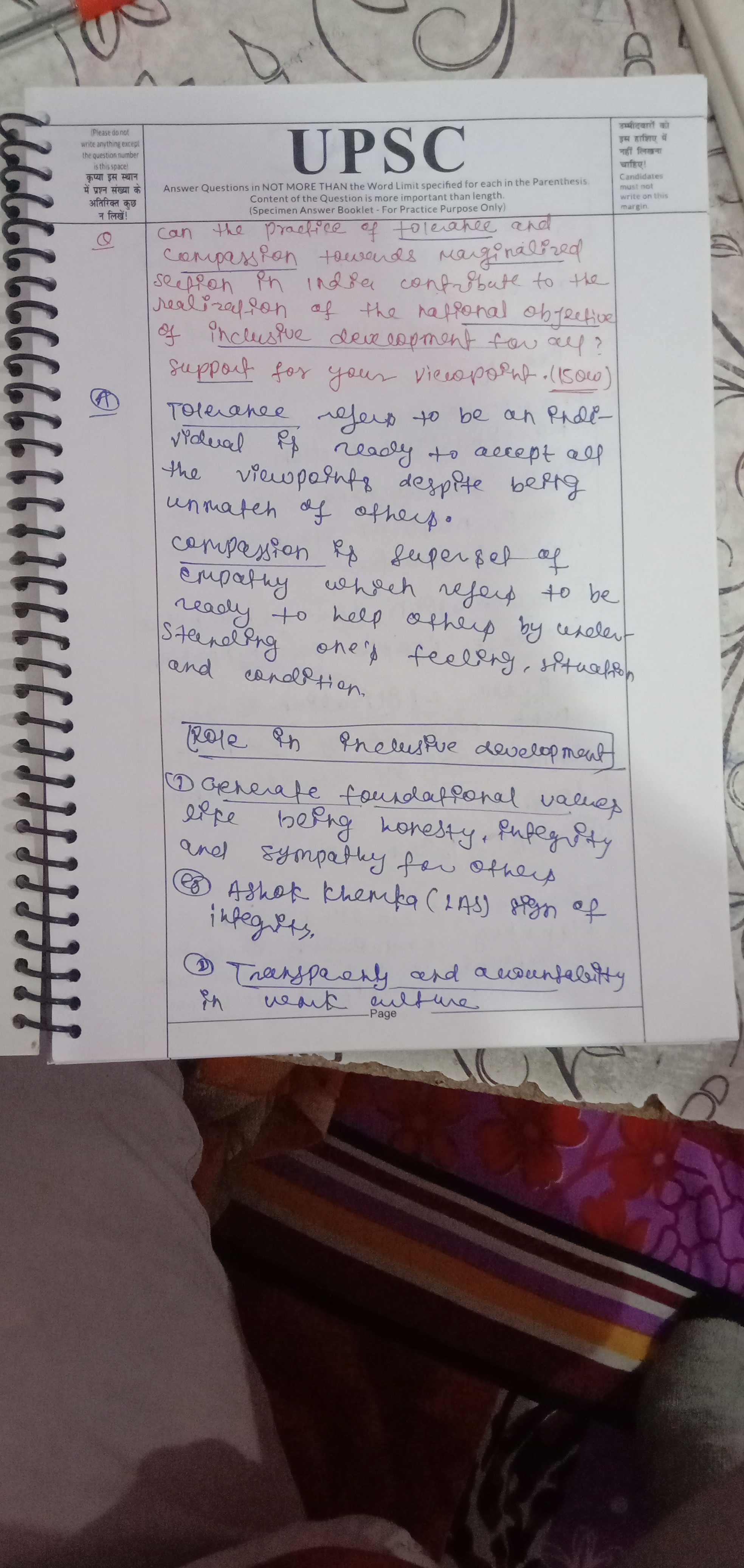 Q. Can the practice of tolerance and compassion towards marginalized sections in India contribute to the realization of the national objective of inclusive development for all? Support reasons for your viewpoint. (10 marks, 150 words) additional