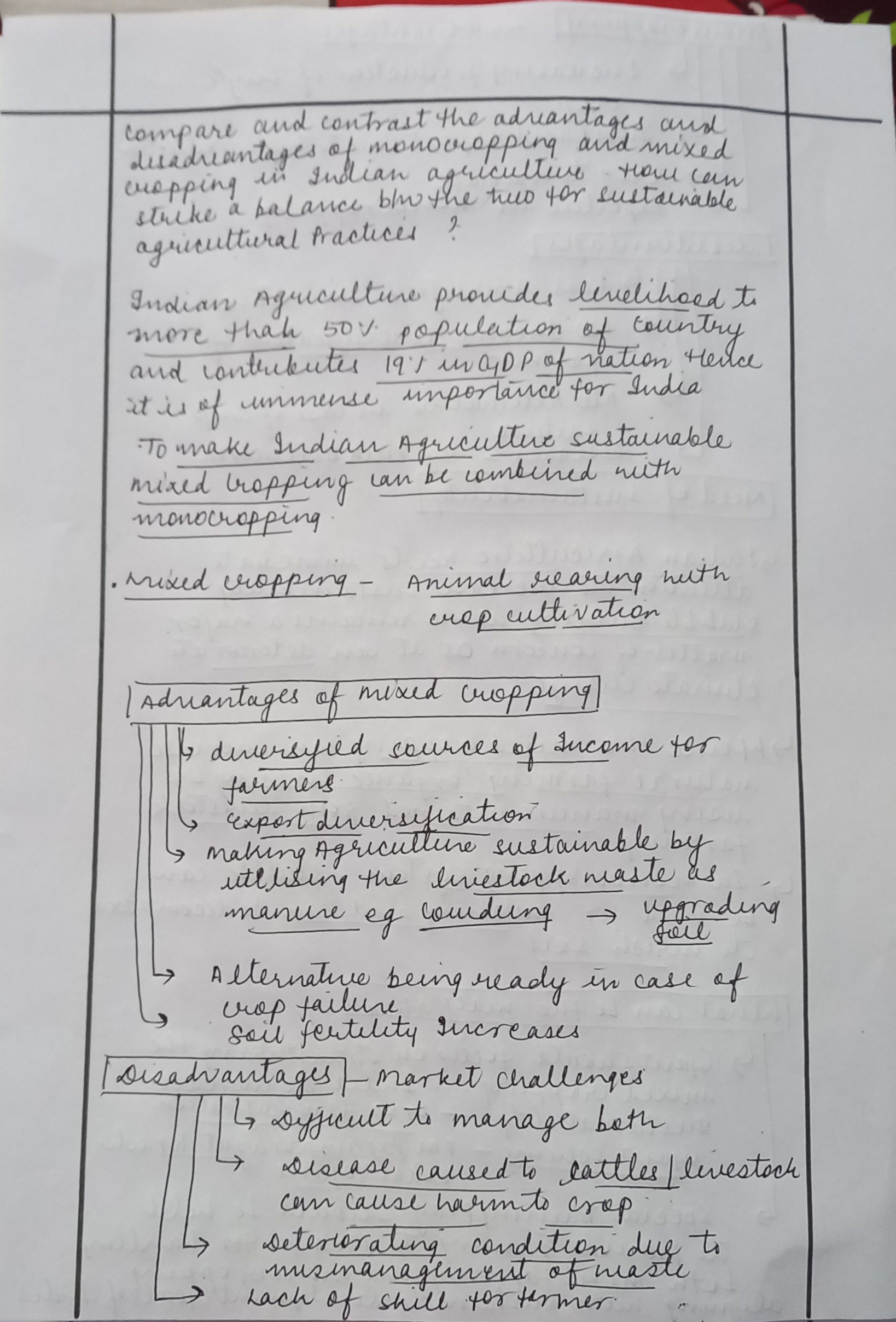 - Discuss the advantages and disadvantages of monocropping and mixed cropping in the context of Indian Agriculture.