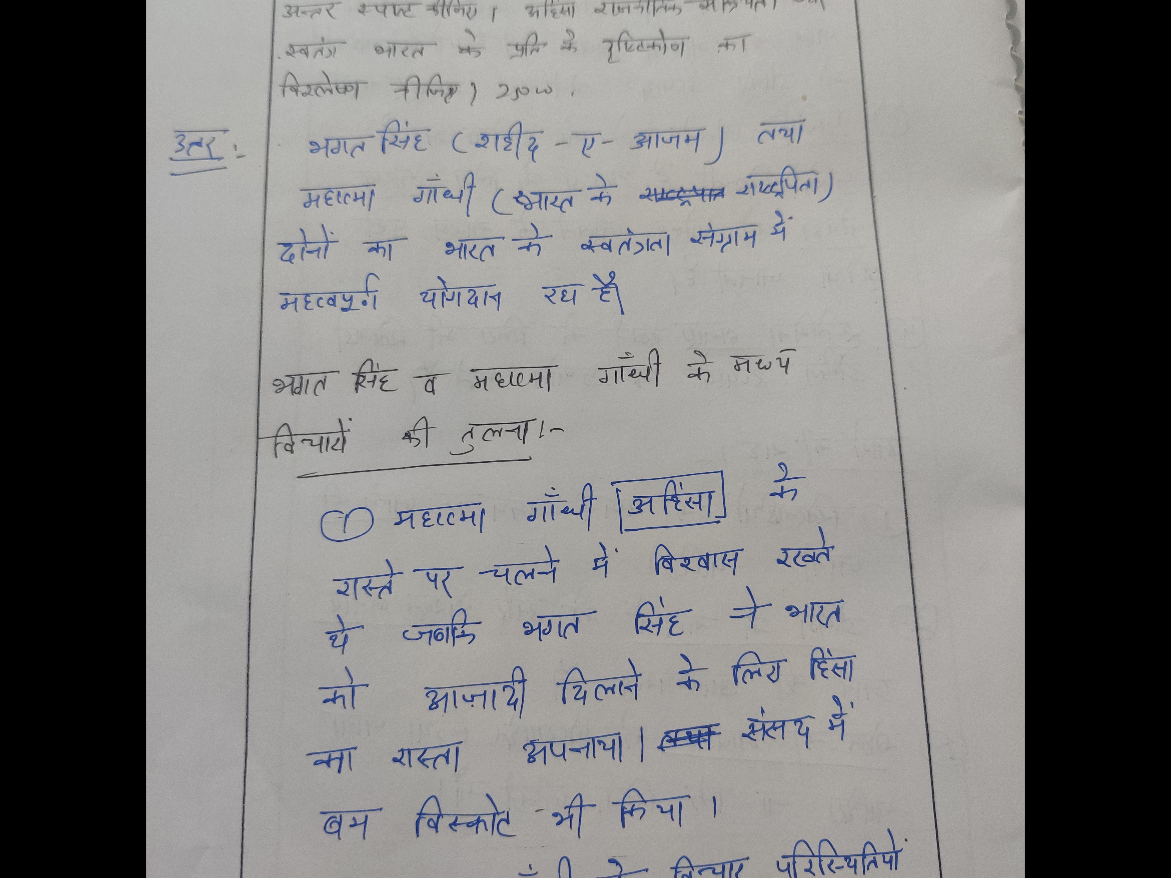 भगत सिंह और महात्मा गांधी दो सर्वश्रेष्ठ नेता थे जिन्होंने भारत के स्वतंत्रता संग्राम में महत्वपूर्ण भूमिका निभाई। दोनों के पास अद्वितीय वैचारिक दृष्टिकोण थे, जो लाखों लोगों को संगठित करने वाले तरीकों और दर्शन से लोगों का प्रतिनिधित्व करते थे। इन दोनों नायकों का अंतिम उद्देश्य भारत की स्वतंत्रता ही था किन्तु उनकी रणनीतियाँ, विश्वास और दृष्टिकोण एक दूसरे से बिलकुल अलग-अलग थे।