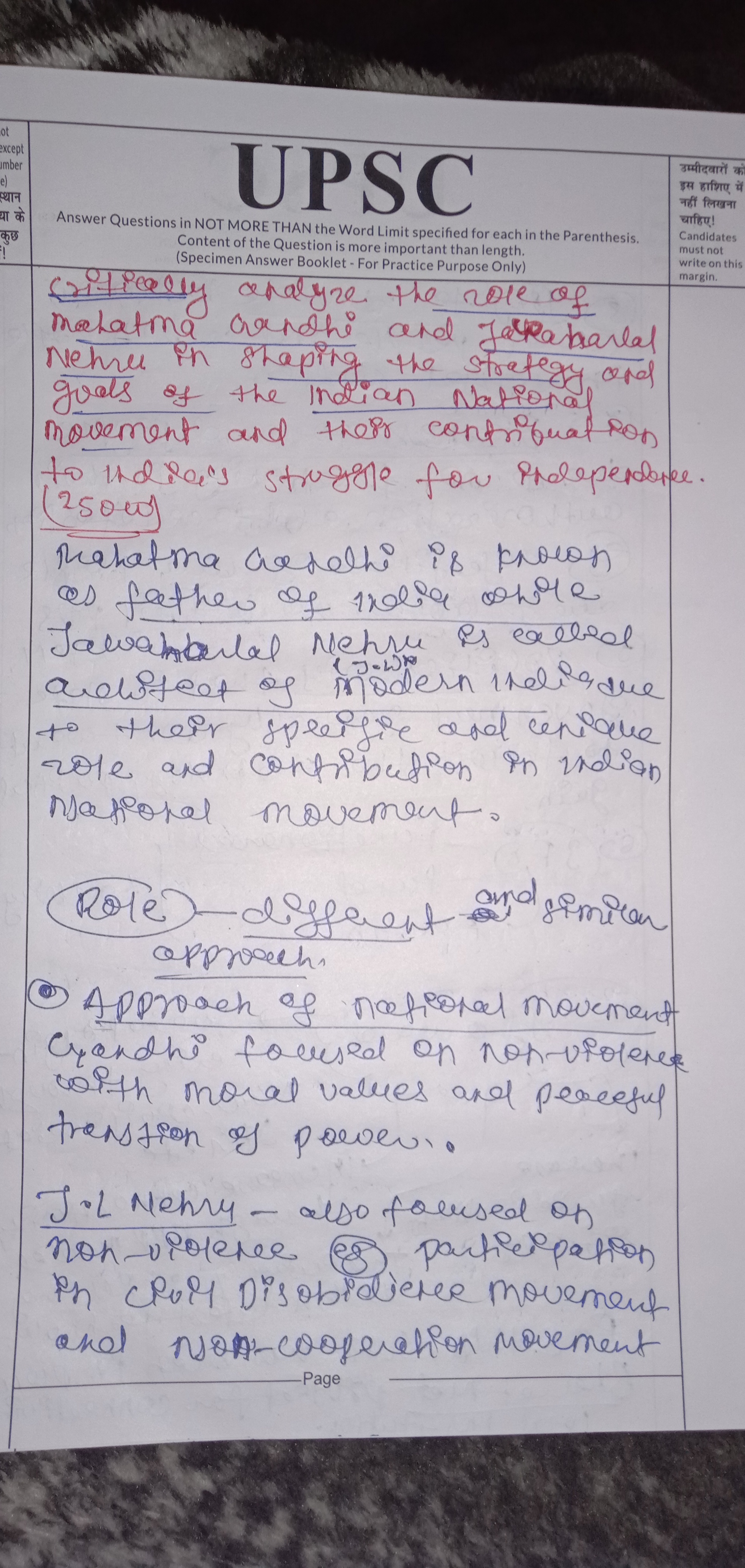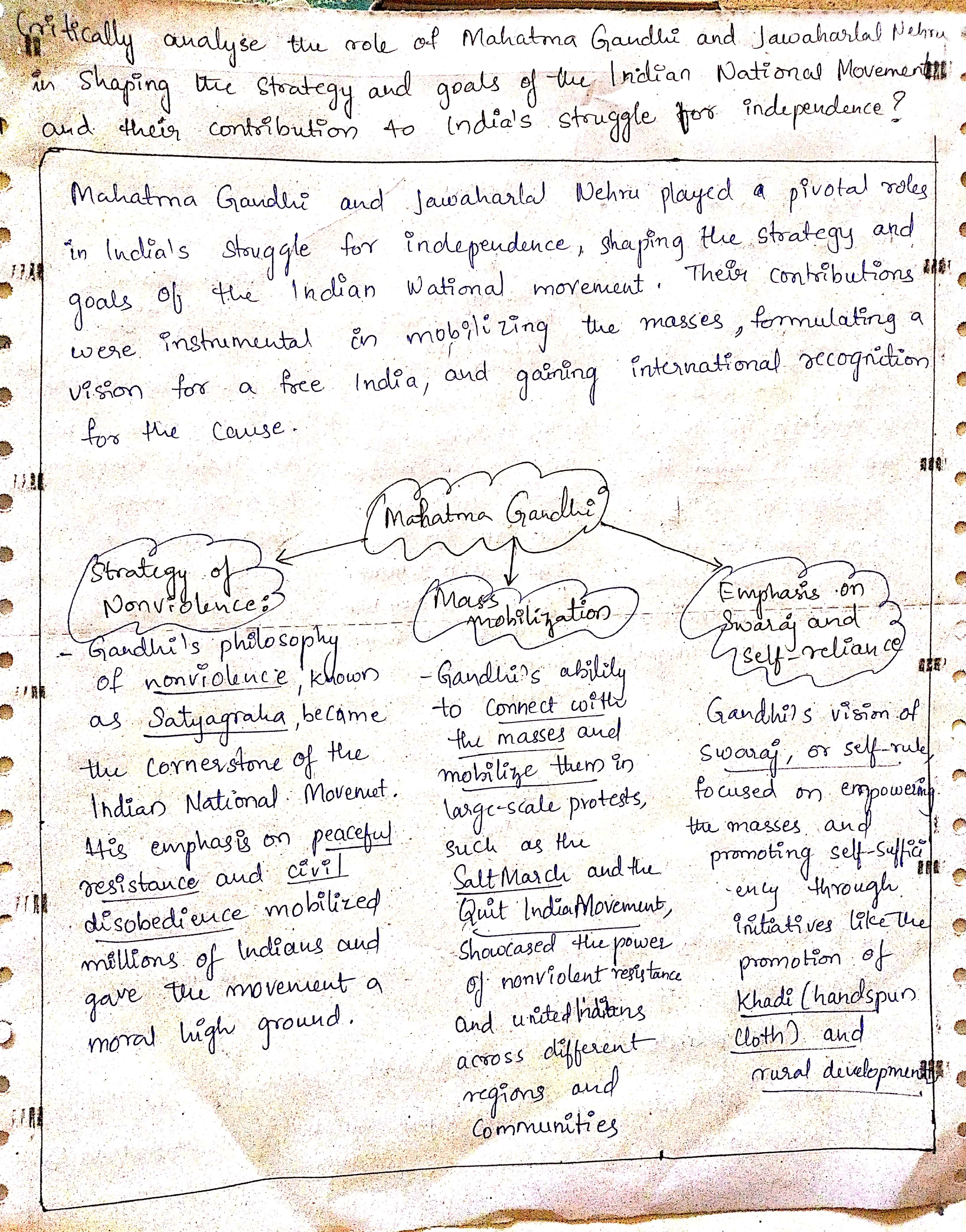 The roles of Mahatma Gandhi and Jawaharlal Nehru were complementary in shaping the strategy and goals of the Indian National Movement. Gandhi’s emphasis on non-violence, grassroots mobilization, and moral regeneration, coupled with Nehru’s focus on modernization, secularism, and internationalism, provided a multifaceted leadership that not only accelerated India’s struggle for independence but also laid the foundation for a modern, democratic India. Their legacy continues to inspire and guide the nation in its ongoing journey towards realizing the ideals of justice, liberty, equality, and fraternity.