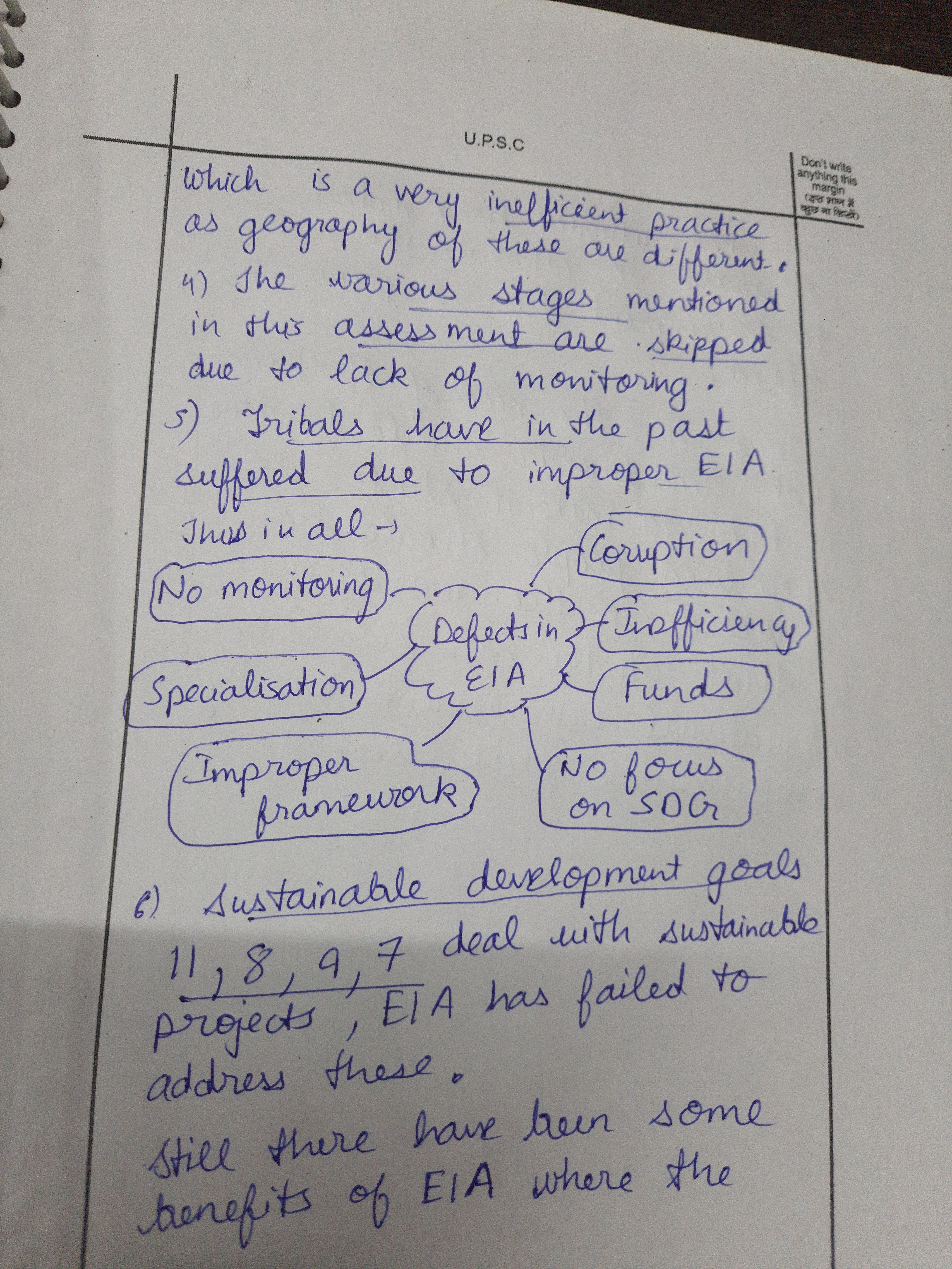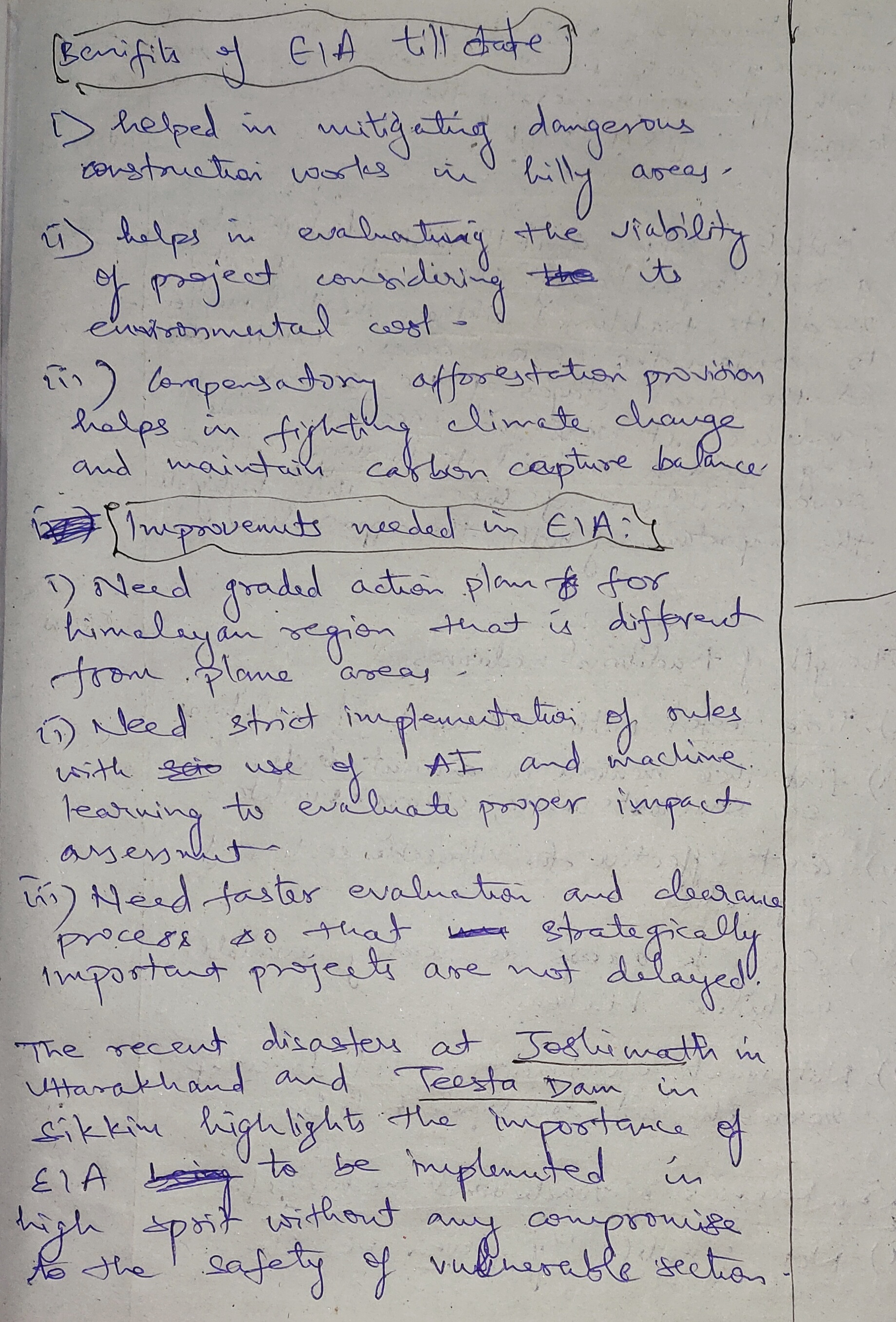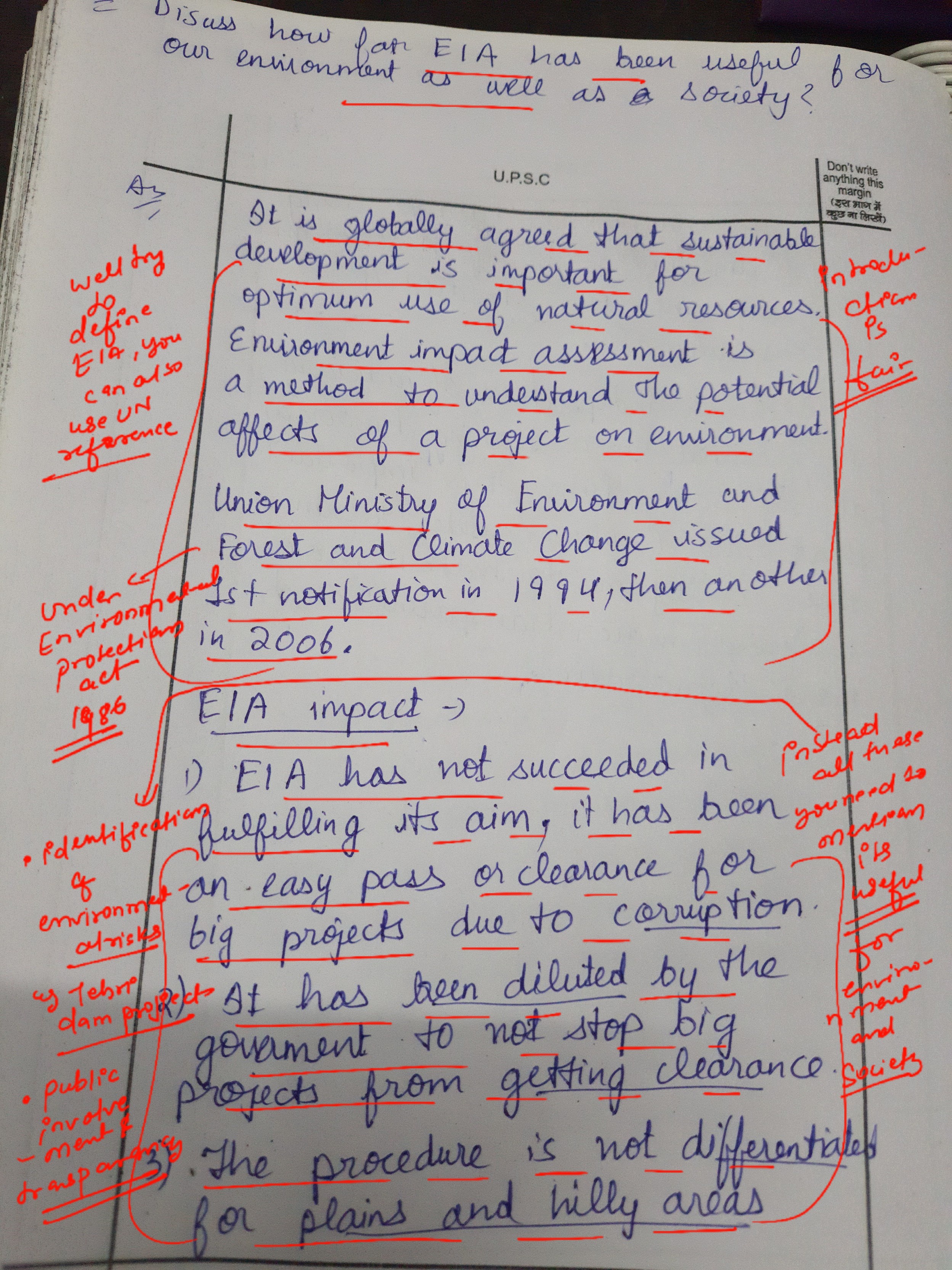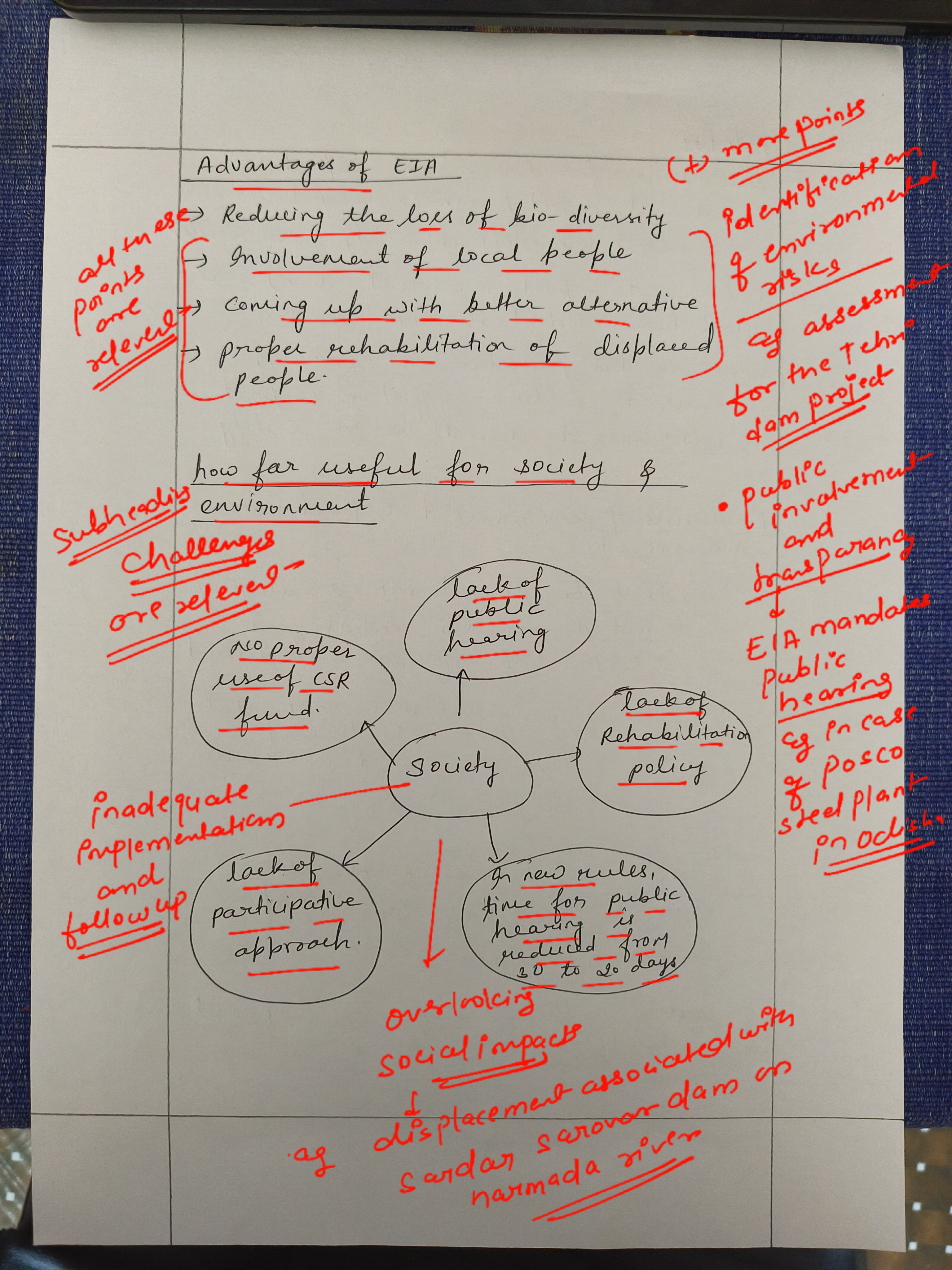 - Address the criticism of EIA overlooking socio-economic impacts on communities, using instances like the Sardar Sarovar Dam.