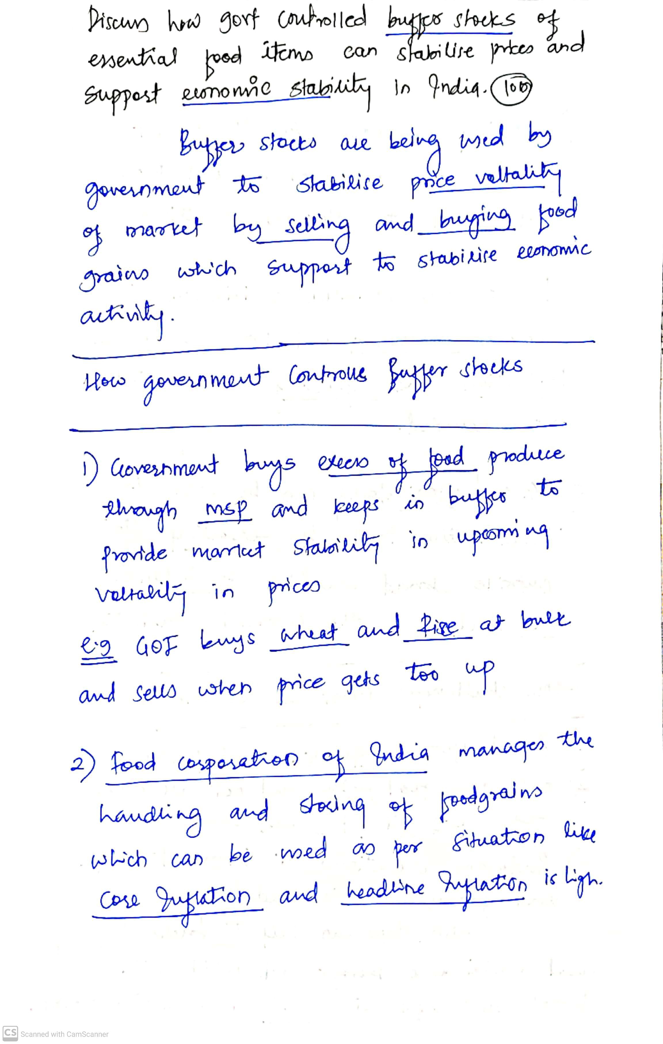 Q. Discuss how government-controlled buffer stocks of essential food items can stabilise prices and support economic stability in India. (10 Marks, 150 Words)