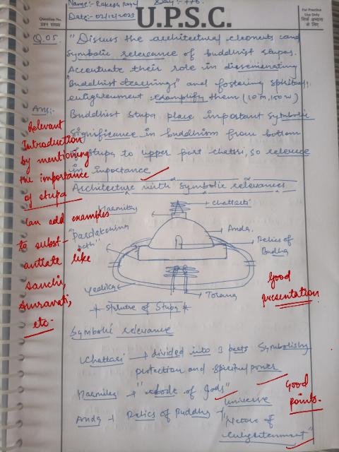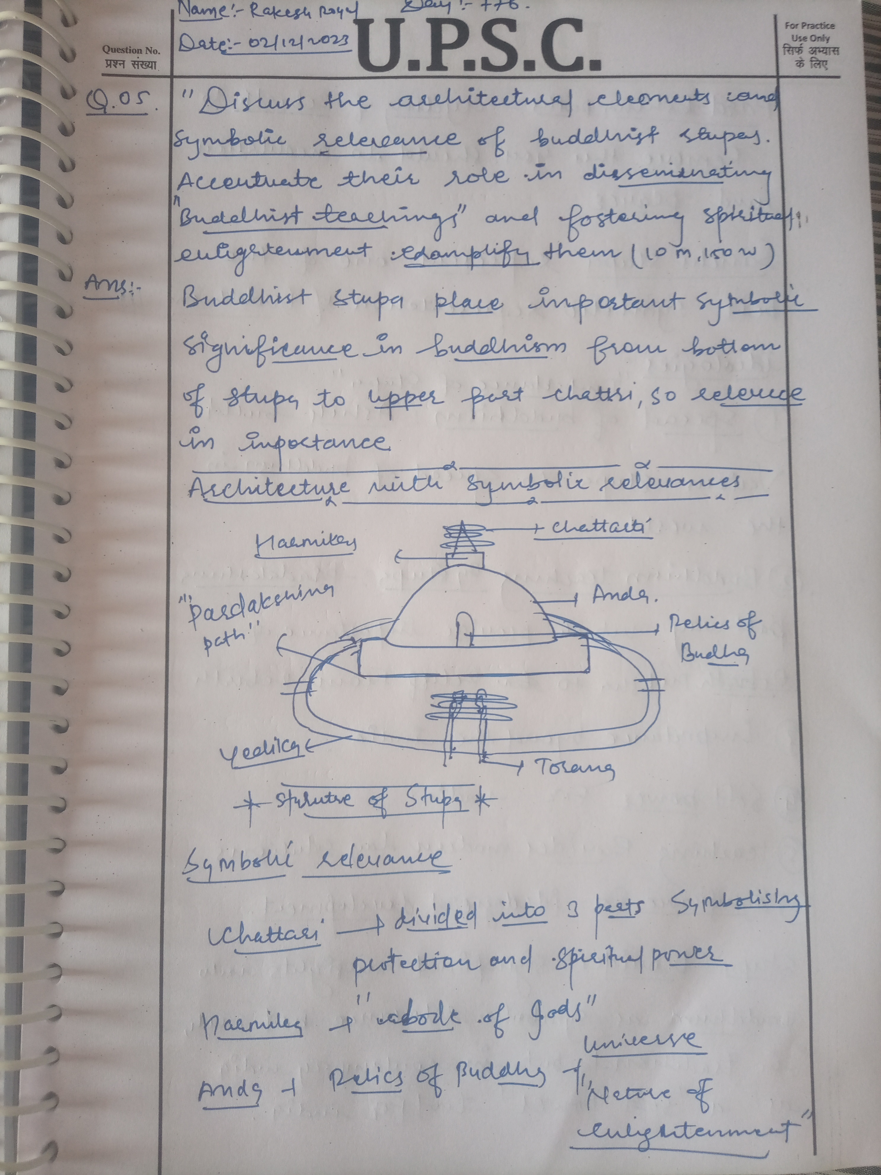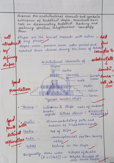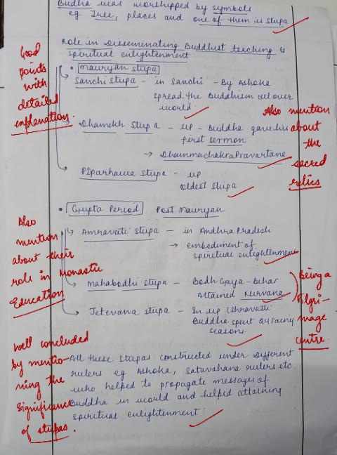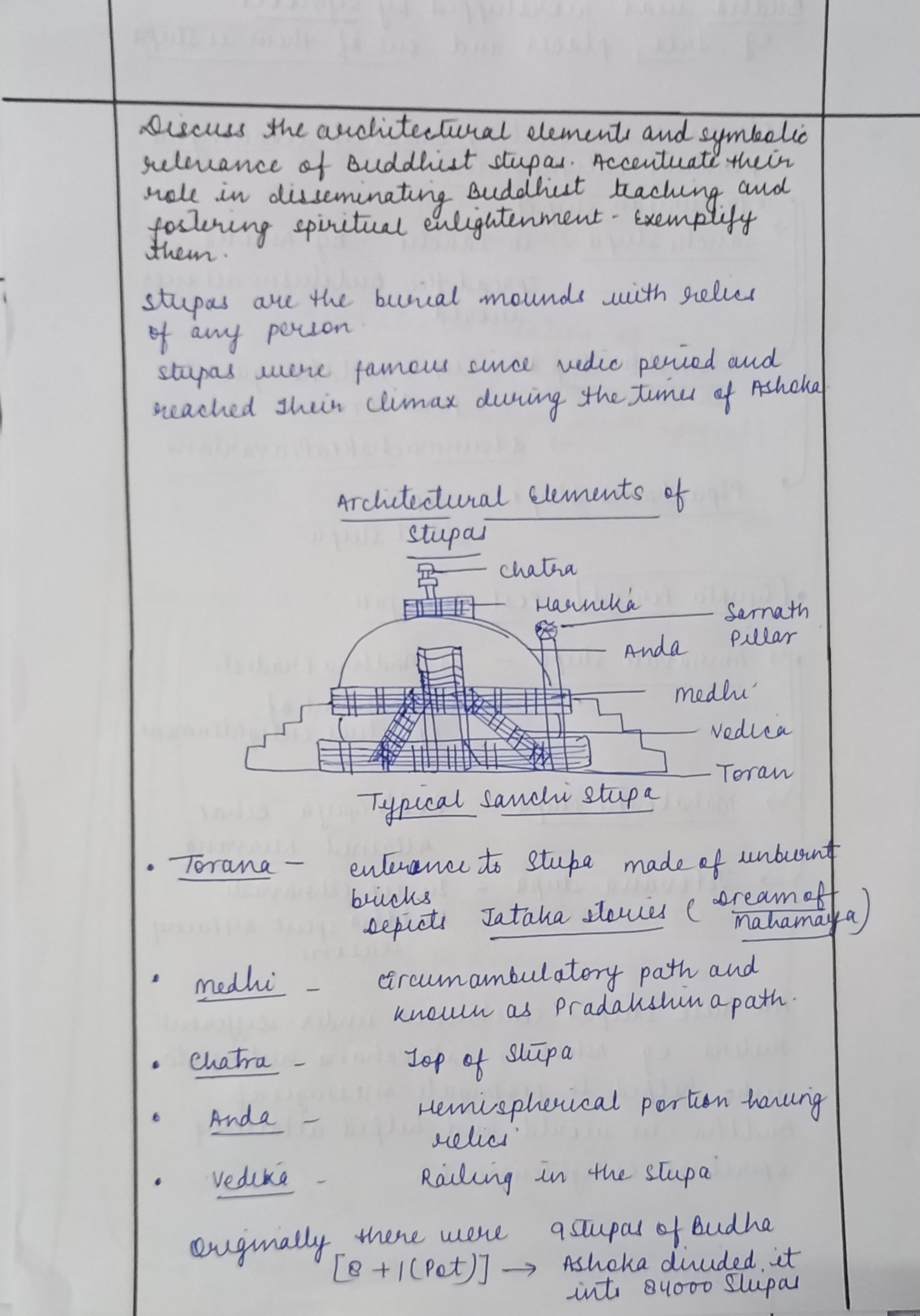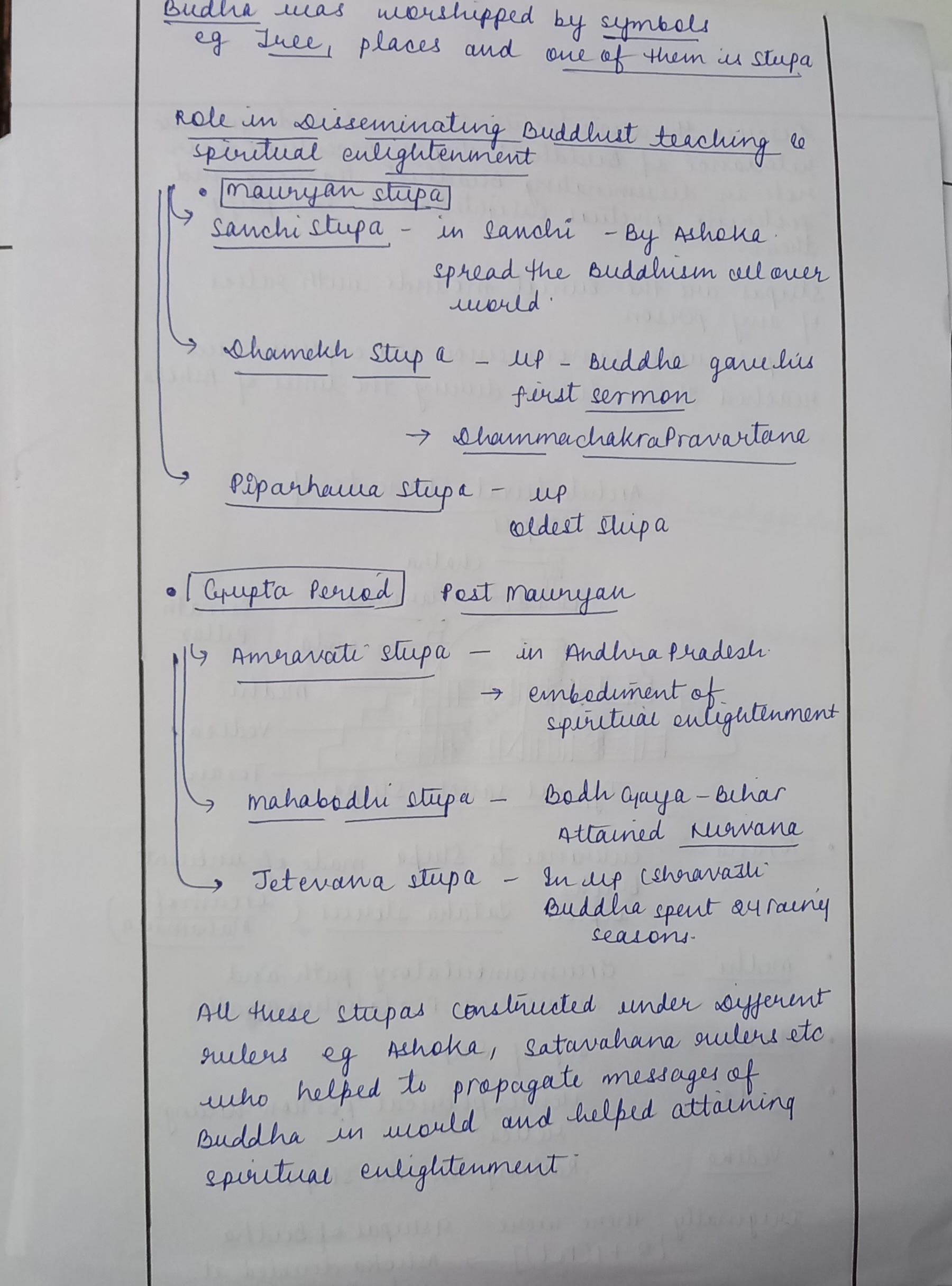 Buddhist stupas such as Sanchi, Amravati etc. are monumental structures that house relics (to venerate Buddhist saints) and represent the enlightened mind of the Buddha having distinct architectural elements and symbolic significance.