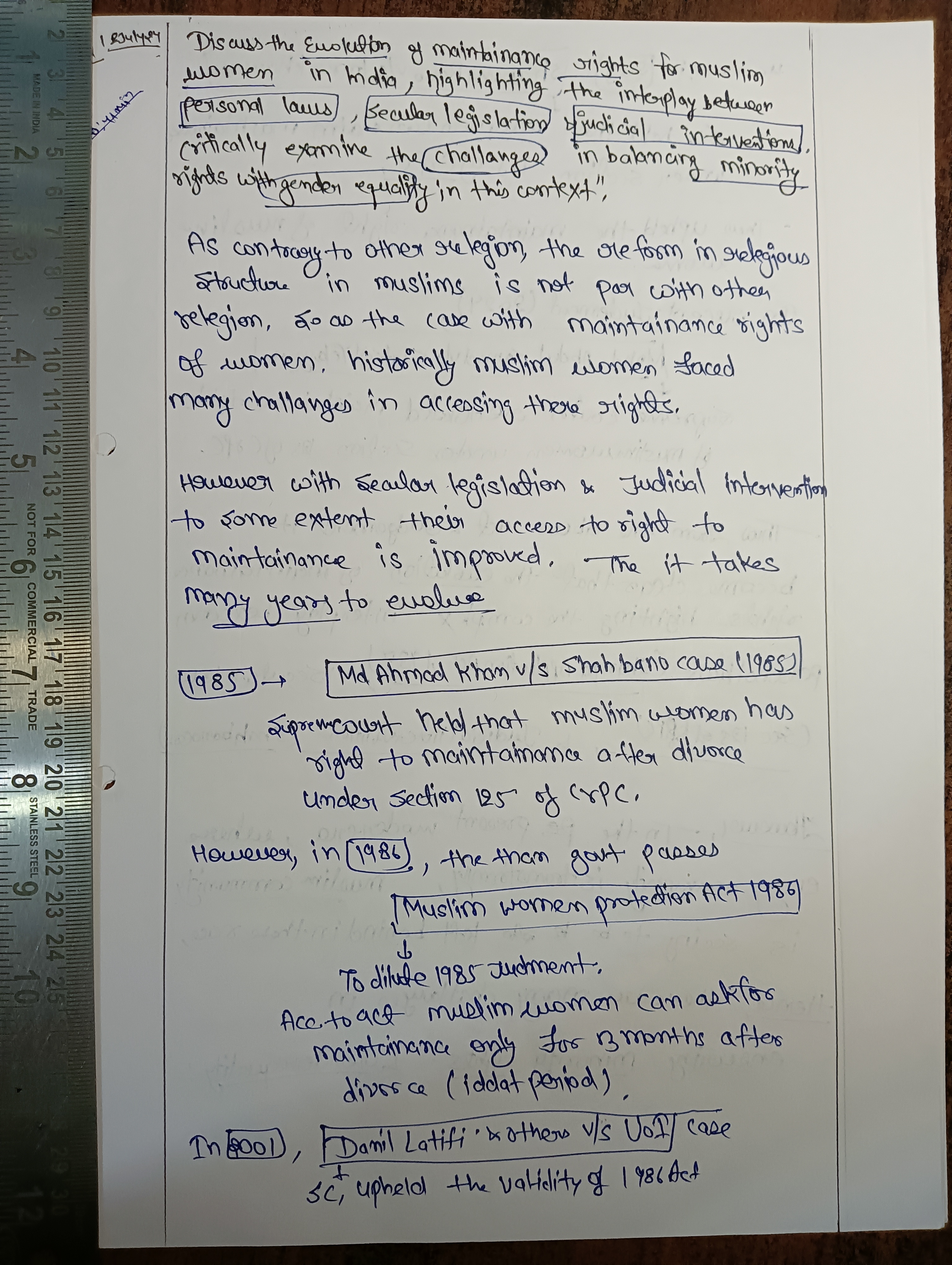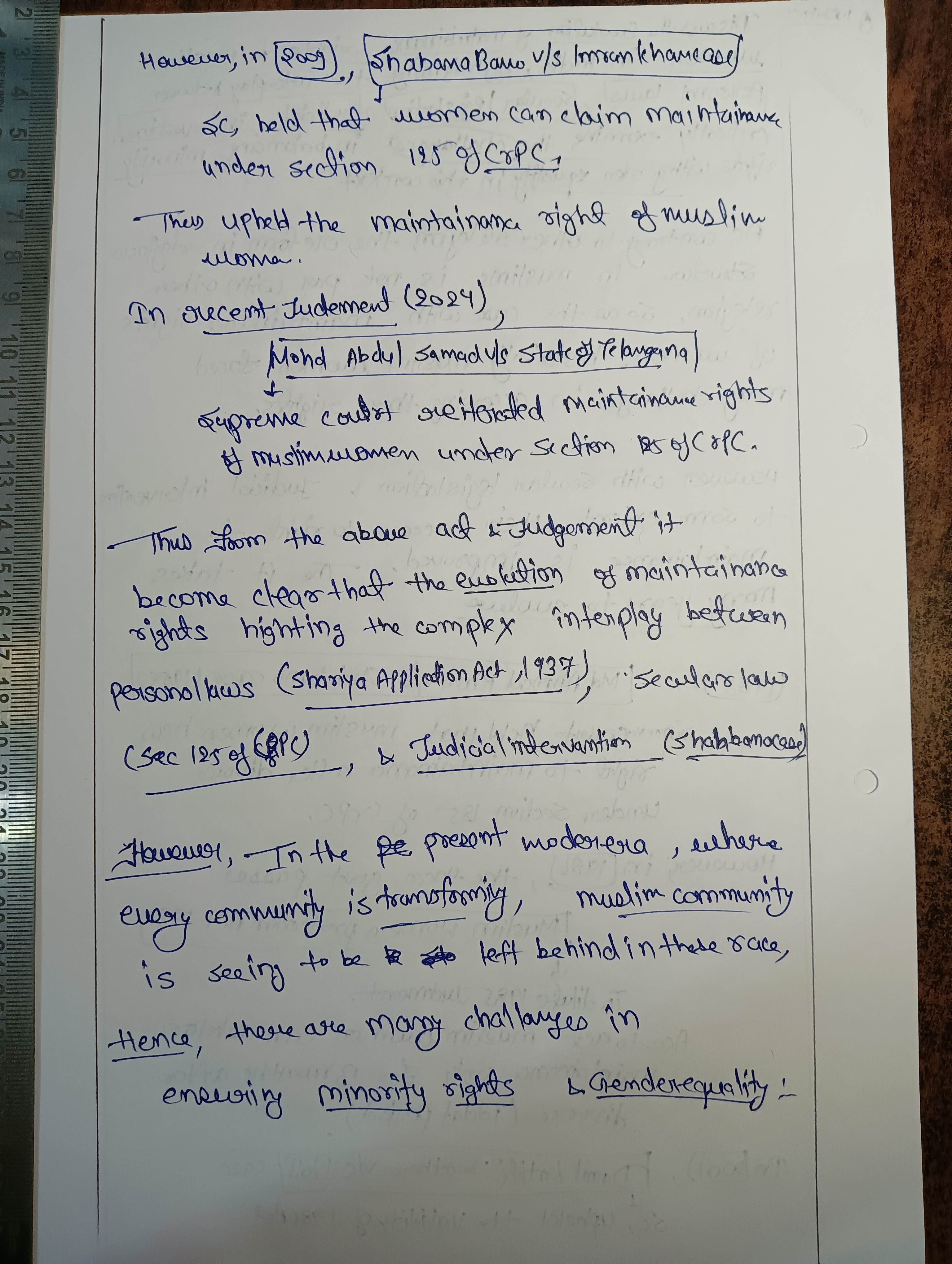 - Discuss the evolution of maintenance rights for Muslim women in India, highlighting the interplay between personal laws, secular legislation, and judicial interventions.