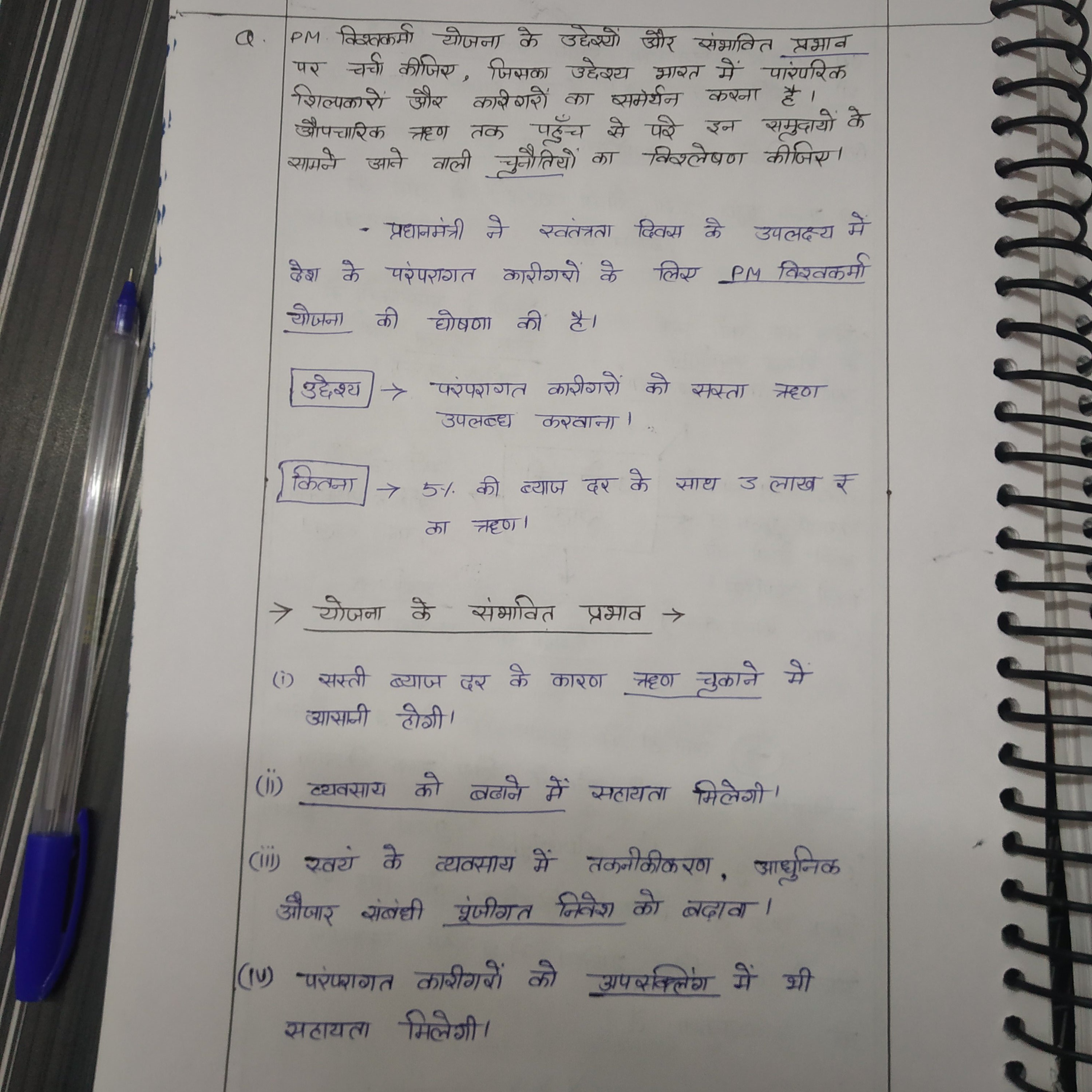 - परिचय: पारंपरिक शिल्प में भारत की समृद्ध सांस्कृतिक विरासत पर प्रकाश डालते हुए शुरुआत कीजिए। इसके अतिरिक्त कारीगरों को समर्थन देने के लिए एक सरकारी पहल के रूप में पीएम विश्वकर्मा योजना के बारे में बताइए।