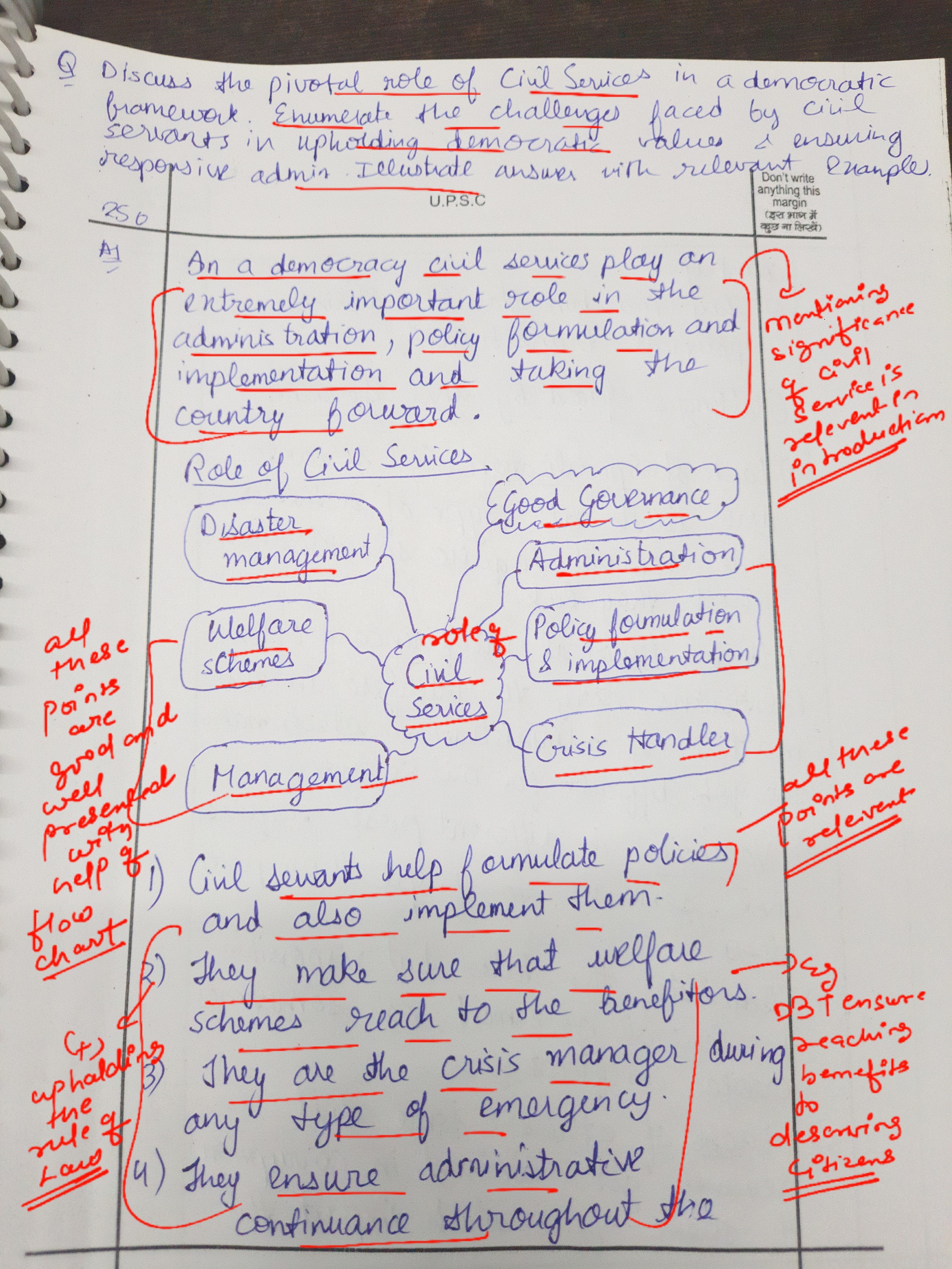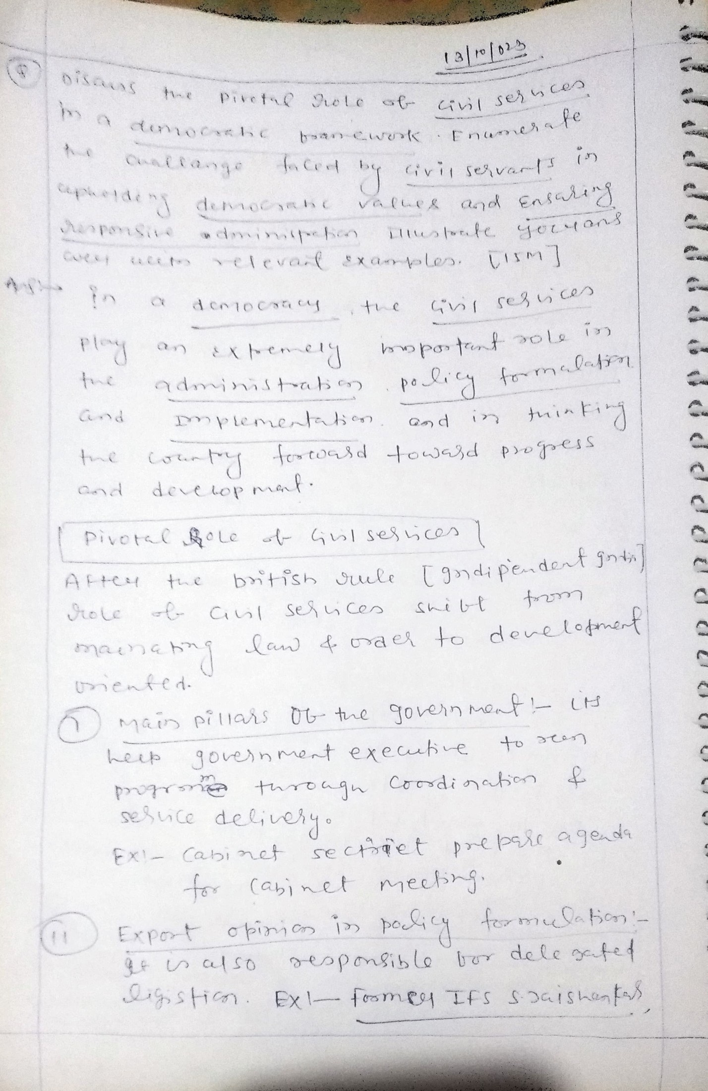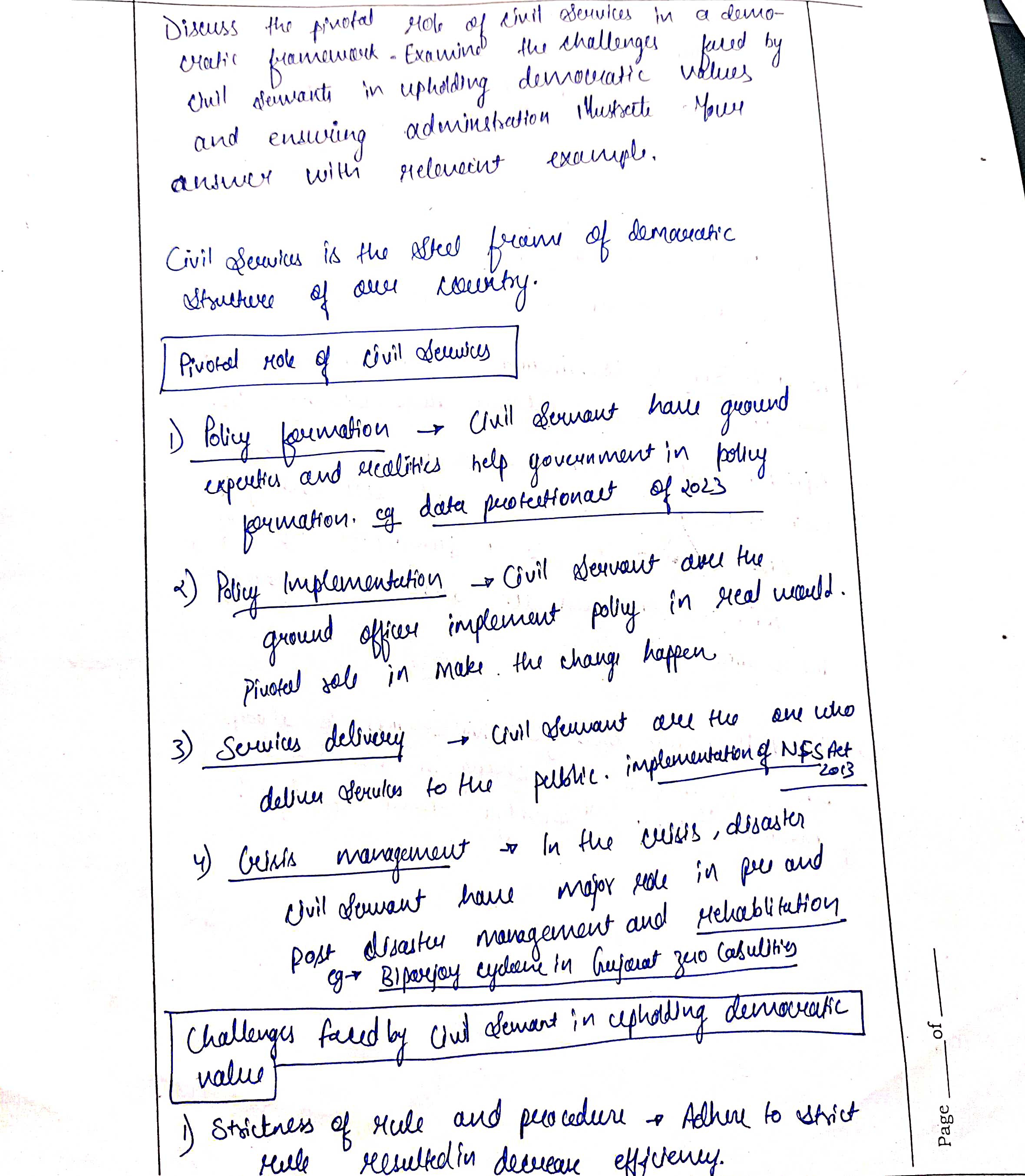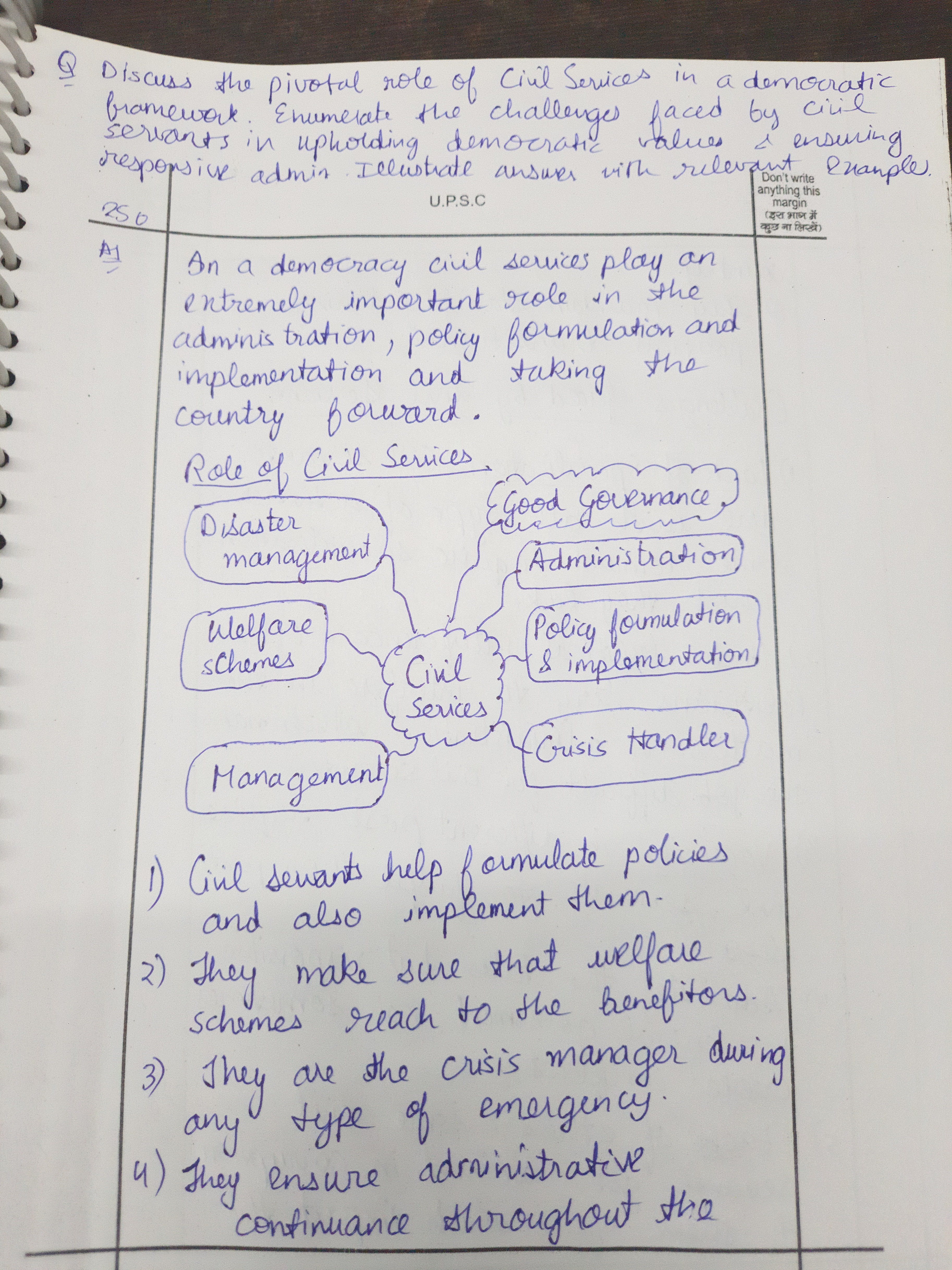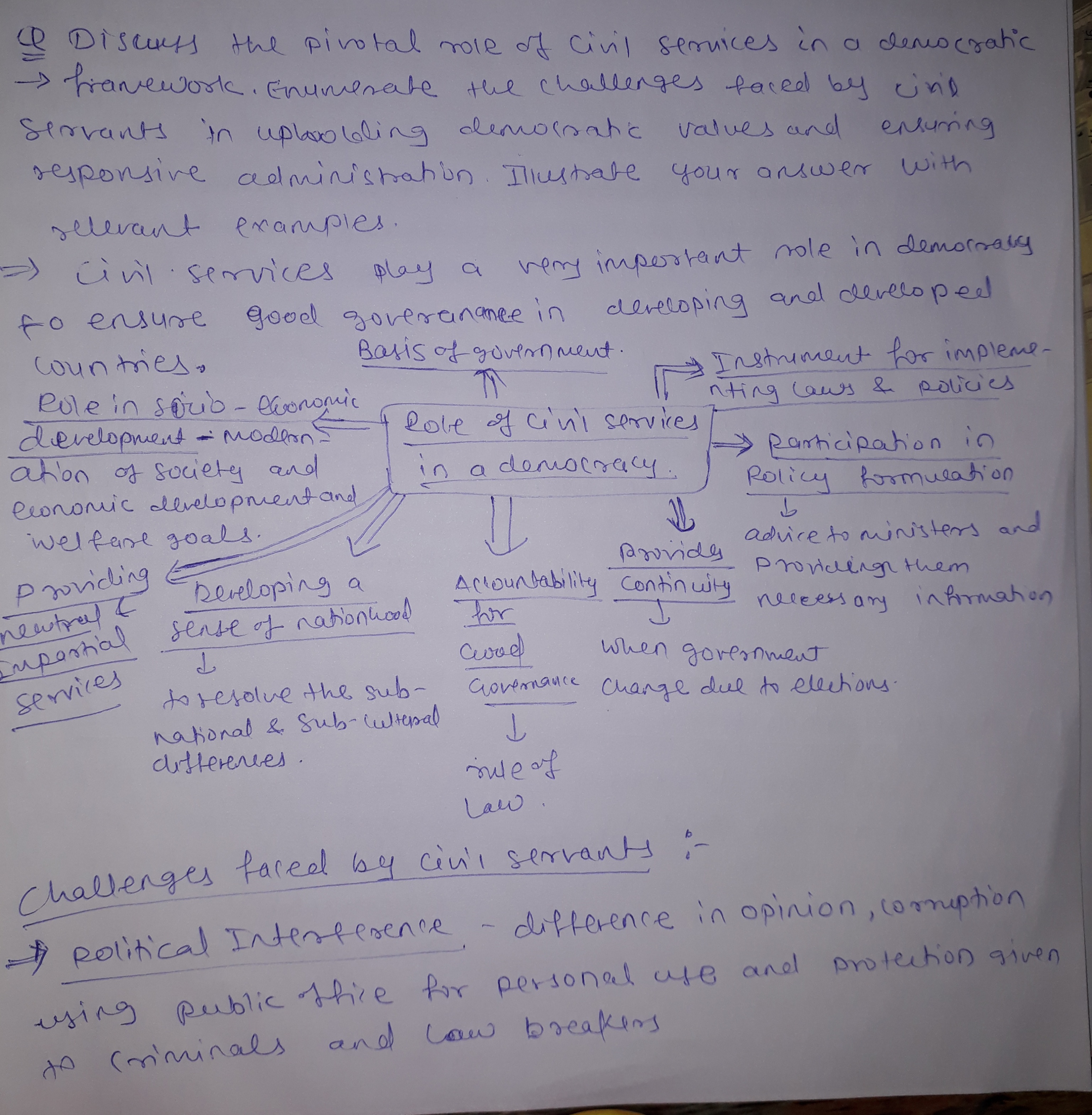Q. Discuss the pivotal role of civil services in a democratic framework. Enumerate the challenges faced by civil servants in upholding democratic values and ensuring responsive administration. Illustrate your answer with relevant examples (250 words, 15 Marks)