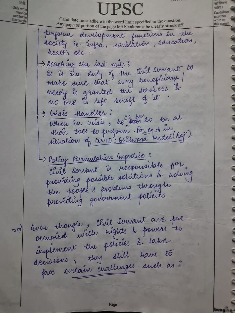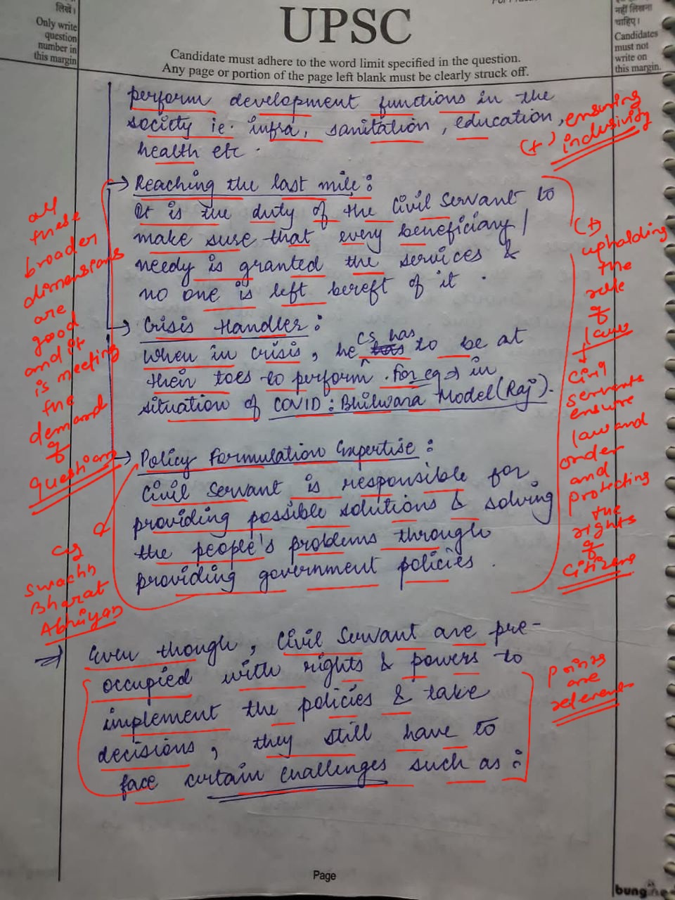 • Elaborate on key functions of civil services in a democratic setup, such as policy formulation, upholding the rule of law, and ensuring inclusivity. Use relevant examples to illustrate each point.
