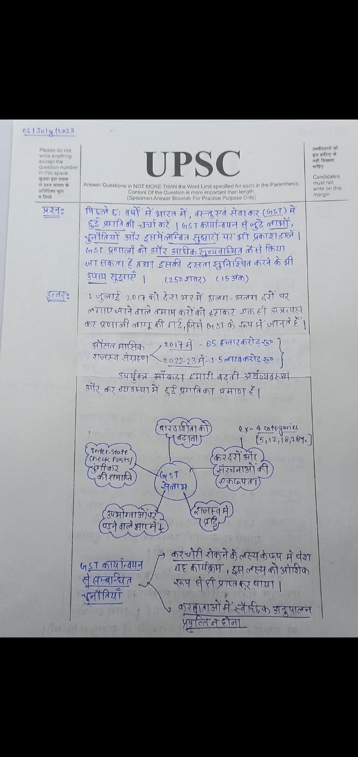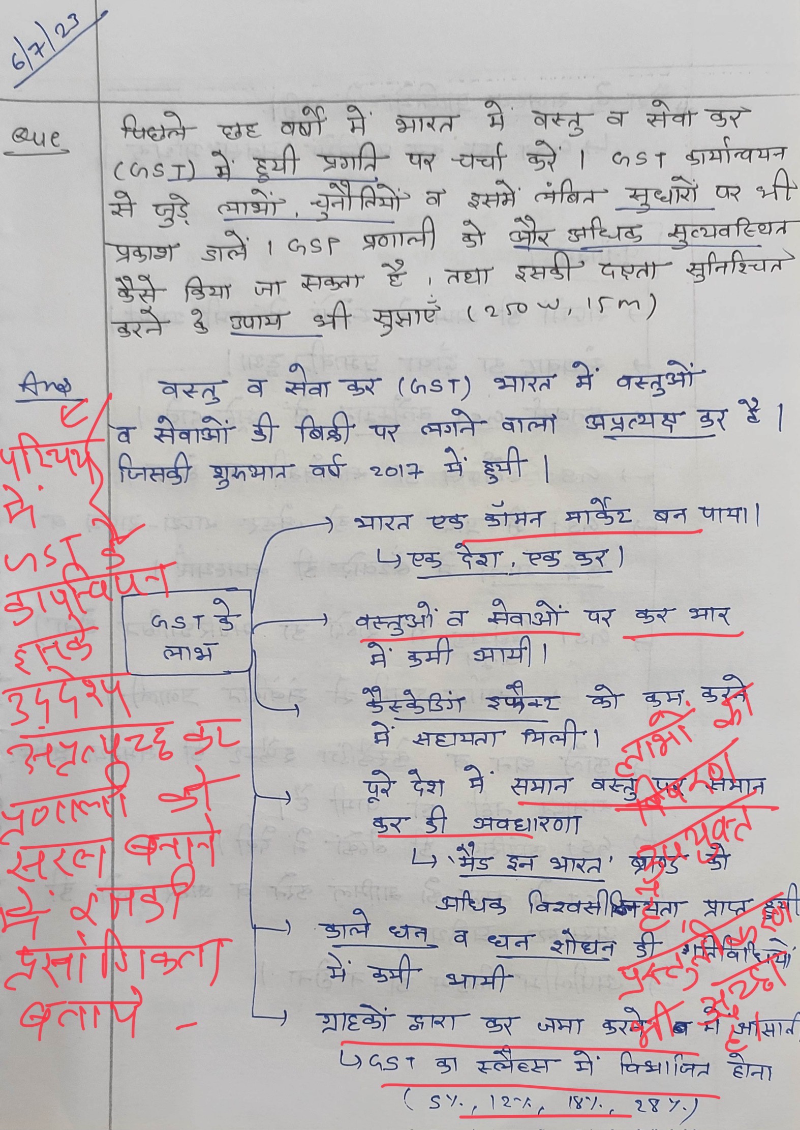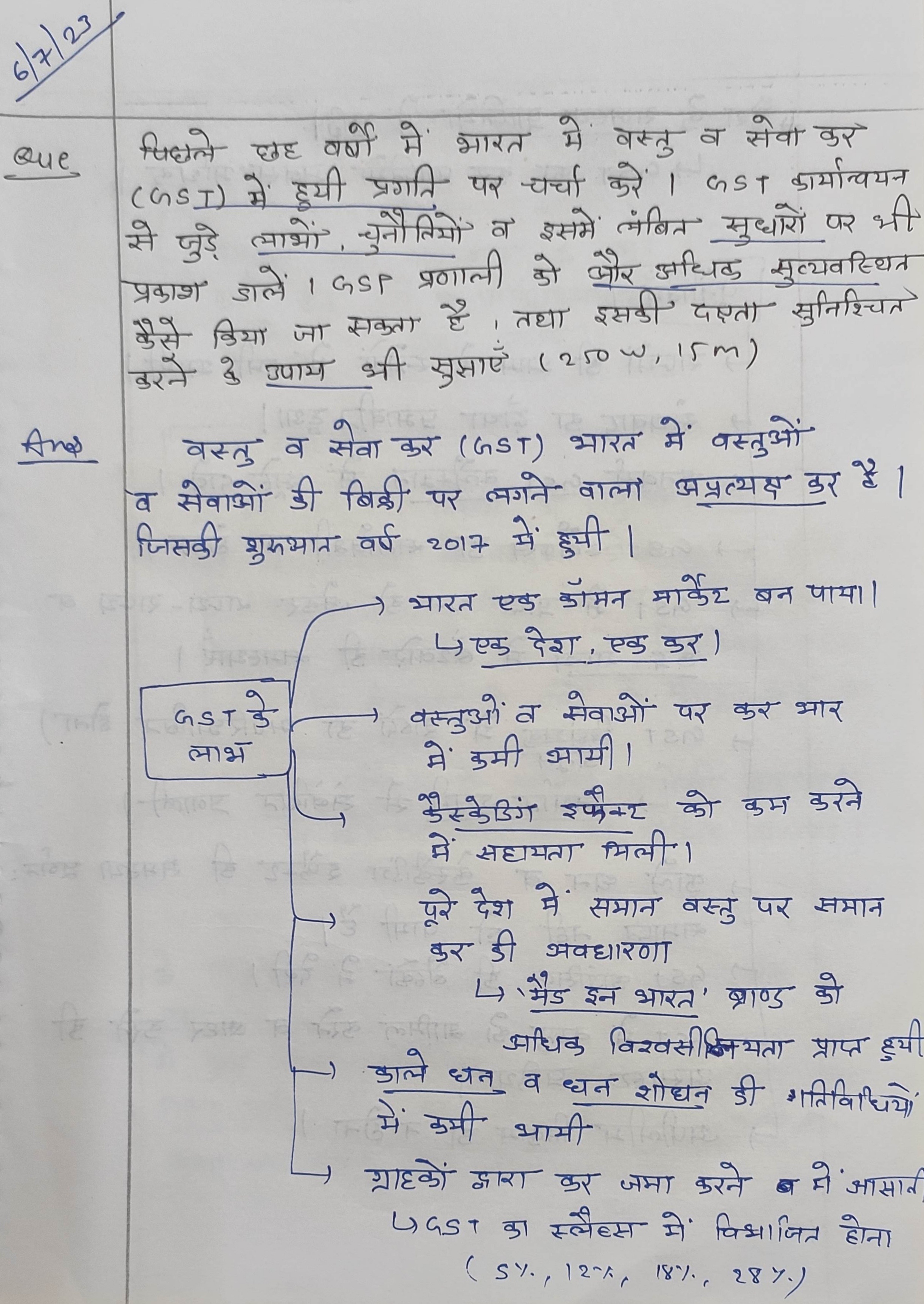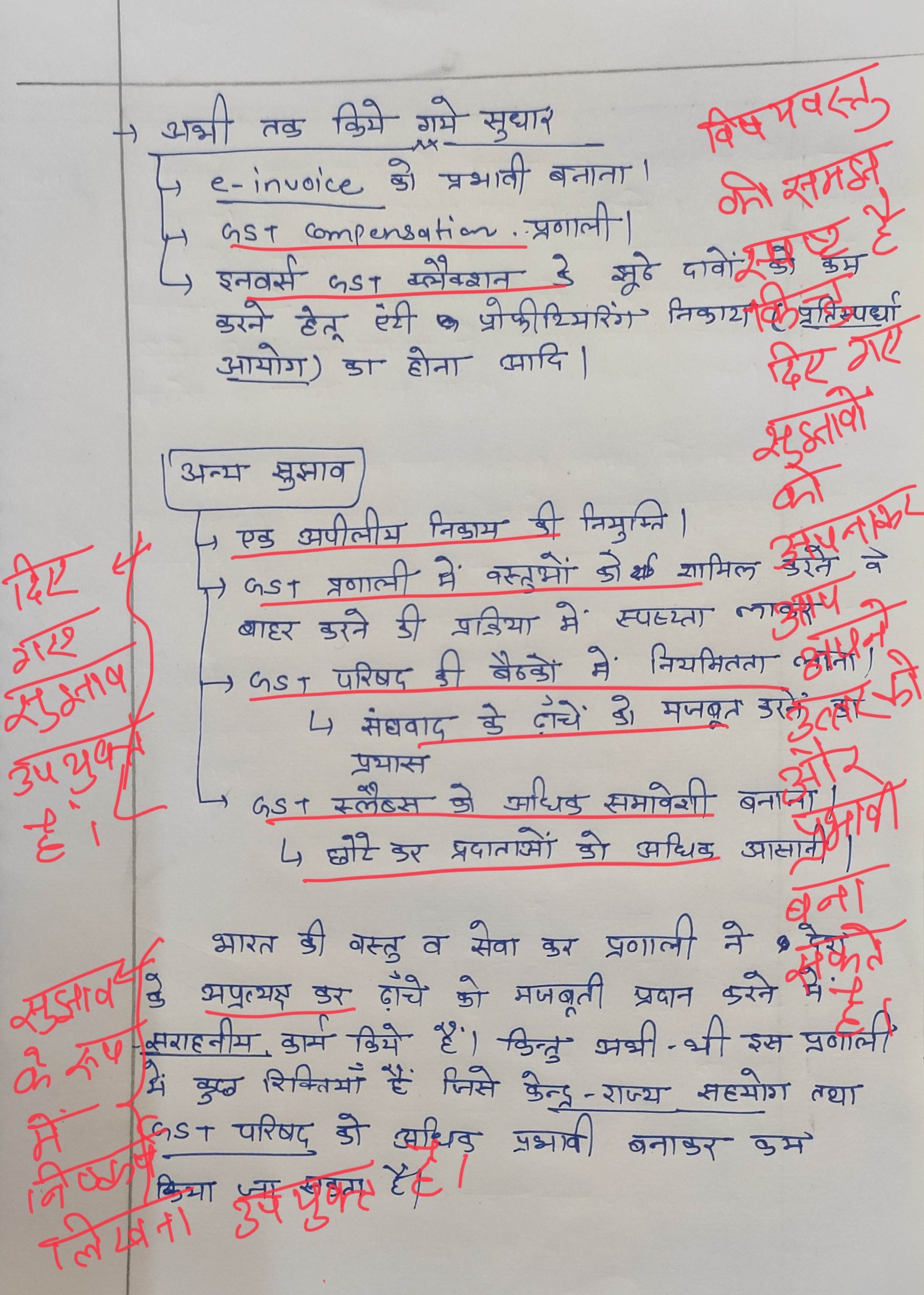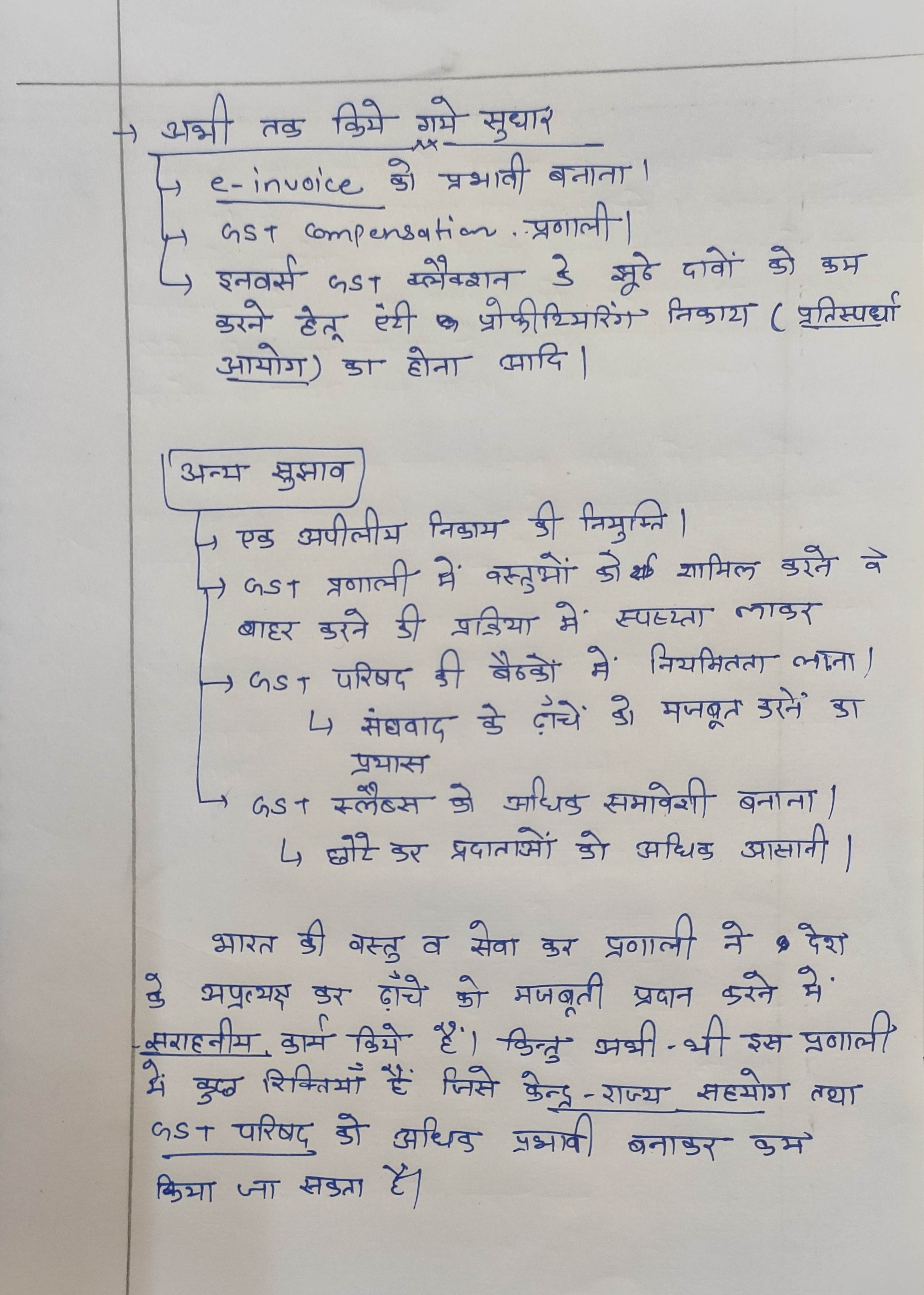 - निष्कर्ष: पिछले छह वर्षों में जीएसटी की प्रगति का सारांश देते हुए, इसके लाभों, चुनौतियों और आगे के सुधारों की आवश्यकता बताते हुए निष्कर्ष लिखें।