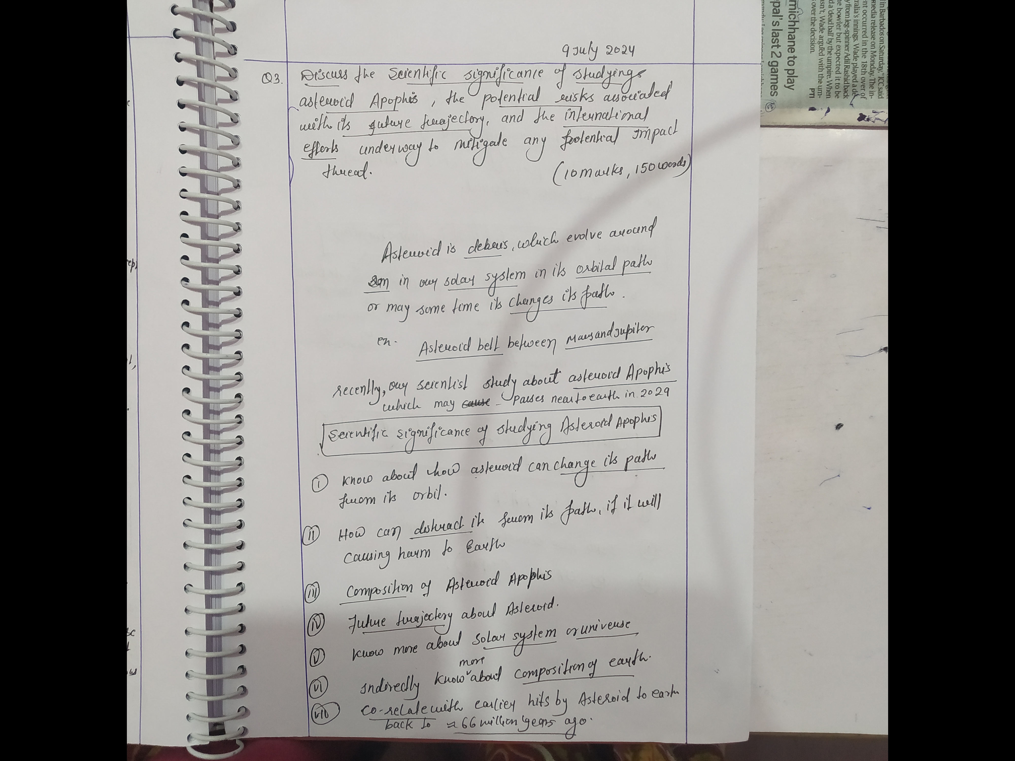 Q. Discuss the scientific significance of studying asteroid Apophis, the potential risks associated with its future trajectory, and the international efforts underway to mitigate any potential impact threat. (10 Marks, 150 words)