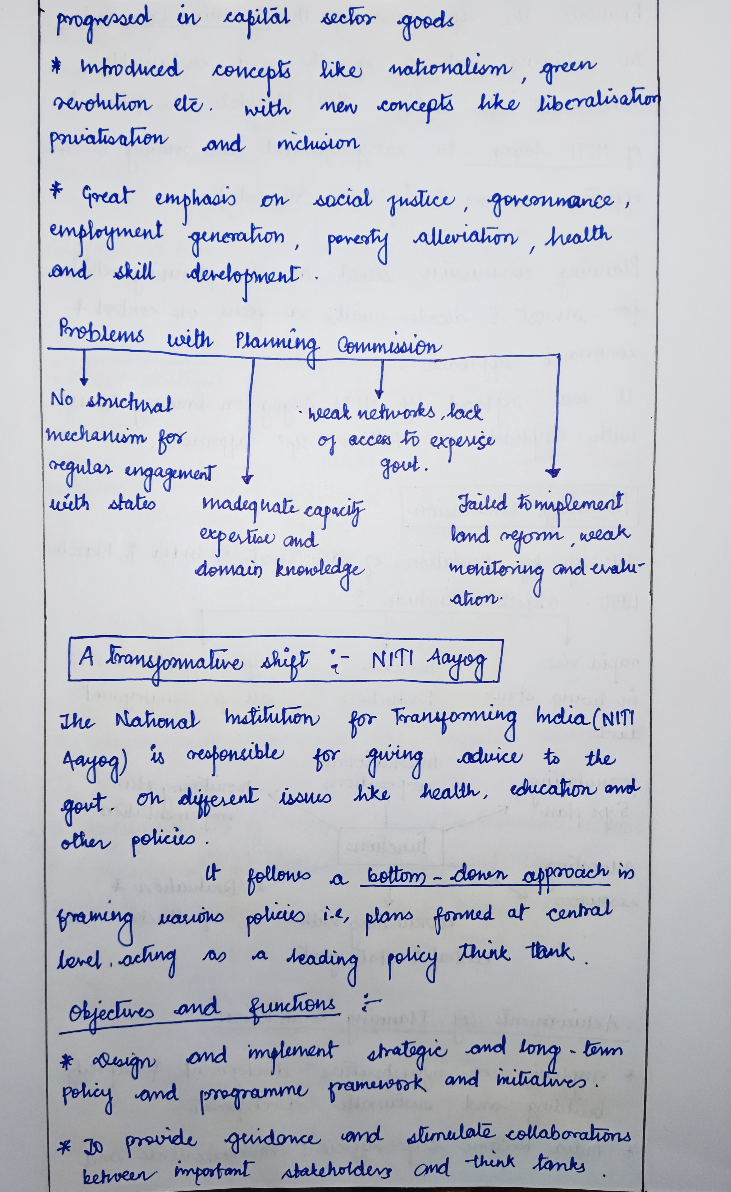 After India’s independence in 1947, the Planning Commission was established to tackle post- independence challenges related to economic development, poverty alleviation, and equitable growth. However, the changing needs of India’s economic progress necessitated a more adaptive institution to address contemporary challenges, leading to the creation of NITI Aayog in 2015, focusing on inclusive growth and sustainable development in a dynamic manner.