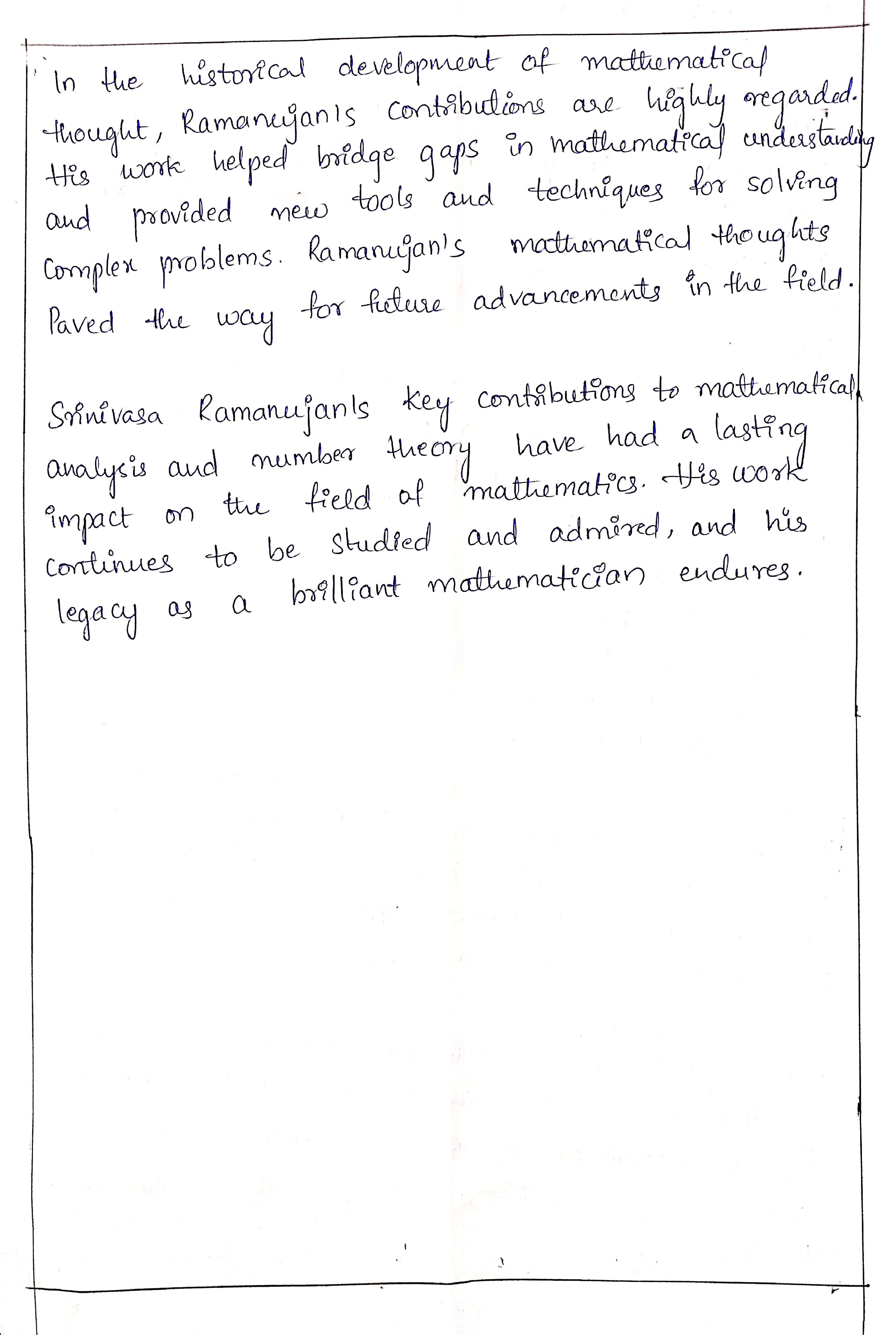 Srinivasa Ramanujan’s contributions to mathematical analysis and number theory are monumental. His intuitive approach, coupled with rigorous mathematical insights, not only advanced the field of mathematics but also paved the way for future generations of mathematicians. His legacy transcends time, continuing to inspire and challenge the mathematical community. Ramanujan’s life and work epitomize the universal language of mathematics and its boundless potential, irrespective of one’s formal training and origin.