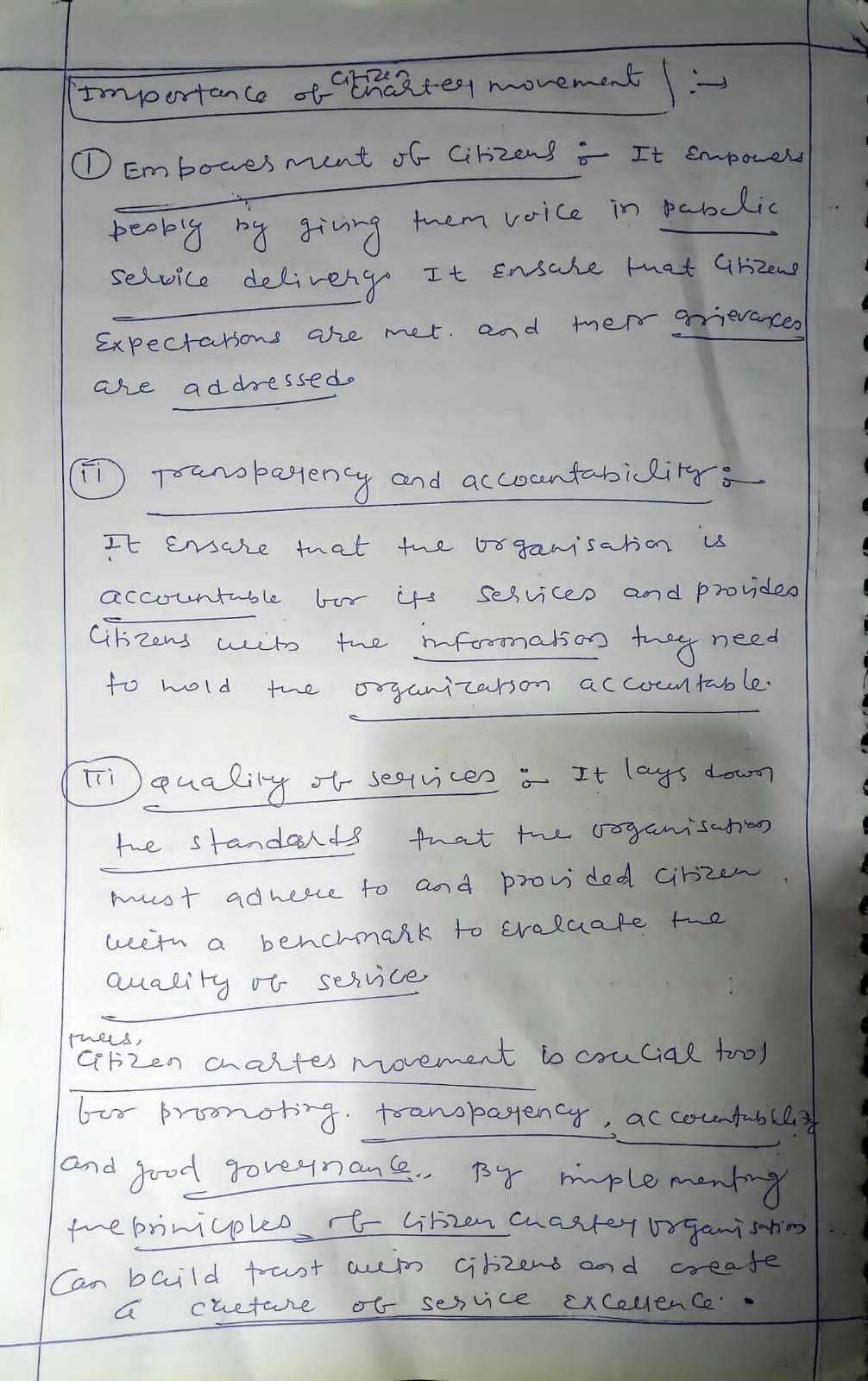 The Citizens’ Charter movement has gained significant importance in recent years as it provides a framework for improving public service delivery, enhancing citizen participation and accountability, and promoting good governance. It is an essential tool for promoting transparency, accountability, and citizen participation in public service delivery and improving the quality of life for citizens.