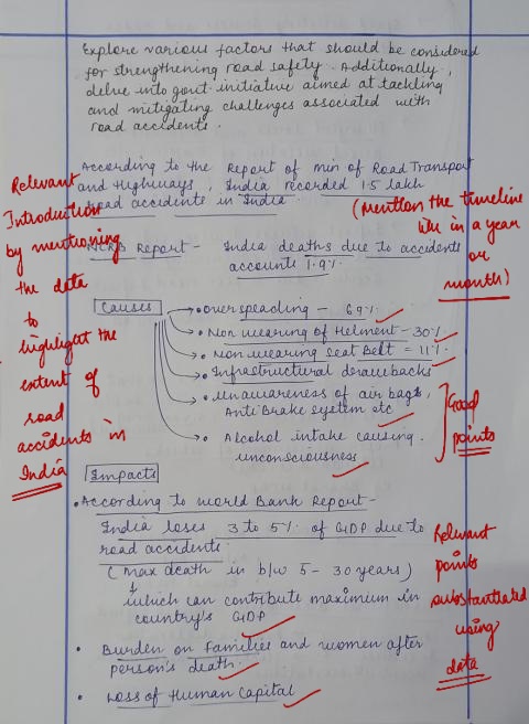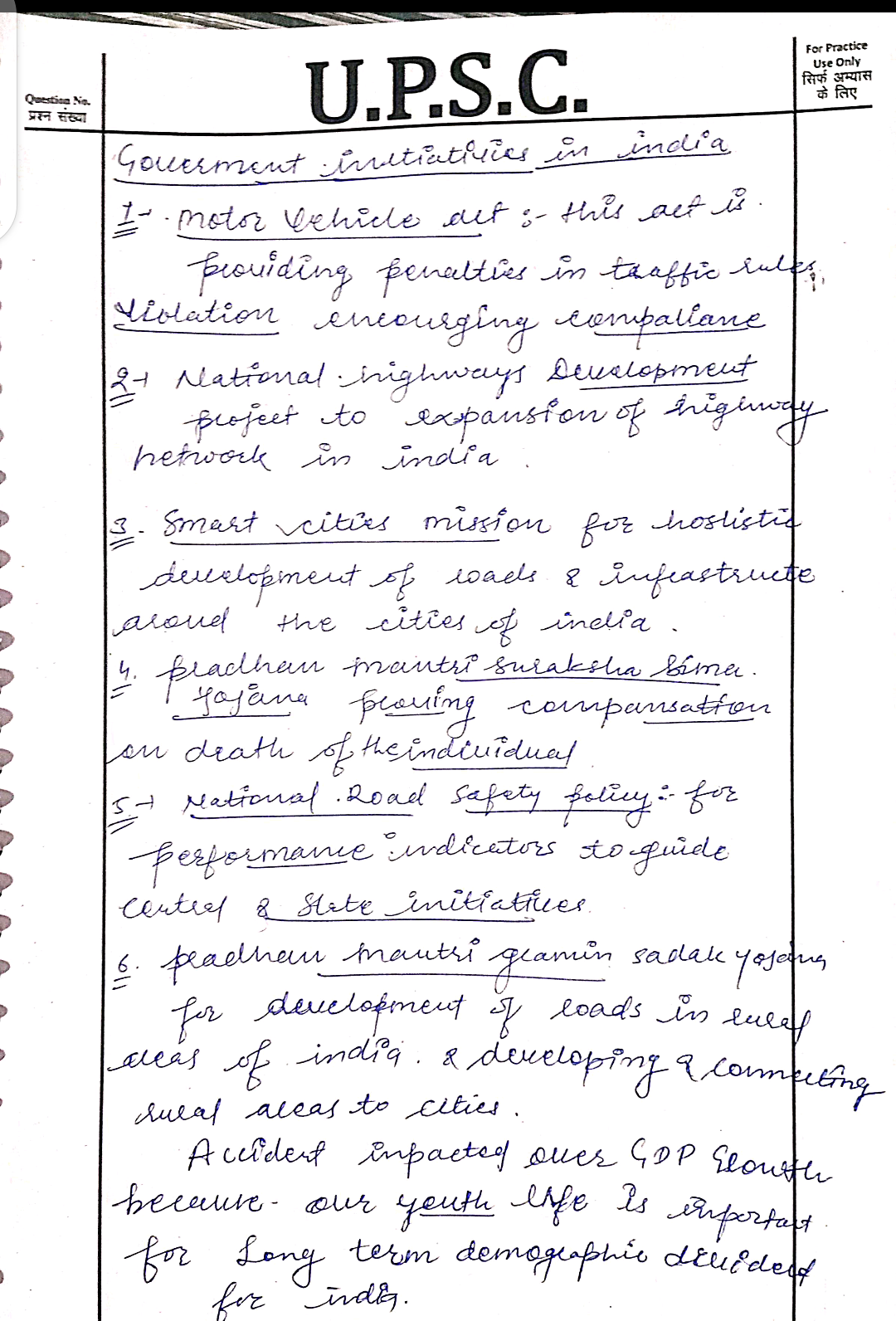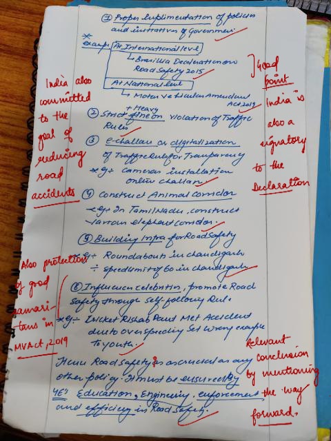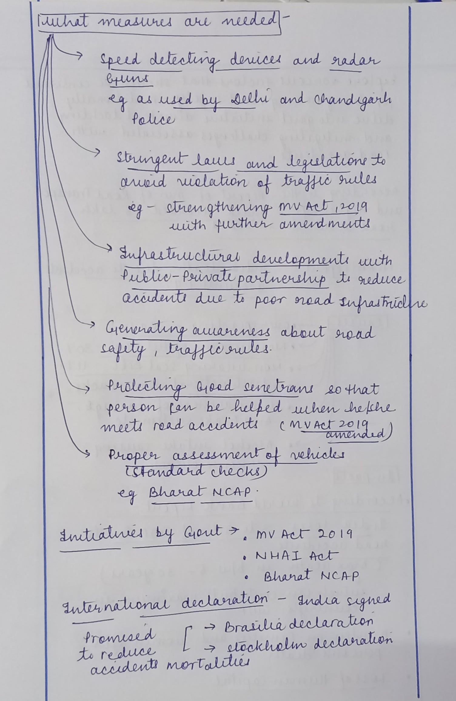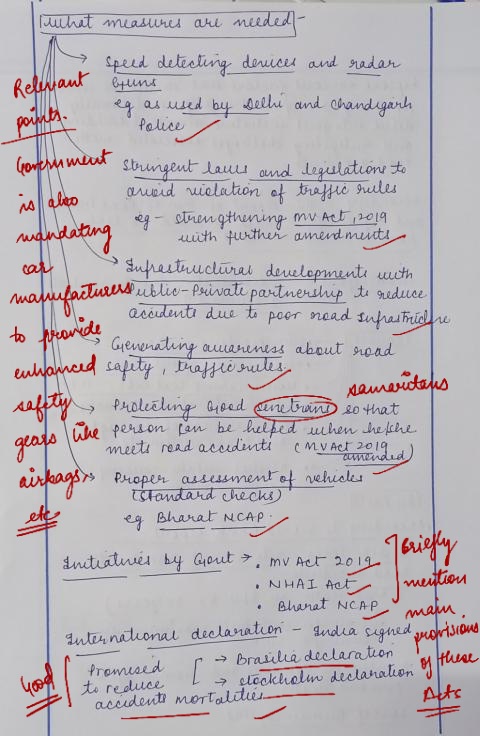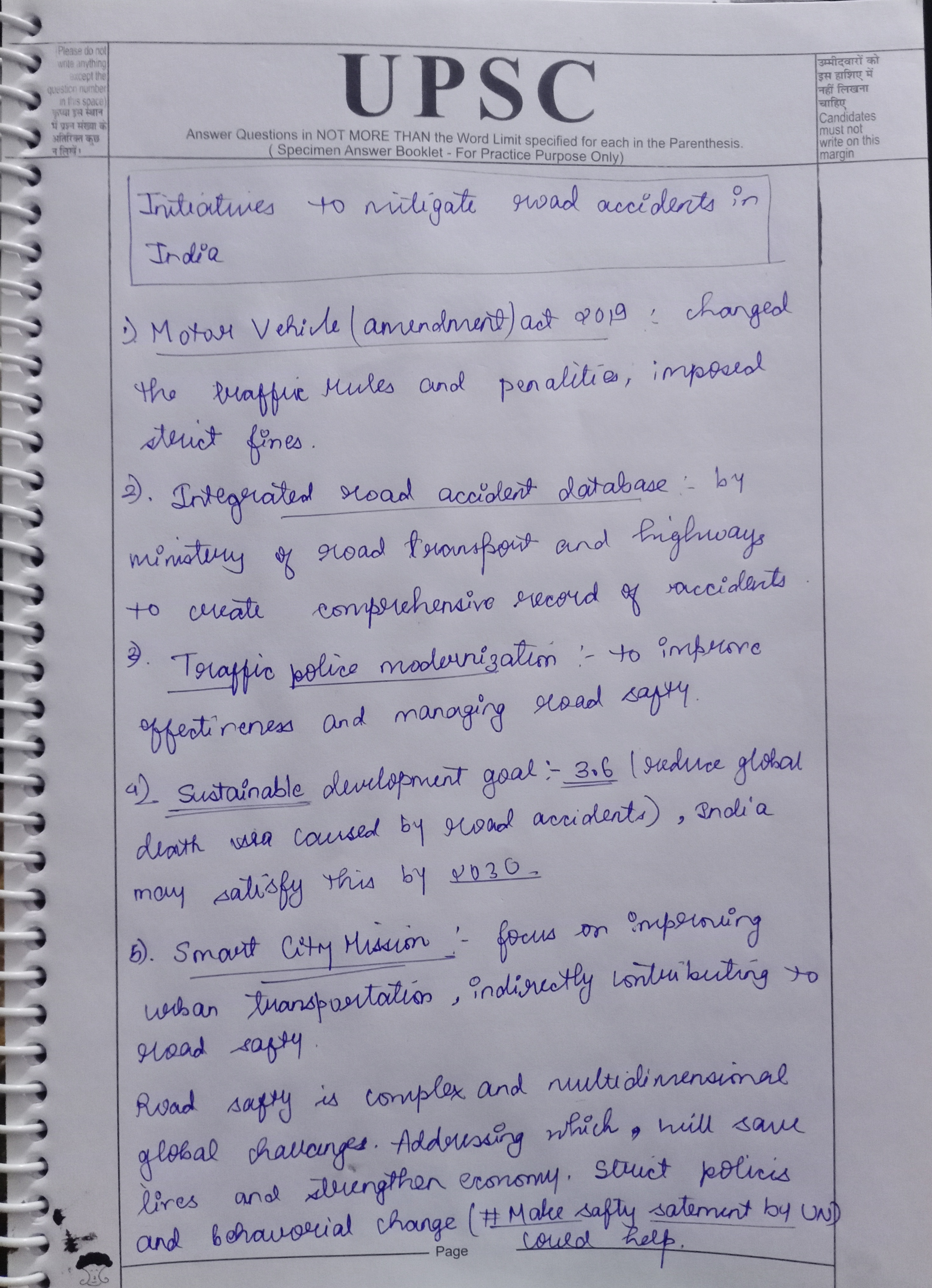 - Describe key initiatives such as the National Road Safety Policy, the Motor Vehicles (Amendment) Act, 2019, NHAI’s traffic management and safety audits, the ‘Sadak Suraksha – Jeevan Raksha’ campaign, Smart City Projects incorporating traffic management, and collaborations with NGOs and corporates for road safety awareness.