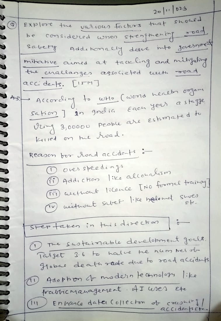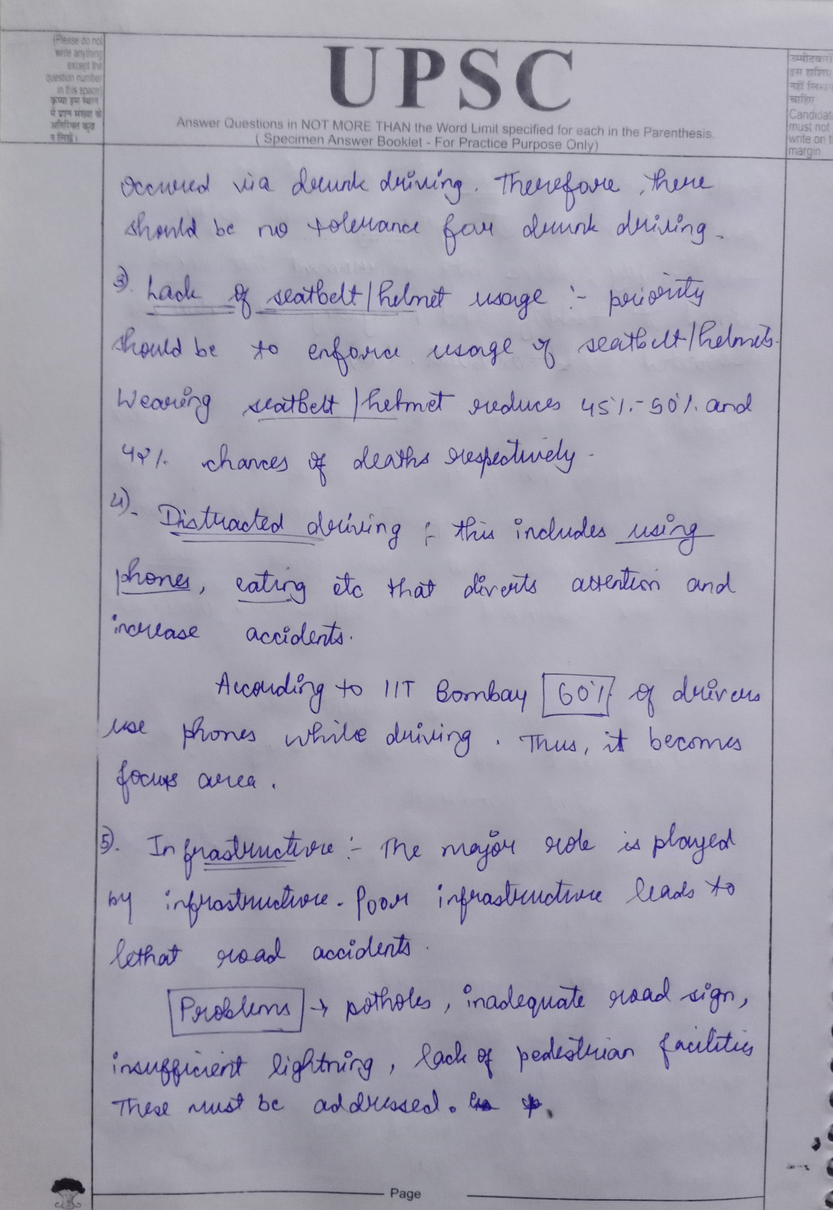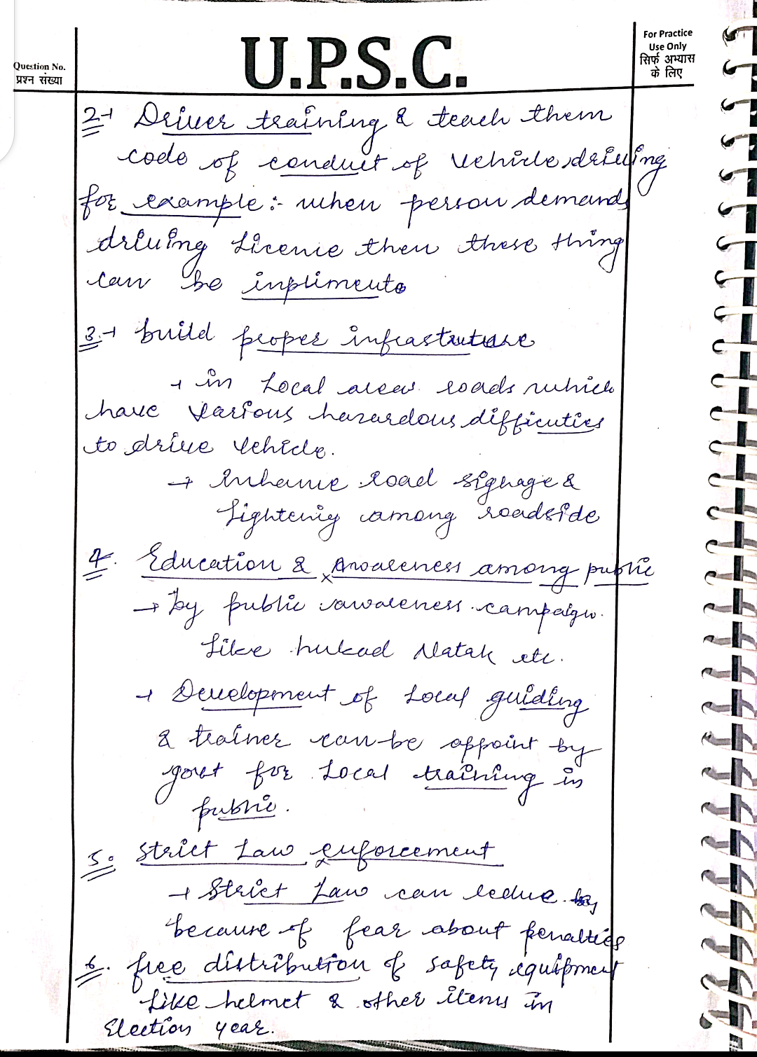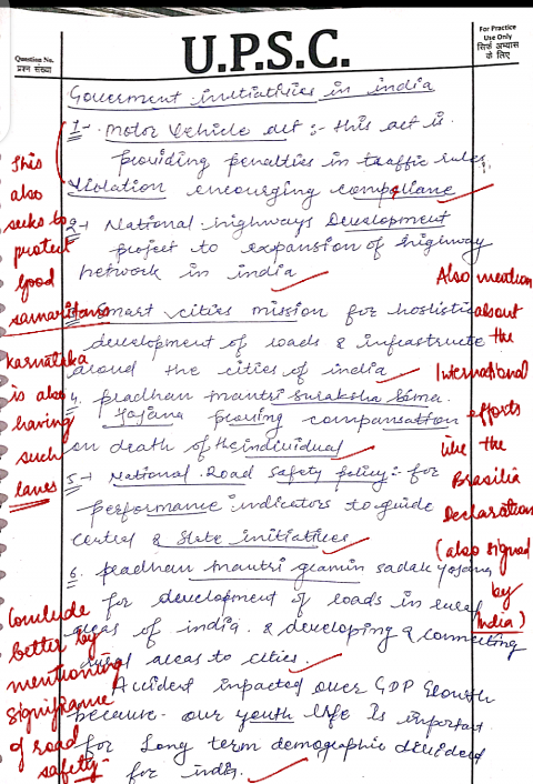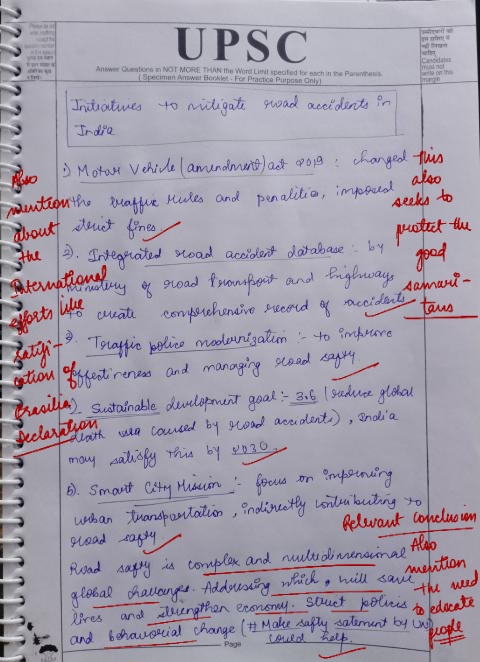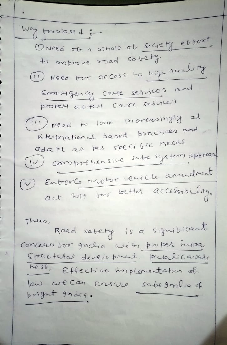- Describe key initiatives such as the National Road Safety Policy, the Motor Vehicles (Amendment) Act, 2019, NHAI’s traffic management and safety audits, the ‘Sadak Suraksha – Jeevan Raksha’ campaign, Smart City Projects incorporating traffic management, and collaborations with NGOs and corporates for road safety awareness.