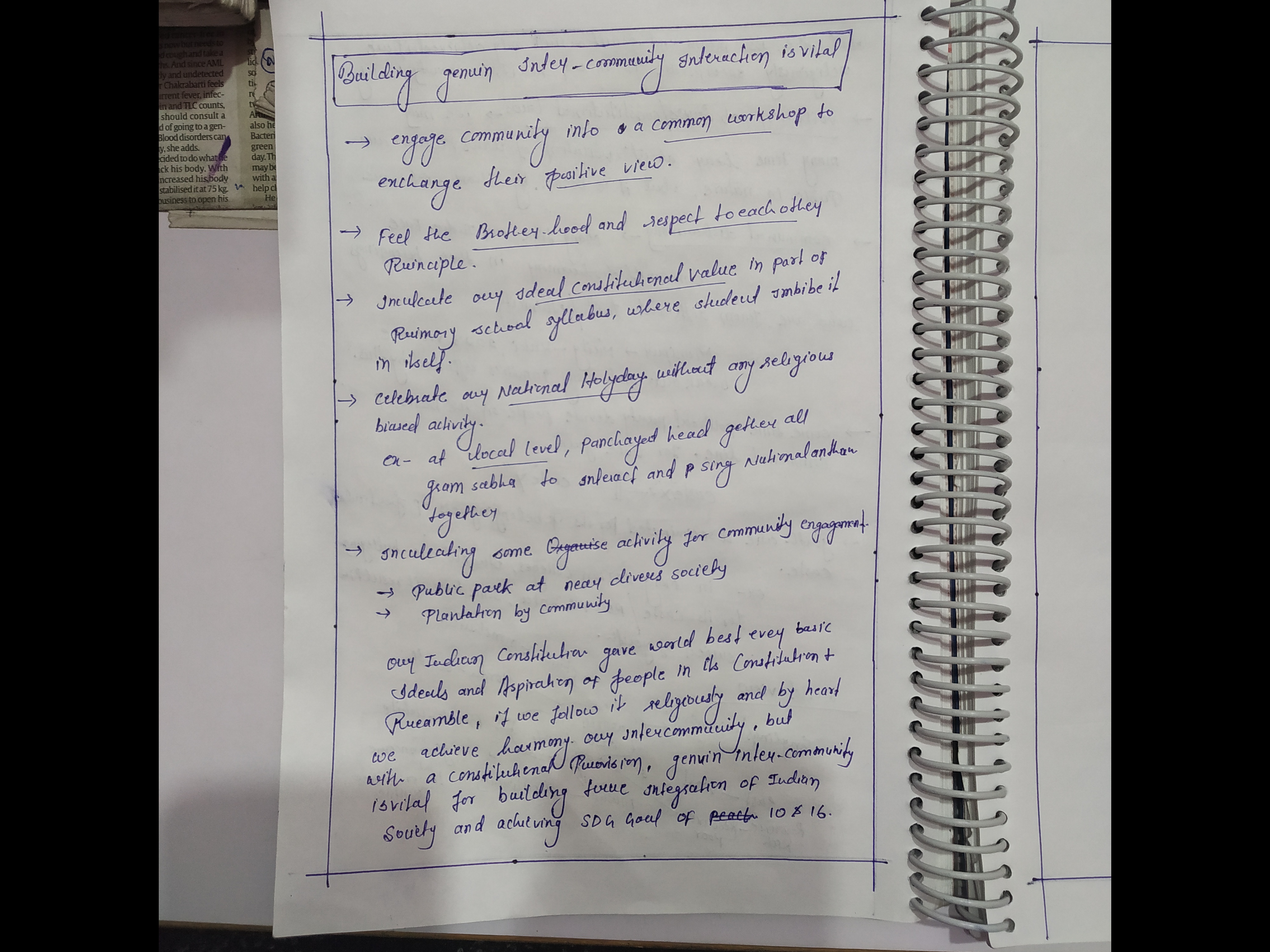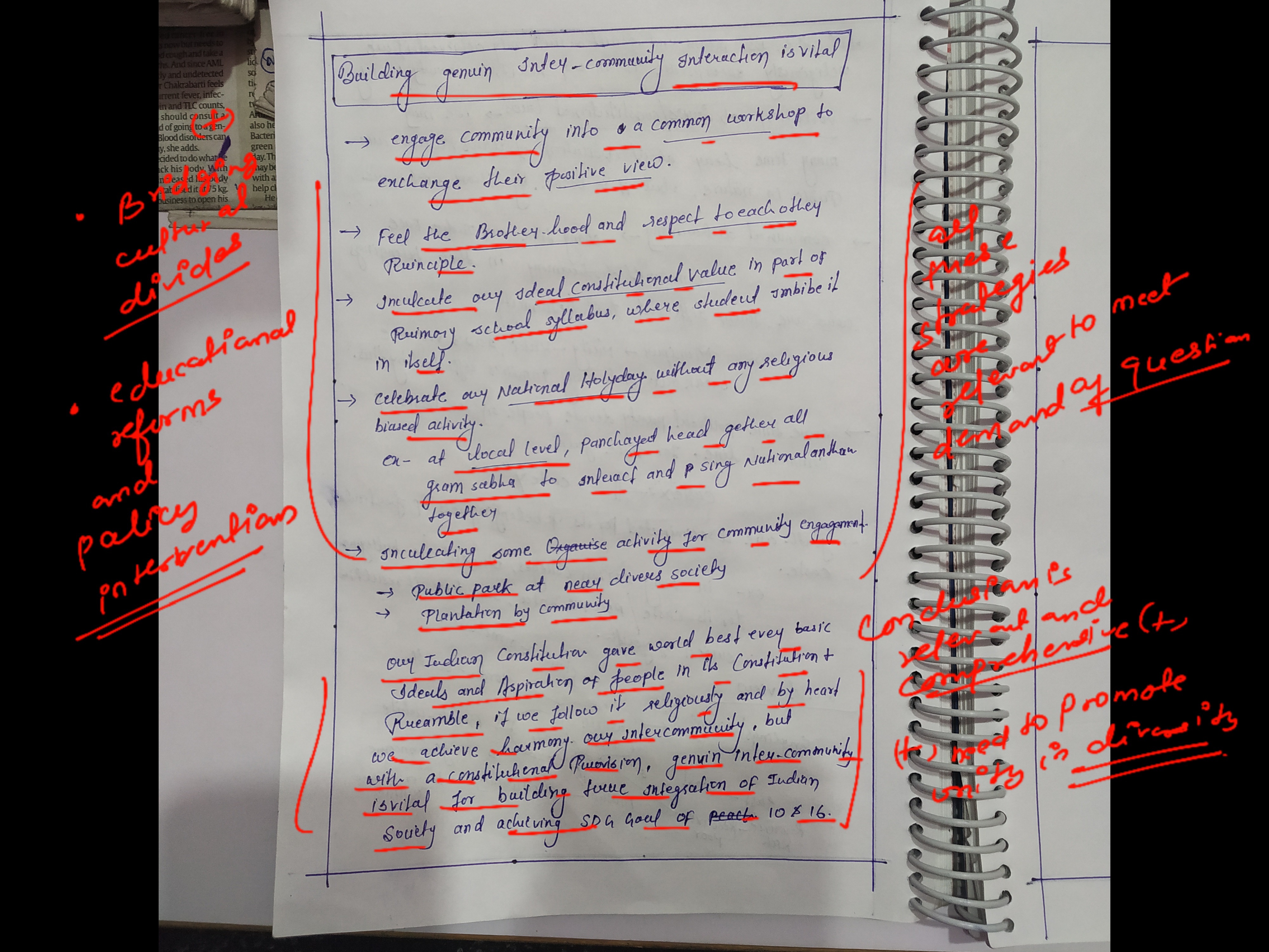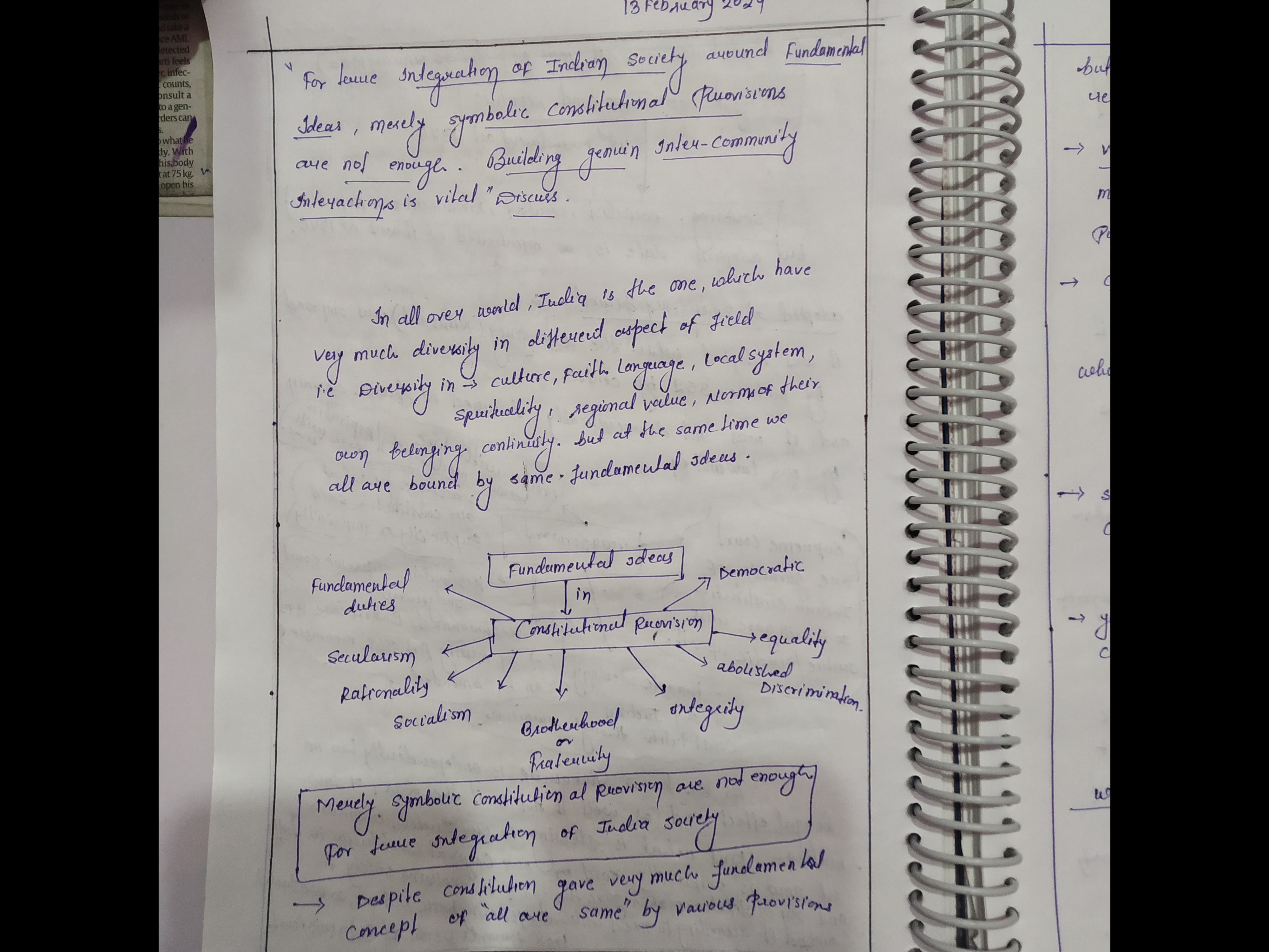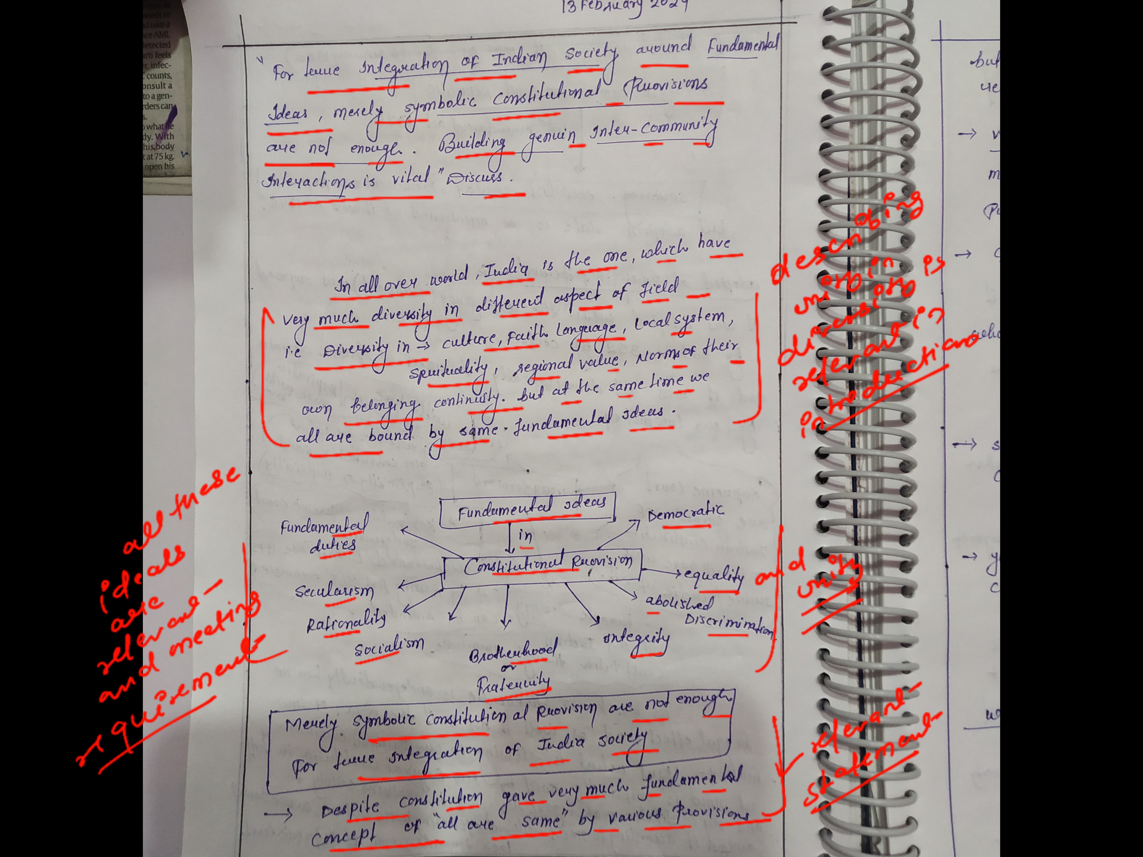 Q. For true integration of Indian society around fundamental ideas, merely symbolic Constitutional provisions are not enough. Building genuine inter-community interactions is vital.” Discuss. (10 Marks 150 Words)
