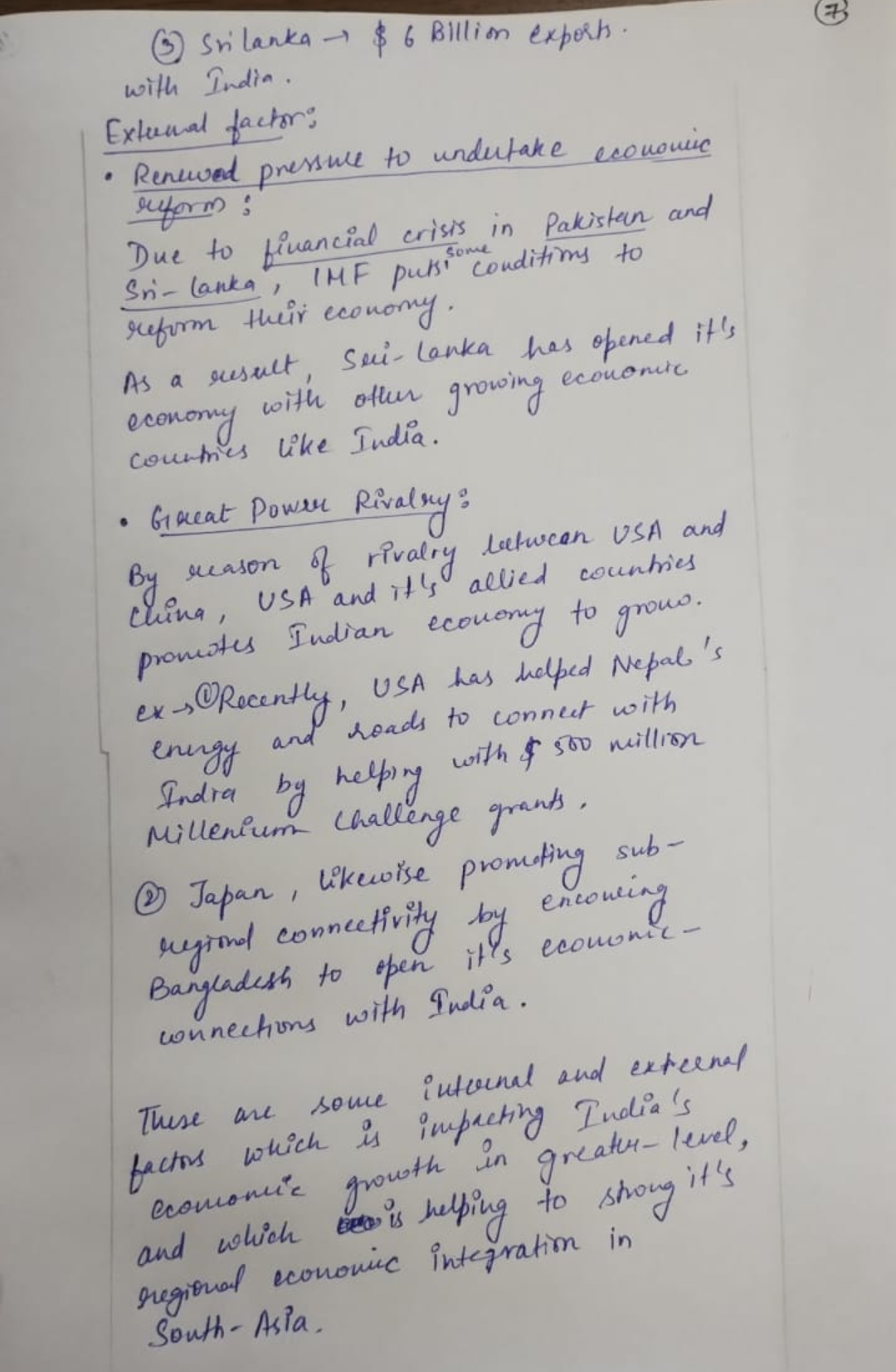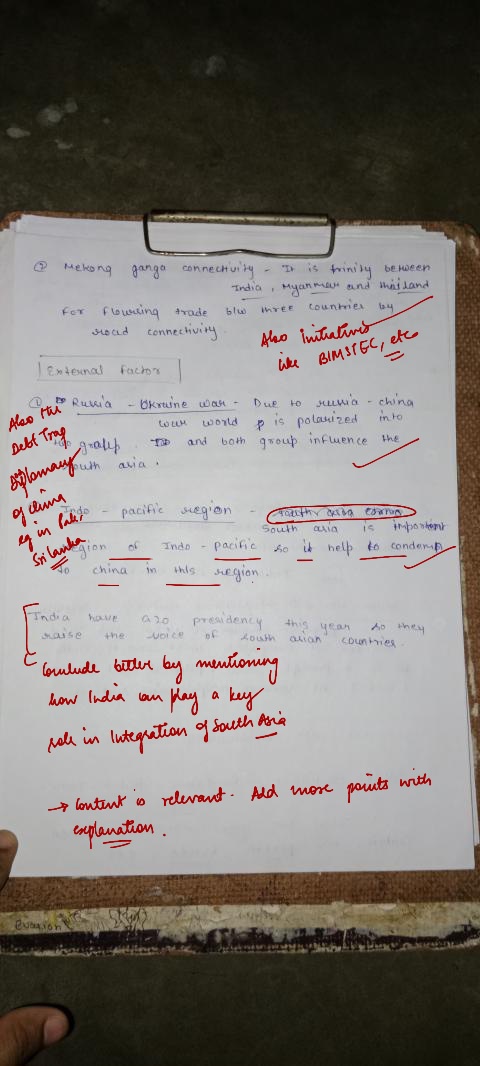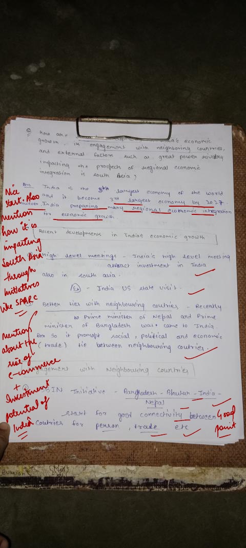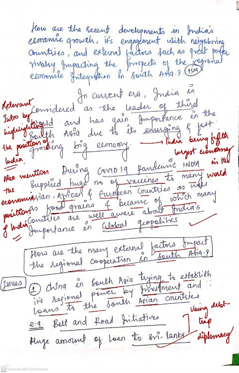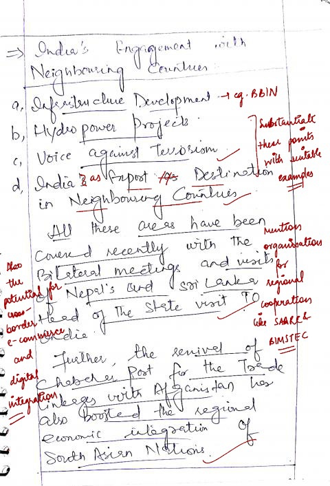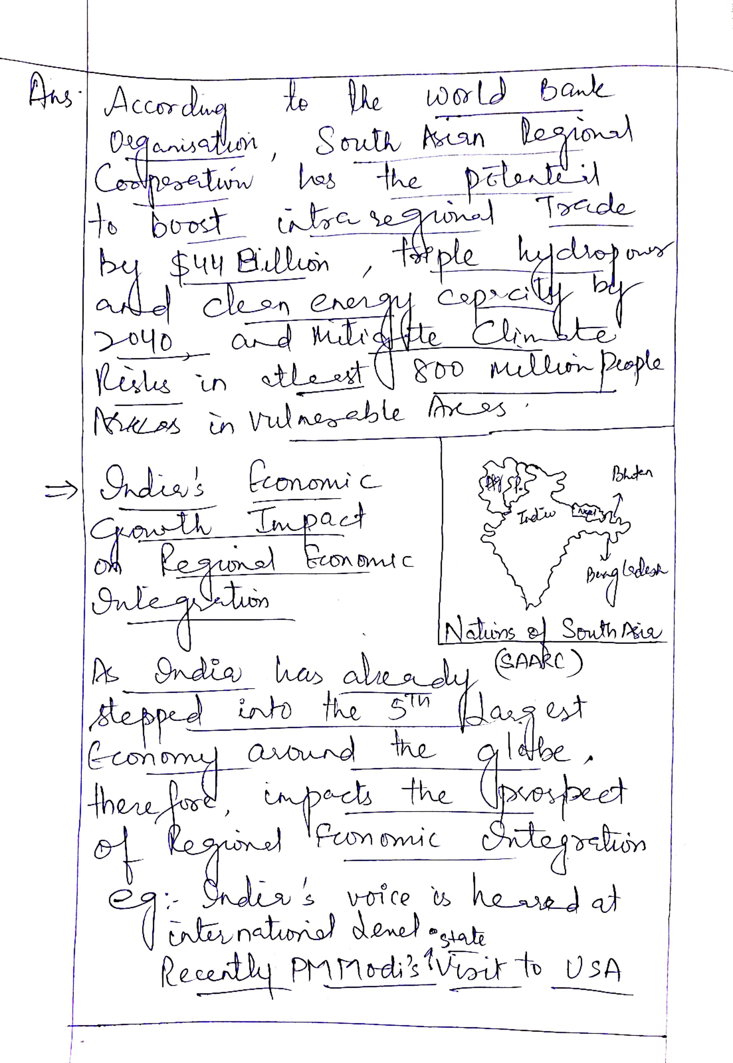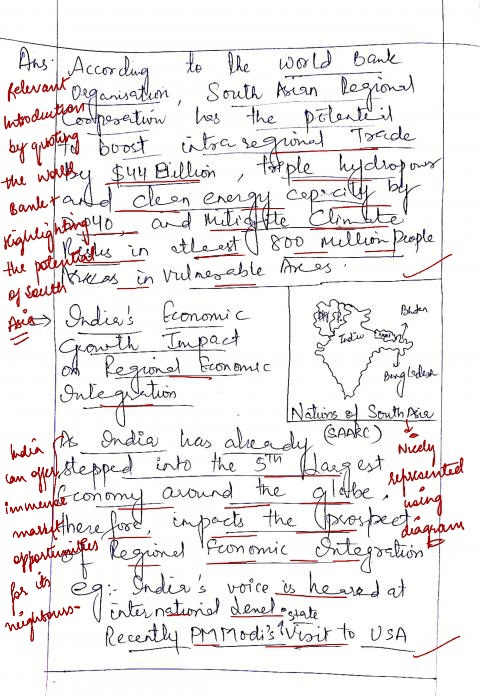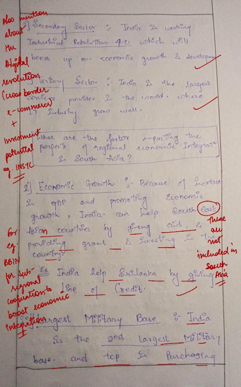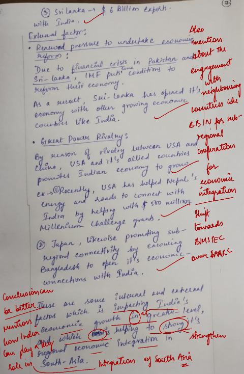 Q. How are recent developments in India’s economic growth, its engagement with neighboring countries, and external factors such as great power rivalry impacting the prospects of regional economic integration in South Asia? (15 Marks, 250 Words)