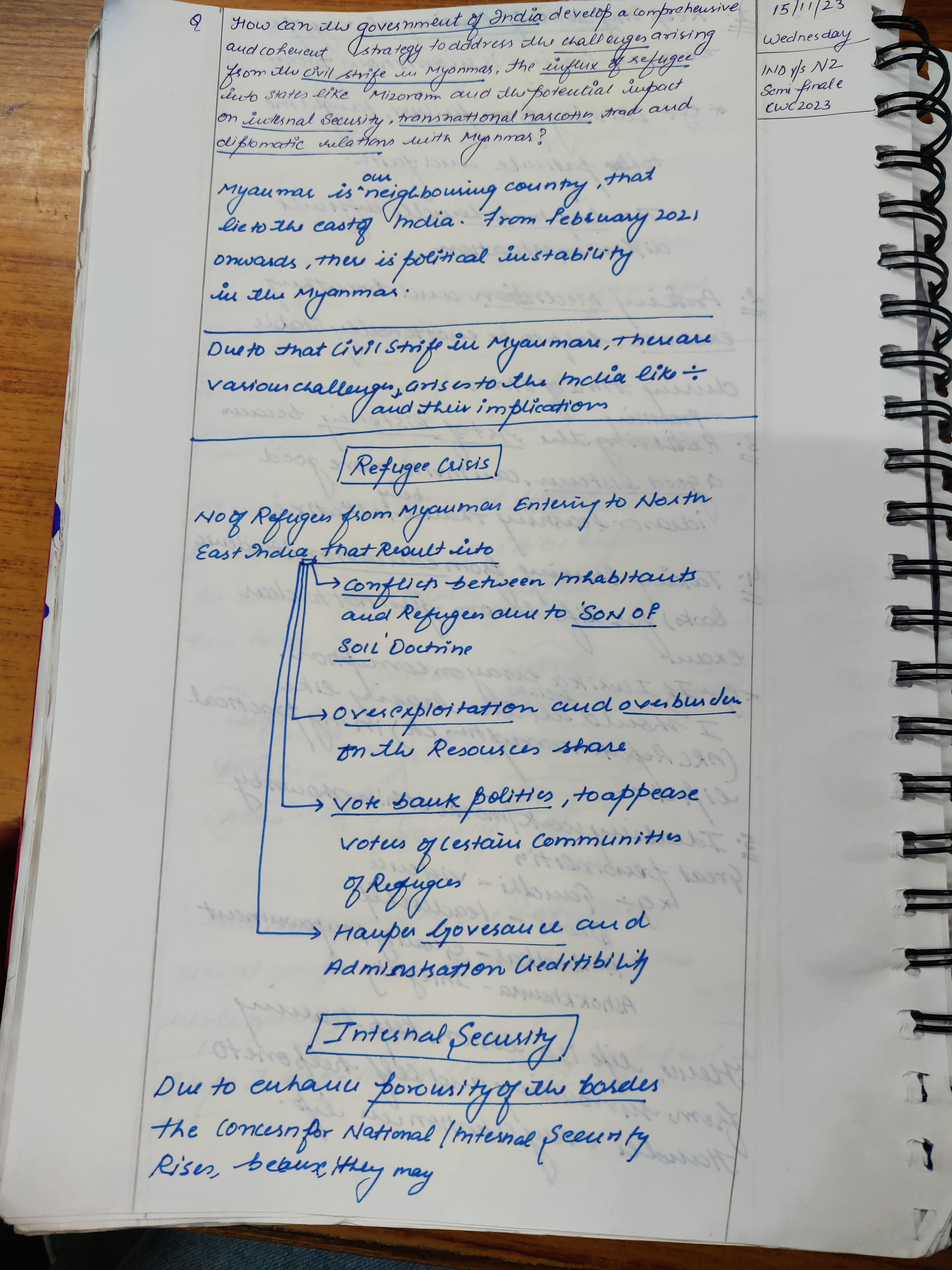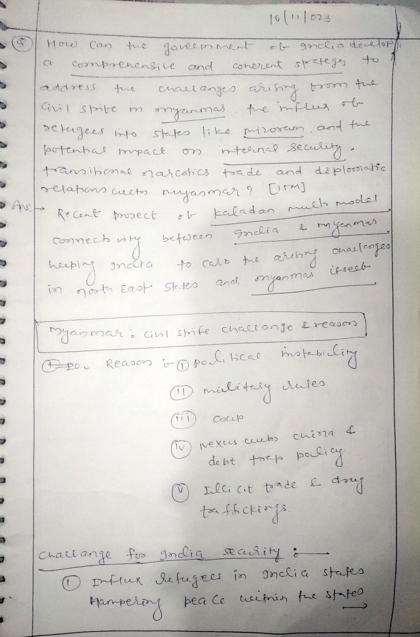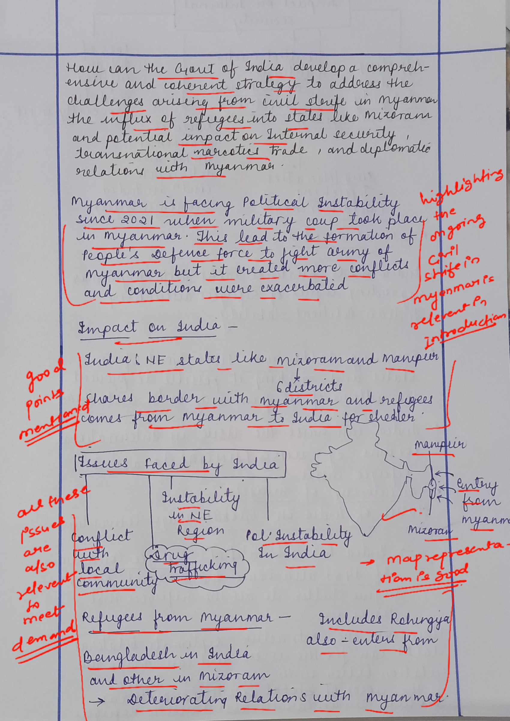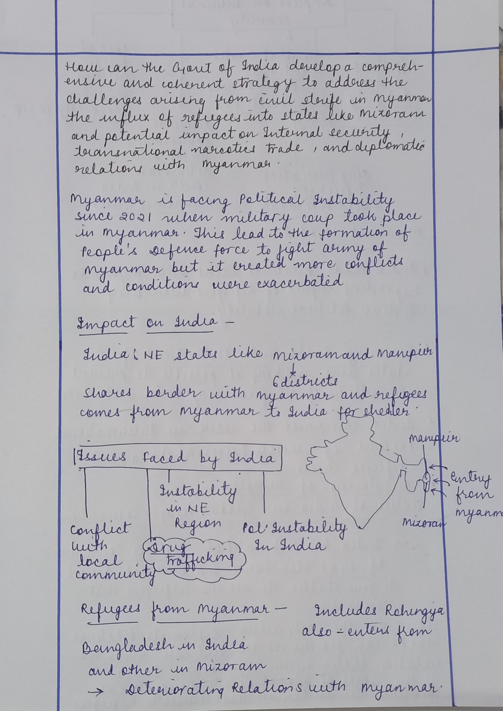 Q. How can the Government of India develop a comprehensive and coherent strategy to address the challenges arising from the civil strife in Myanmar, the influx of refugees into states like Mizoram, and the potential impact on internal security, transnational narcotics trade, and diplomatic relations with Myanmar? (250 words, 15 Marks)