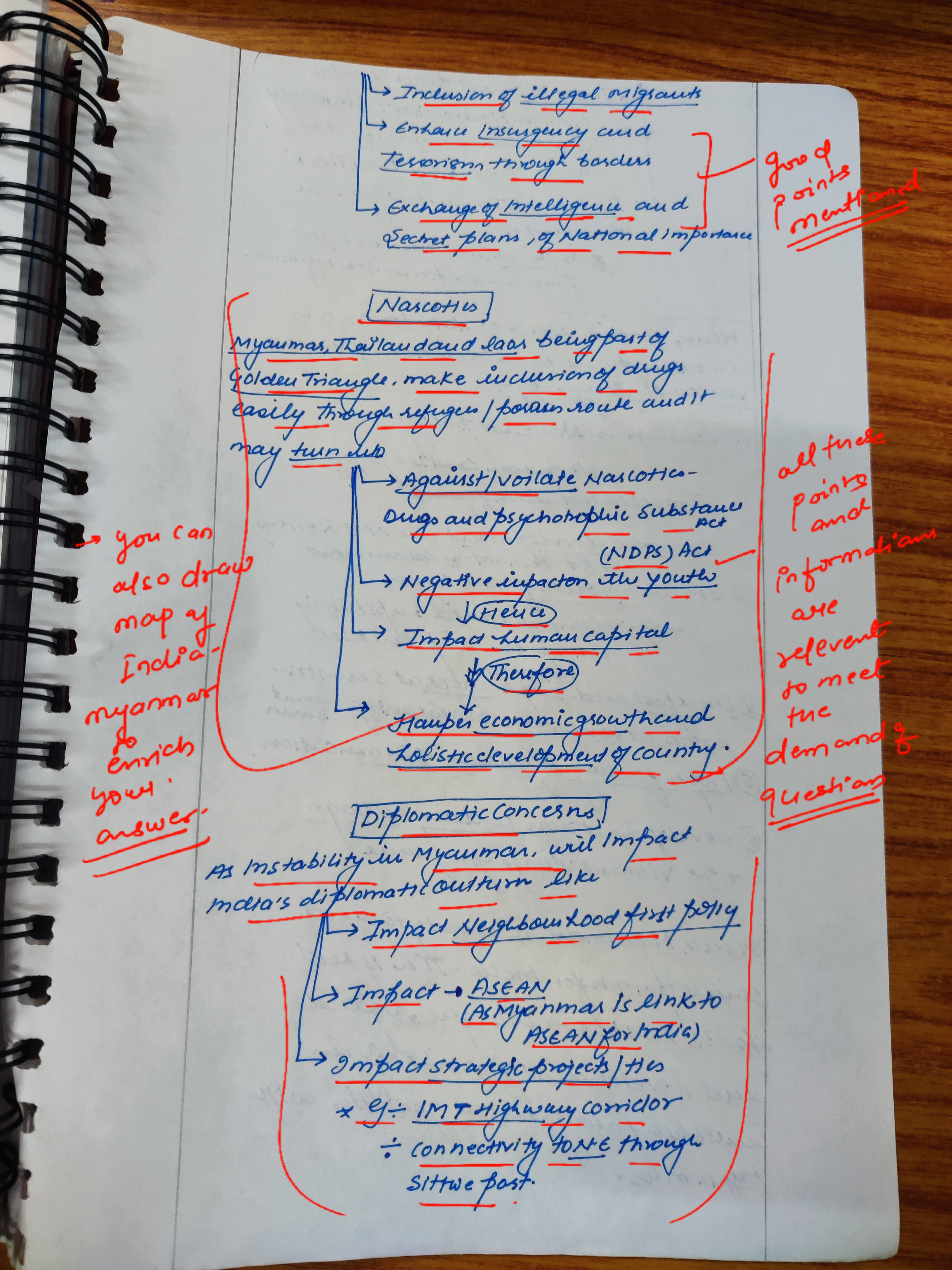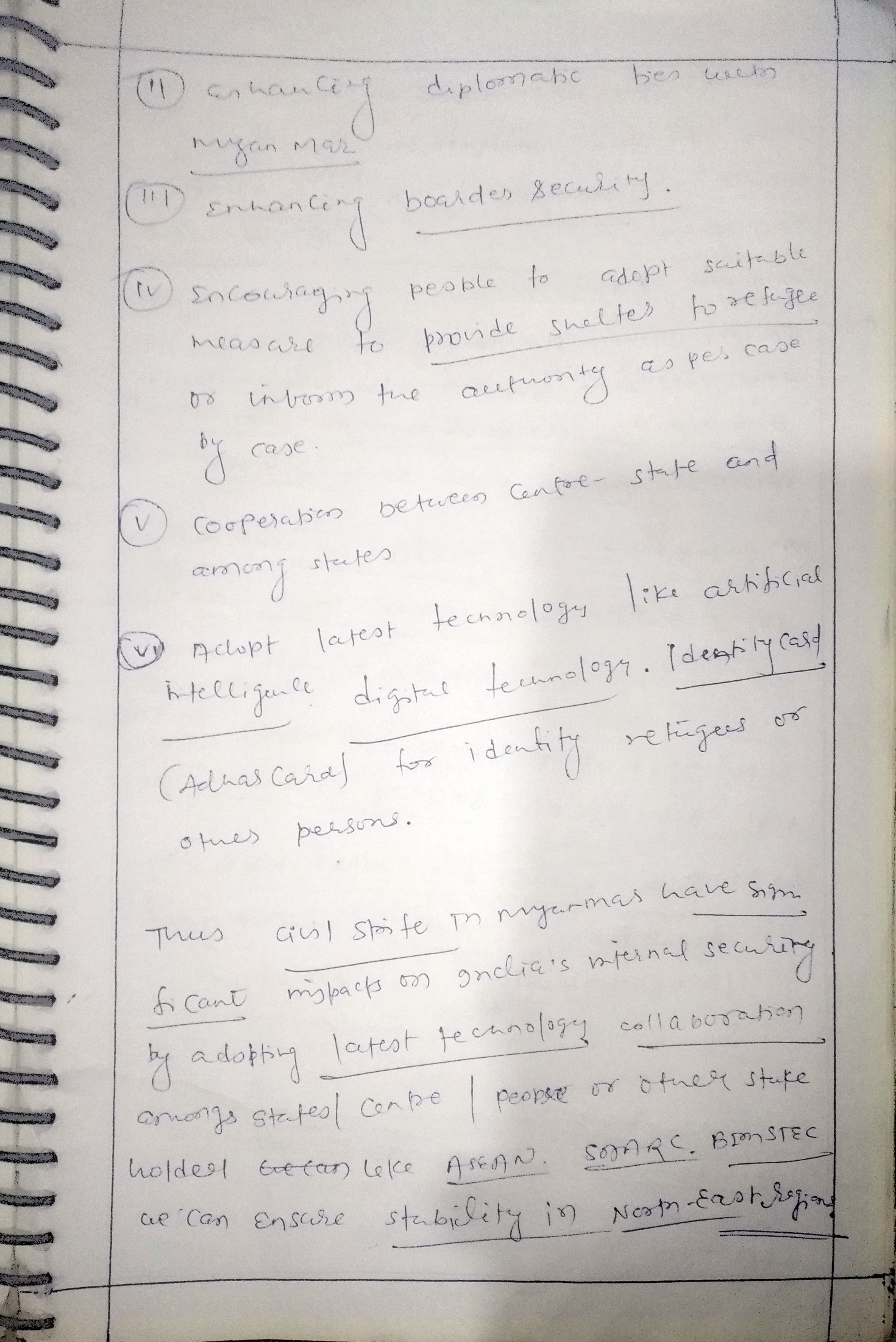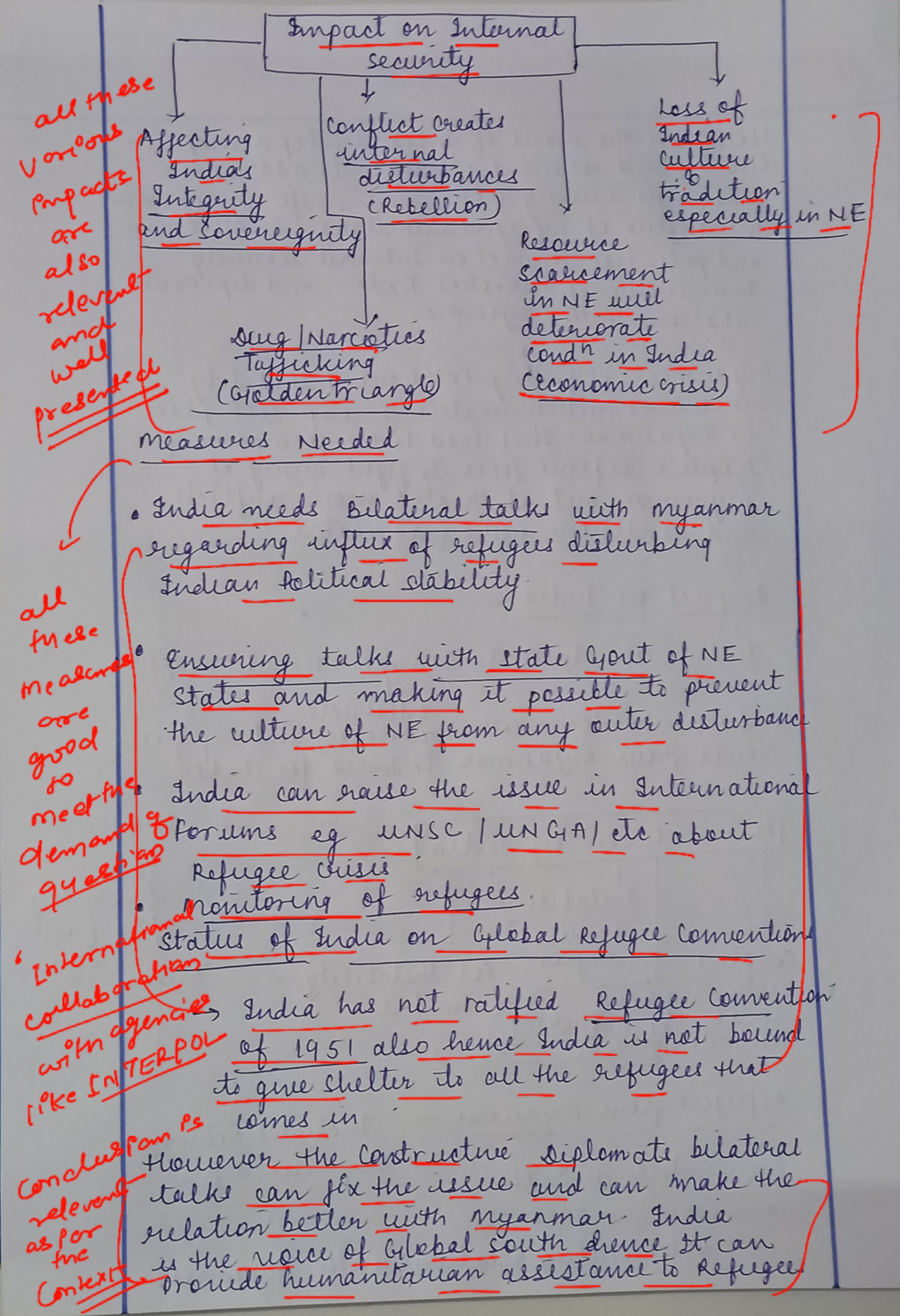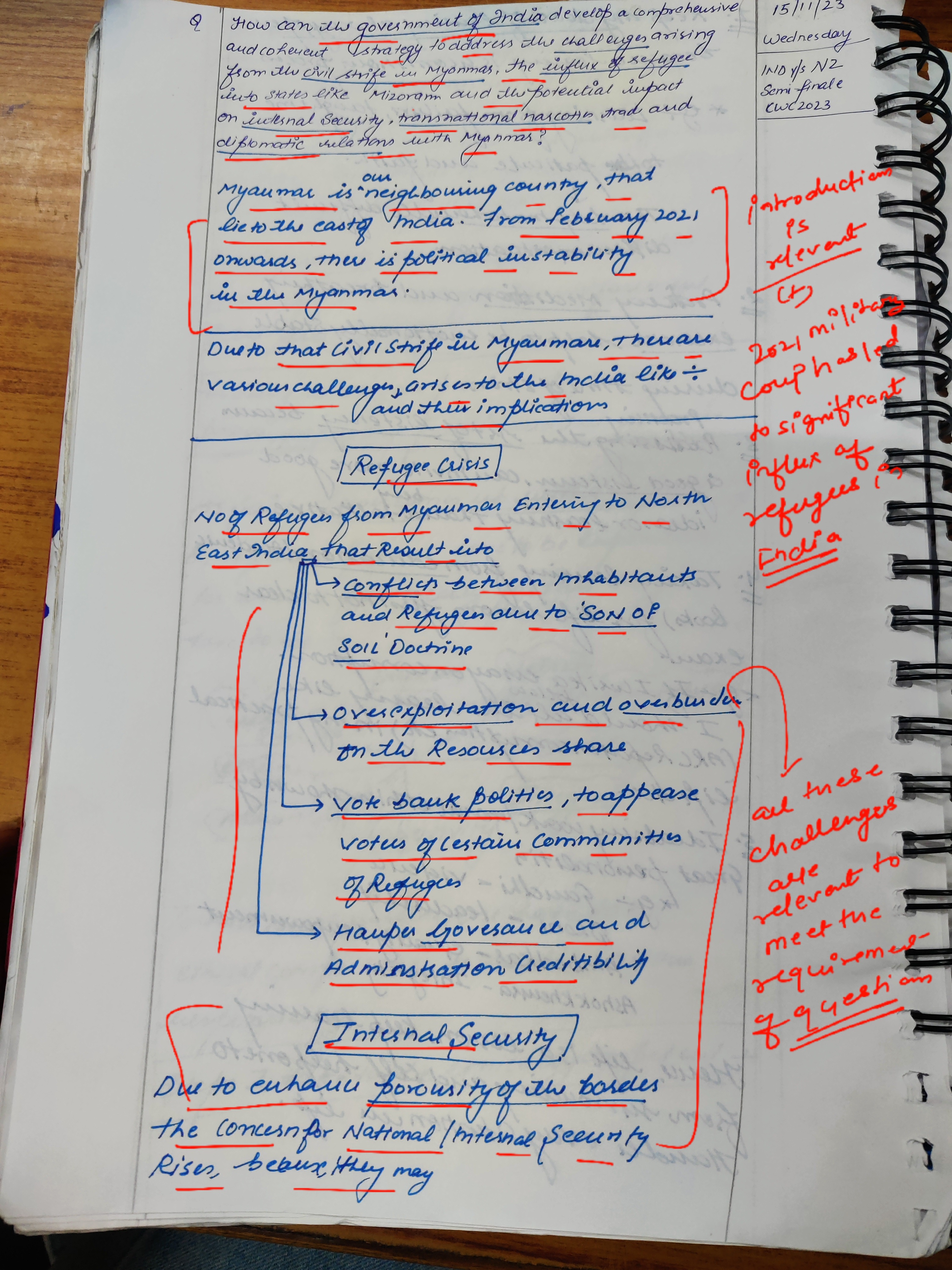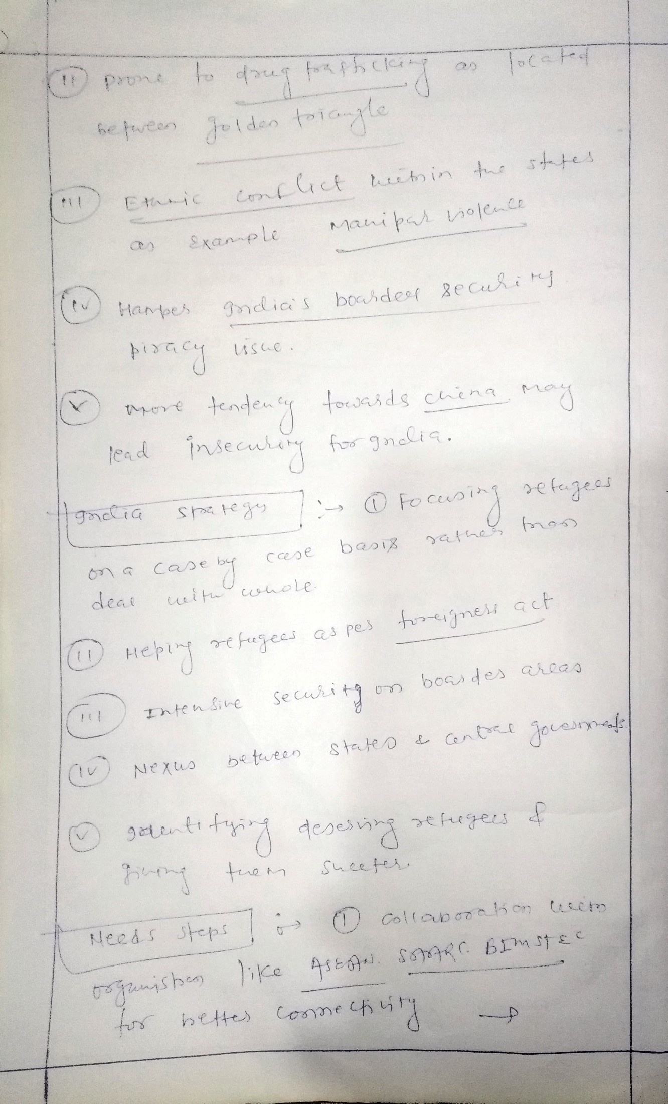 Q. How can the Government of India develop a comprehensive and coherent strategy to address the challenges arising from the civil strife in Myanmar, the influx of refugees into states like Mizoram, and the potential impact on internal security, transnational narcotics trade, and diplomatic relations with Myanmar? (250 words, 15 Marks)