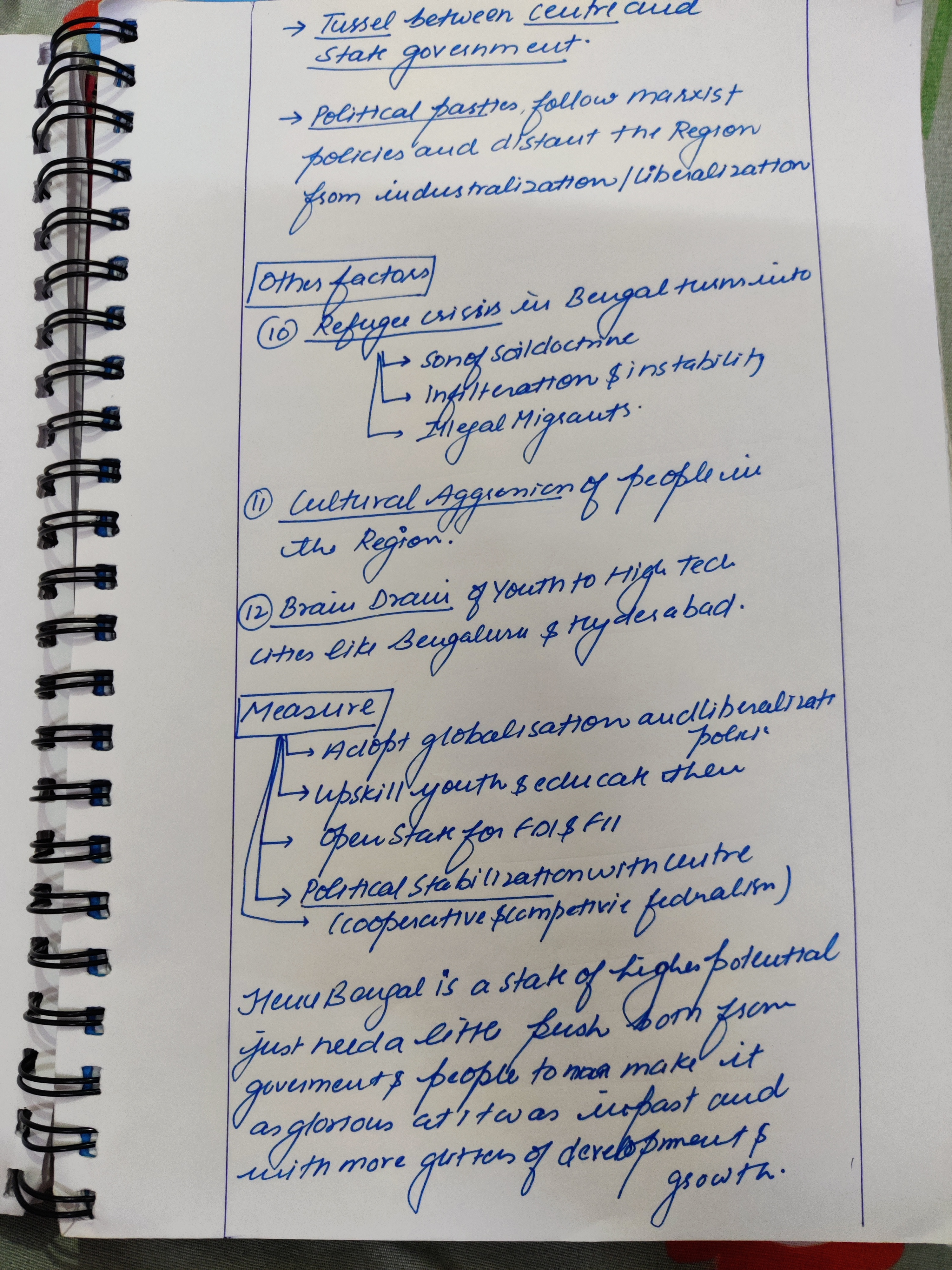 - Land Reforms: While the land reforms in the 1970s under the Left Front government ensured agricultural land distribution, they did not favour large scale industrialization, making it challenging to set up large industries.