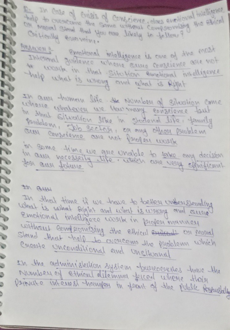 भावनात्मक बुद्धिमत्ता लोक सेवकों के लिए उनके नैतिक या नैतिक रुख से समझौता किए बिना विवेक के संकट से निपटने के लिए एक मूल्यवान संपत्ति हो सकती है। इसलिए, चुनौतीपूर्ण परिस्थितियों में नैतिक और नैतिक निर्णय लेने के लिए भावनात्मक बुद्धिमत्ता विकसित करना लोक सेवकों के लिए प्राथमिकता होनी चाहिए।