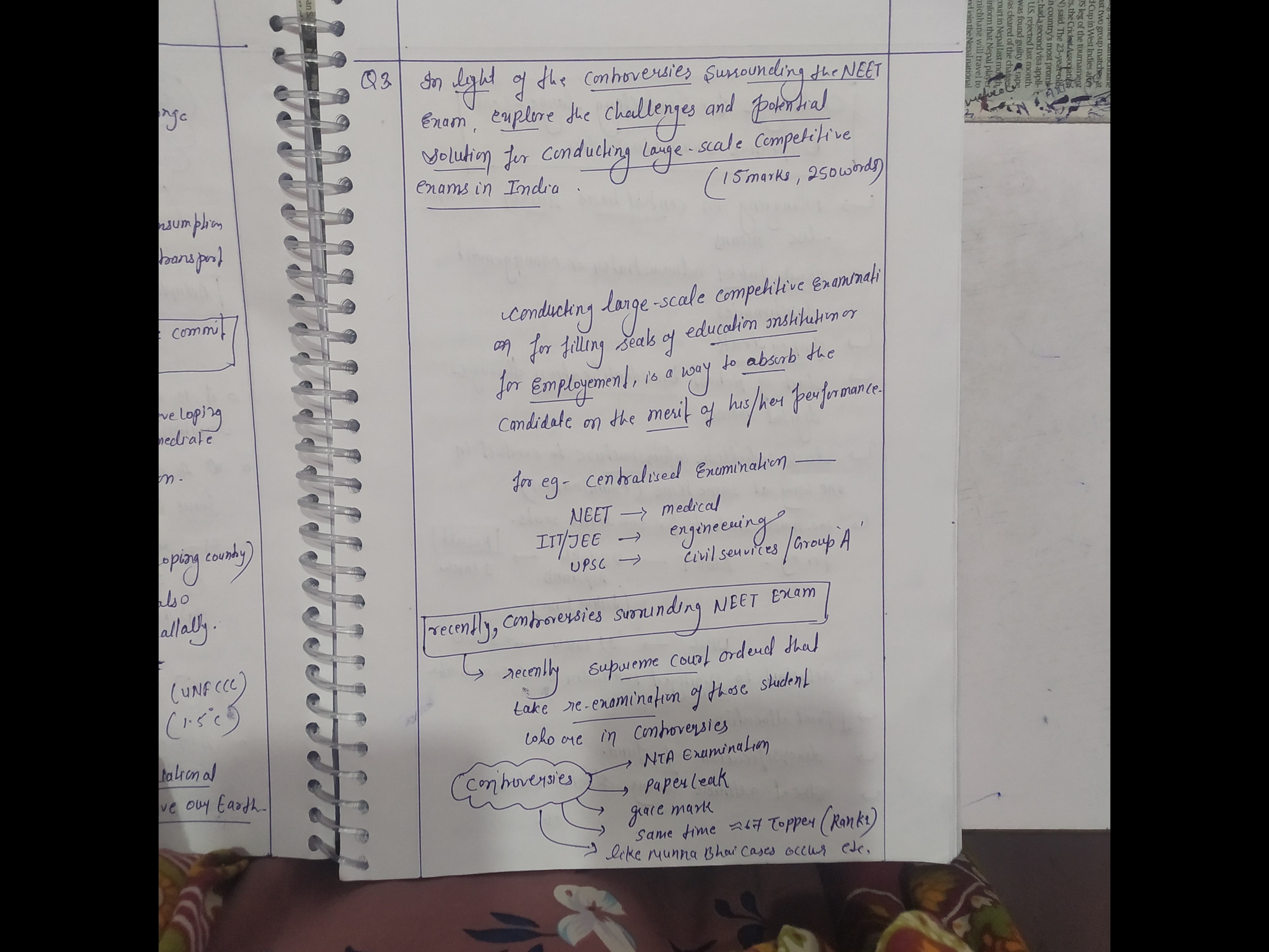 Q. In light of the controversies surrounding the NEET exam, explore the challenges and potential solutions for conducting large-scale competitive exams in India. (15 Marks, 250 Words)