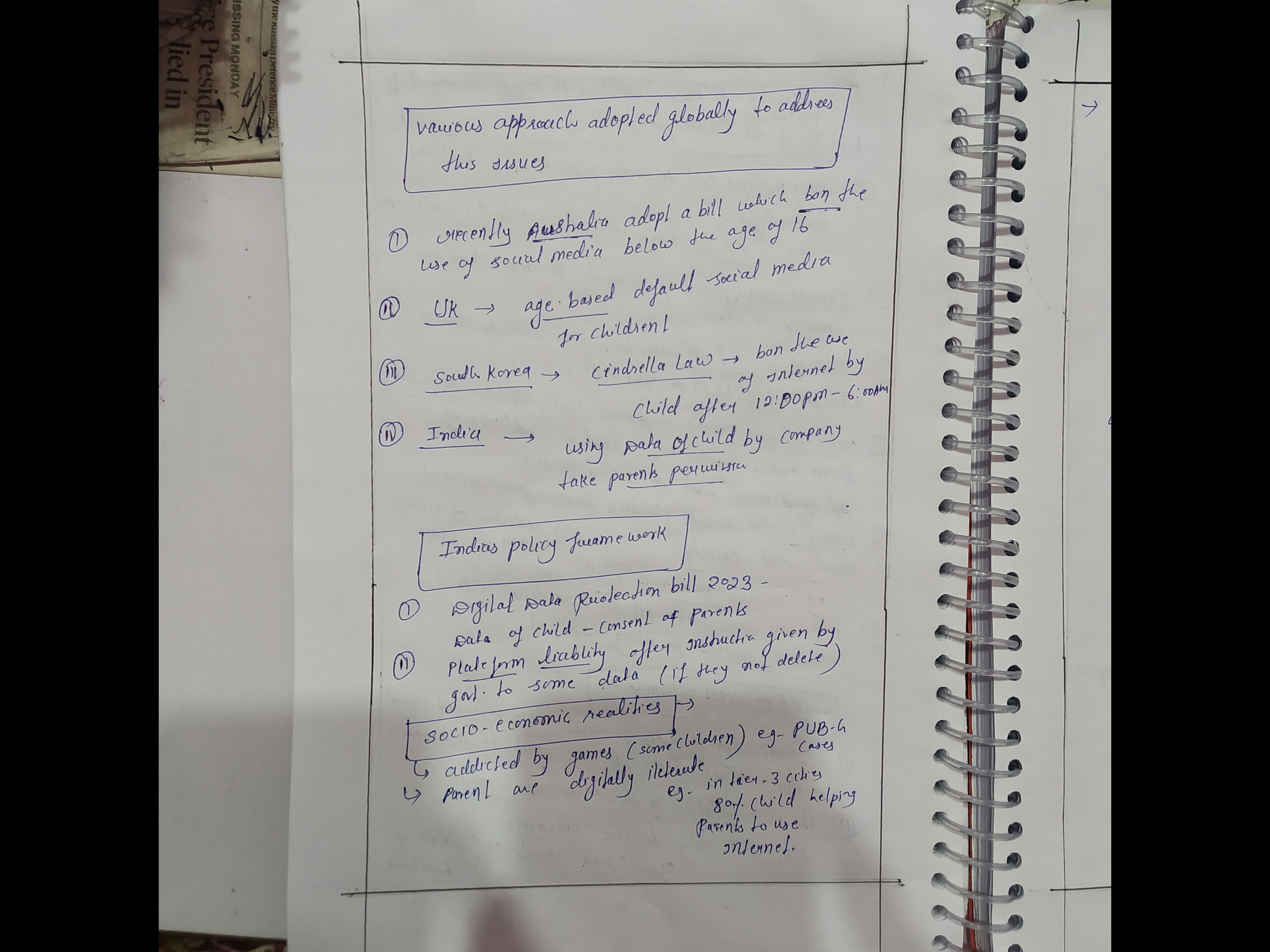 For example: The Digital Personal Data Protection Act, 2023 mandates parental consent but lacks effective enforcement mechanisms in India.