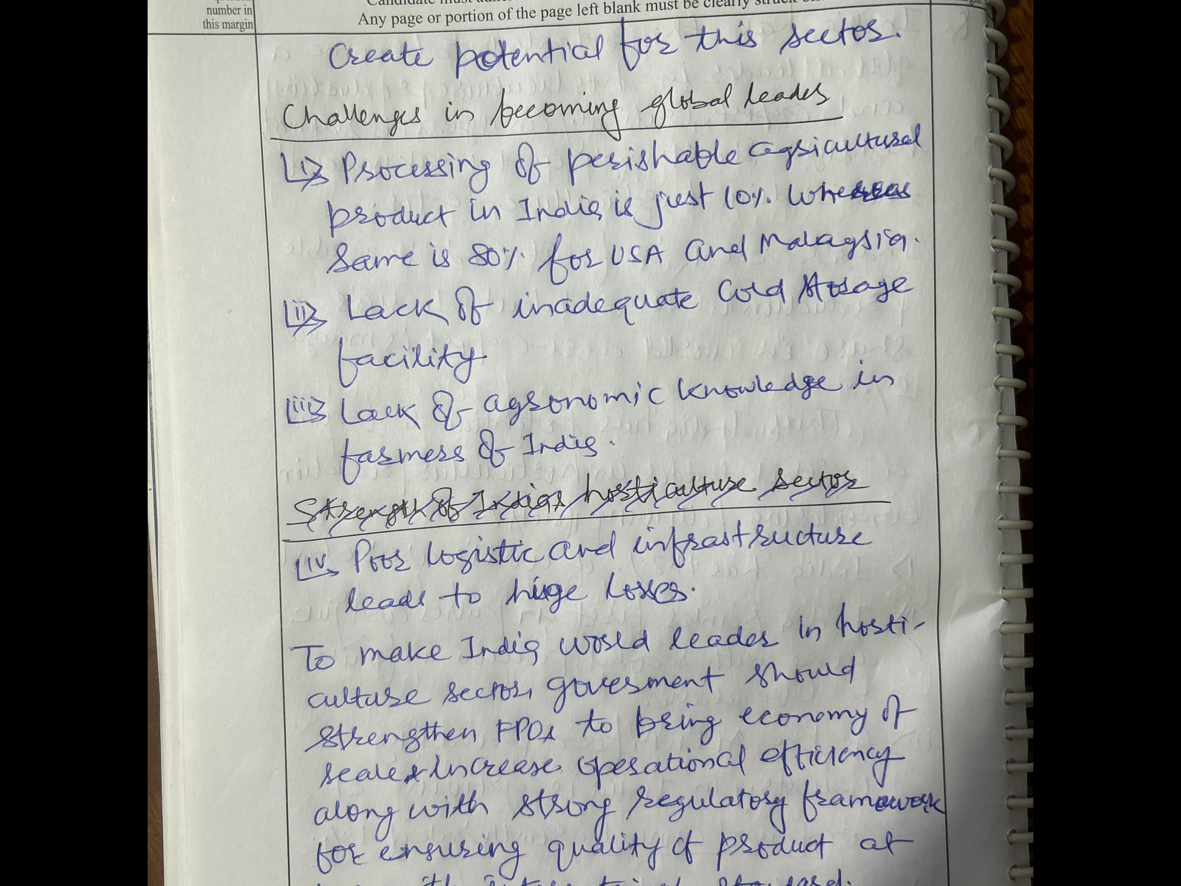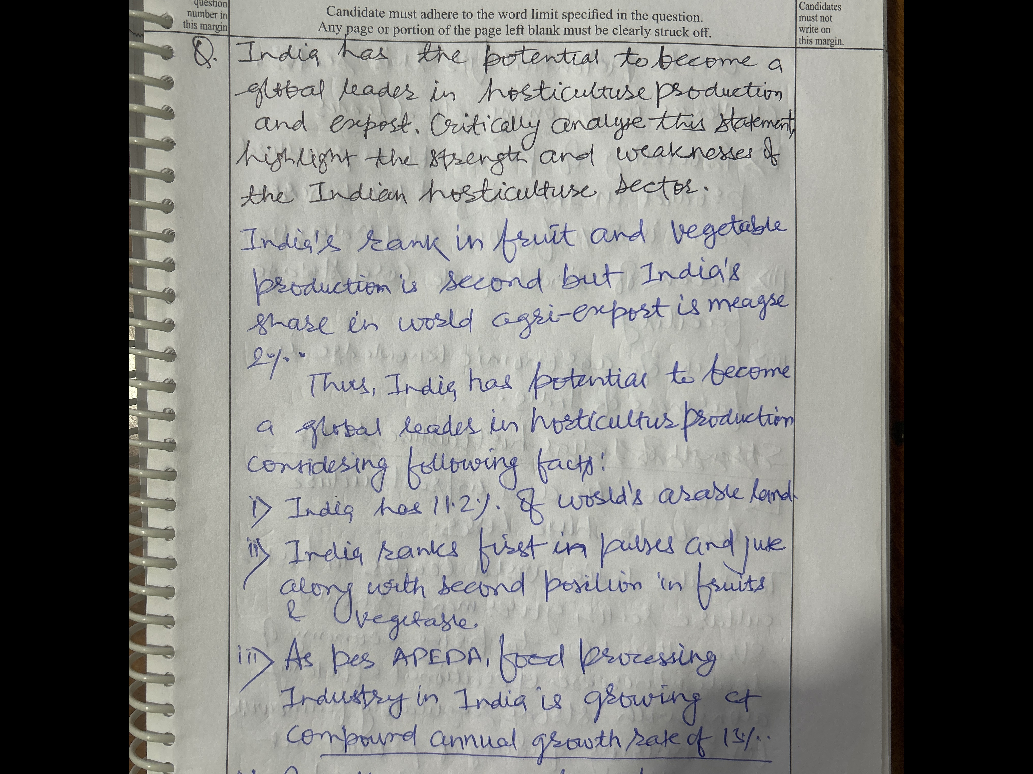 Q. "भारत में बागवानी उत्पादन और निर्यात के क्षेत्र में वैश्विक नेतृत्वकर्ता बनने की क्षमता है"। भारतीय बागवानी क्षेत्र की शक्तियों और कमजोरियों पर प्रकाश डालते हुए इस कथन का आलोचनात्मक विश्लेषण कीजिए। (15 अंक, 250 शब्द)