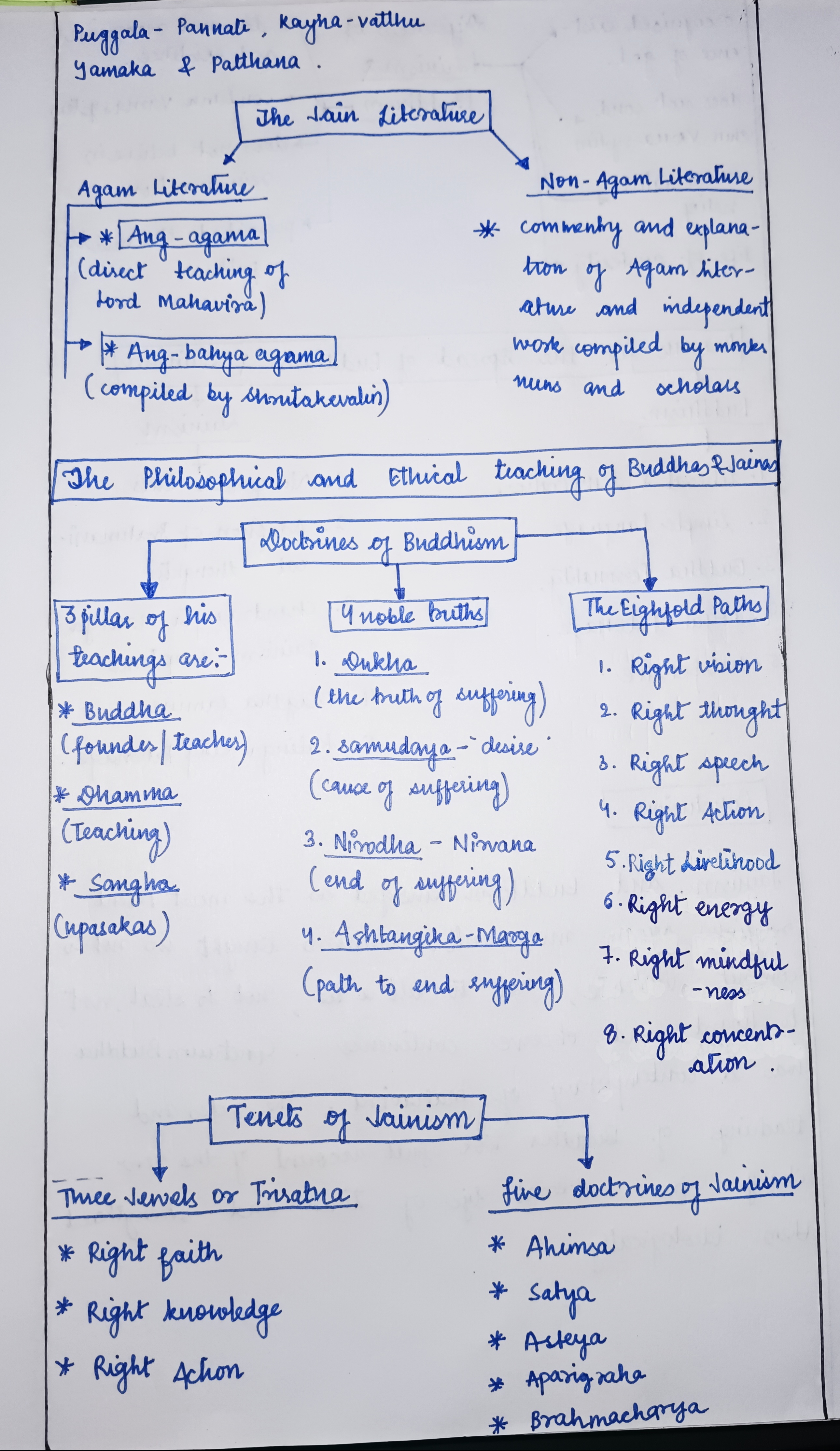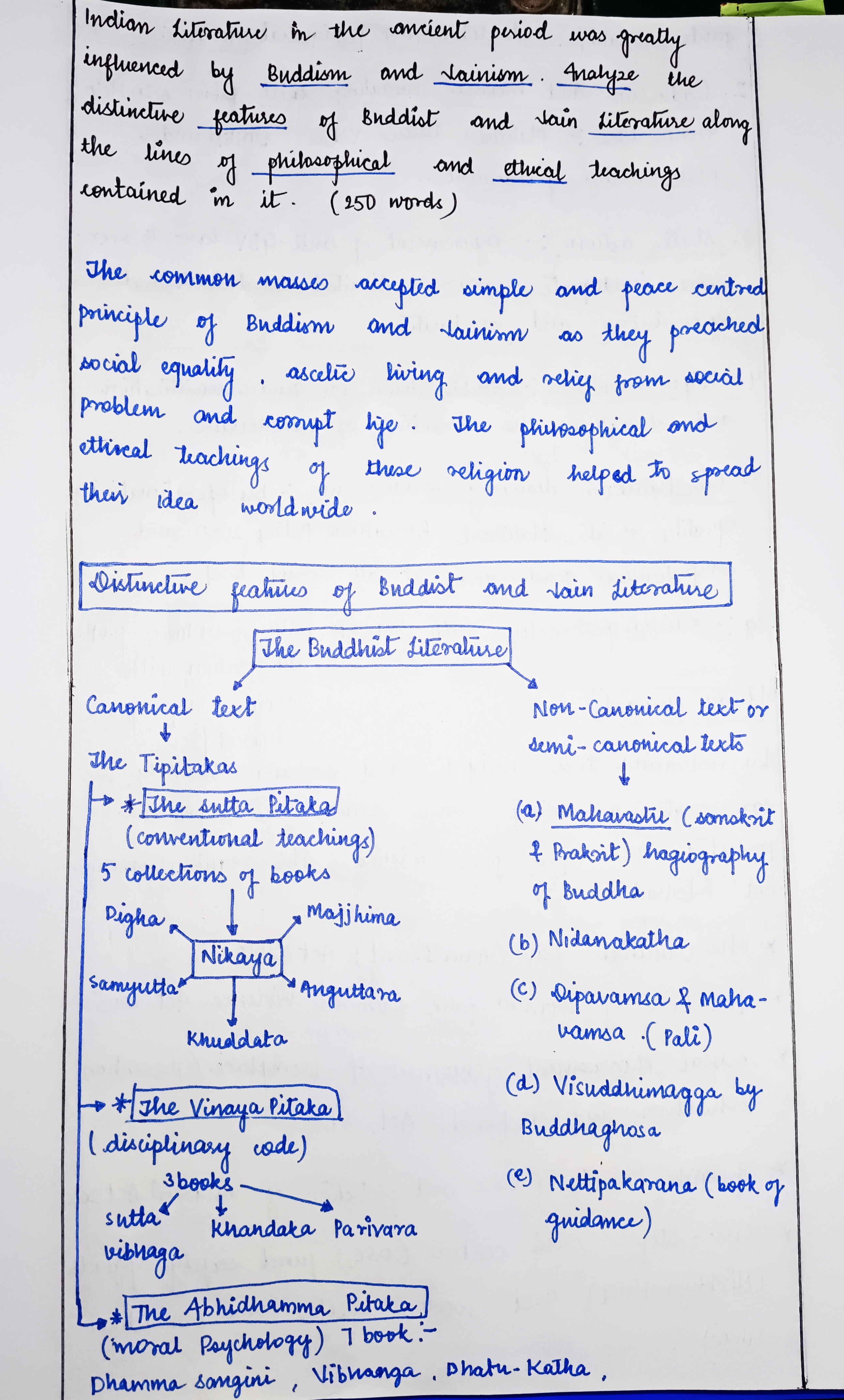 Q. Indian literature in the ancient period was greatly influenced by Buddhism and Jainism. Analyze the distinctive features of Buddhist and Jain literature along the lines of philosophical and ethical teachings contained in it. (15 marks, 250 words) (additional)