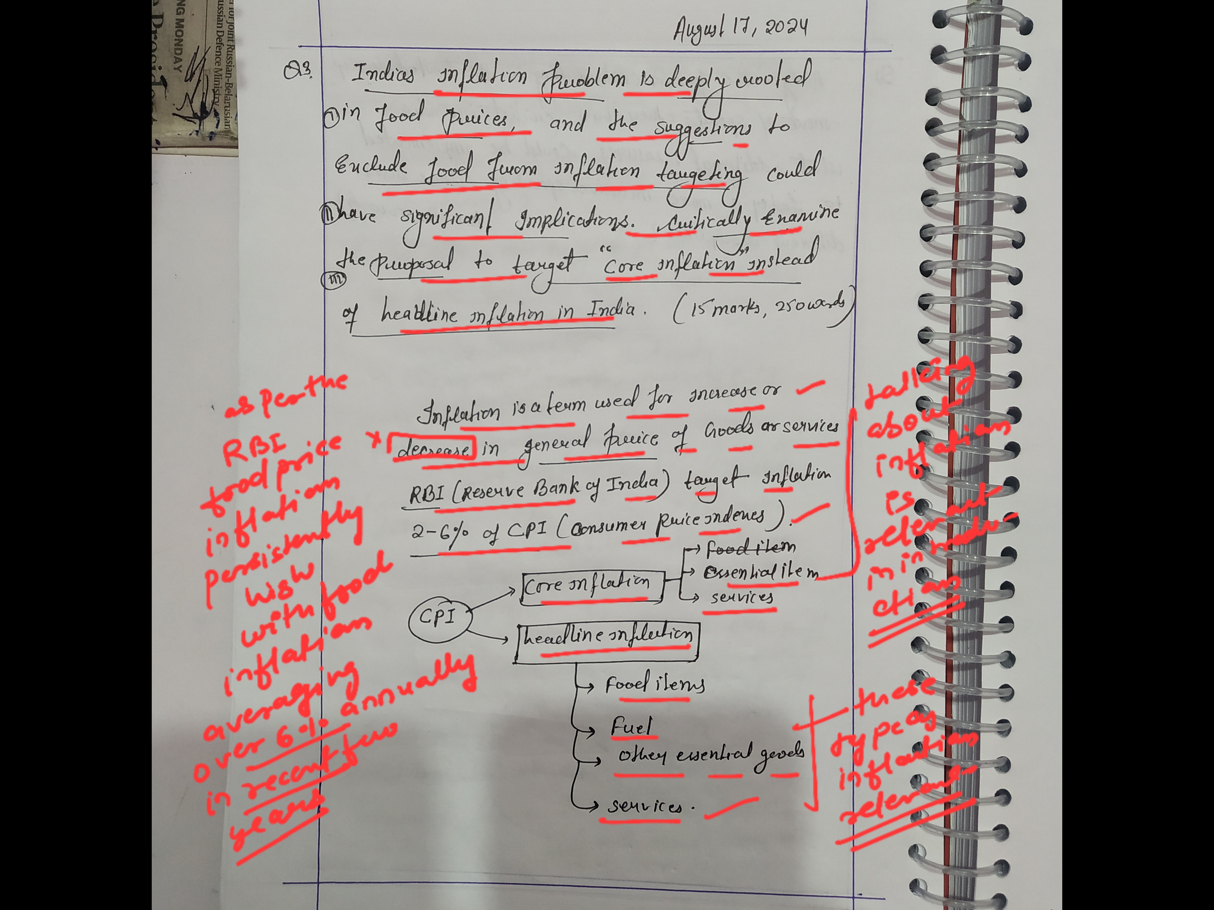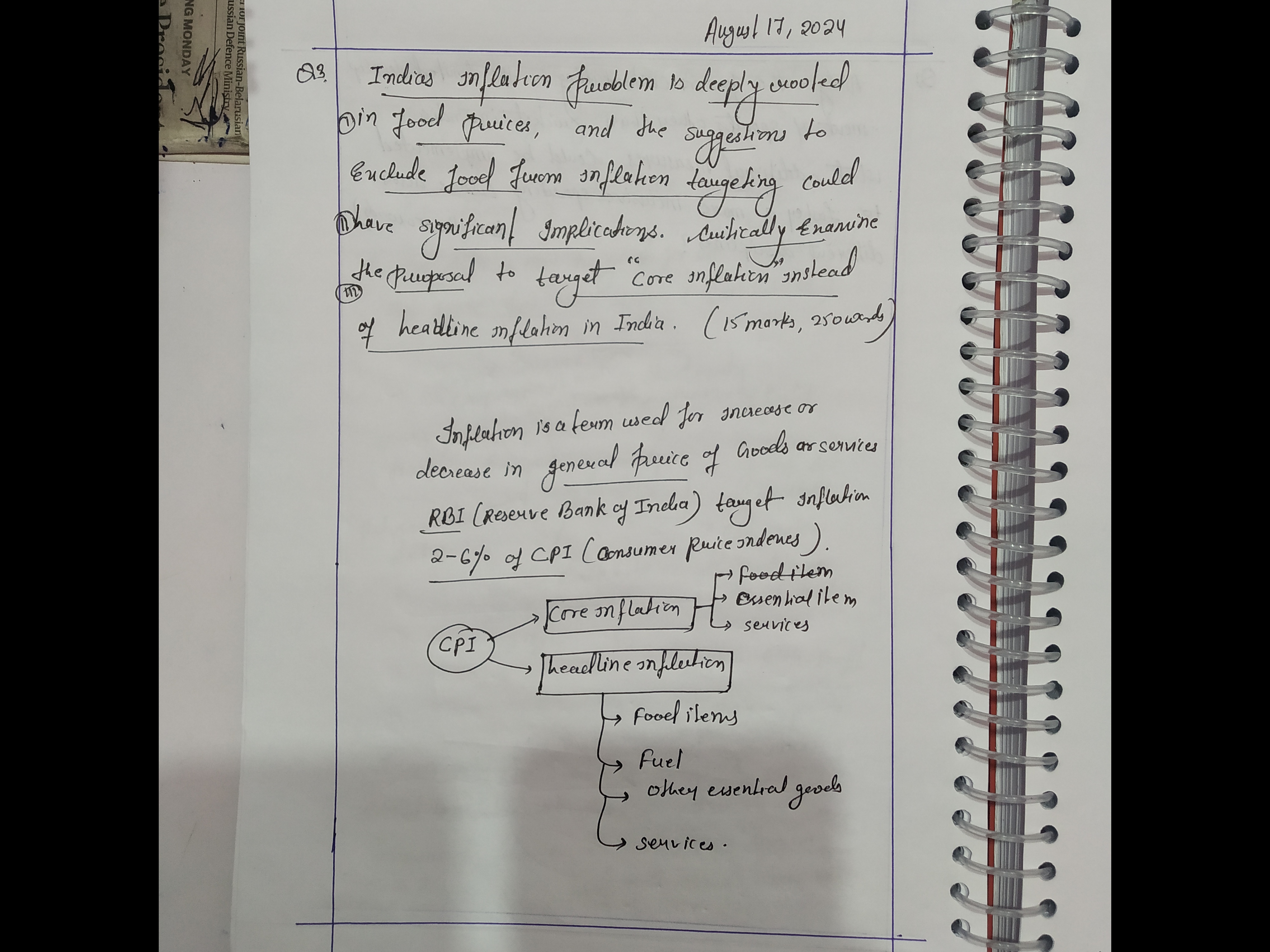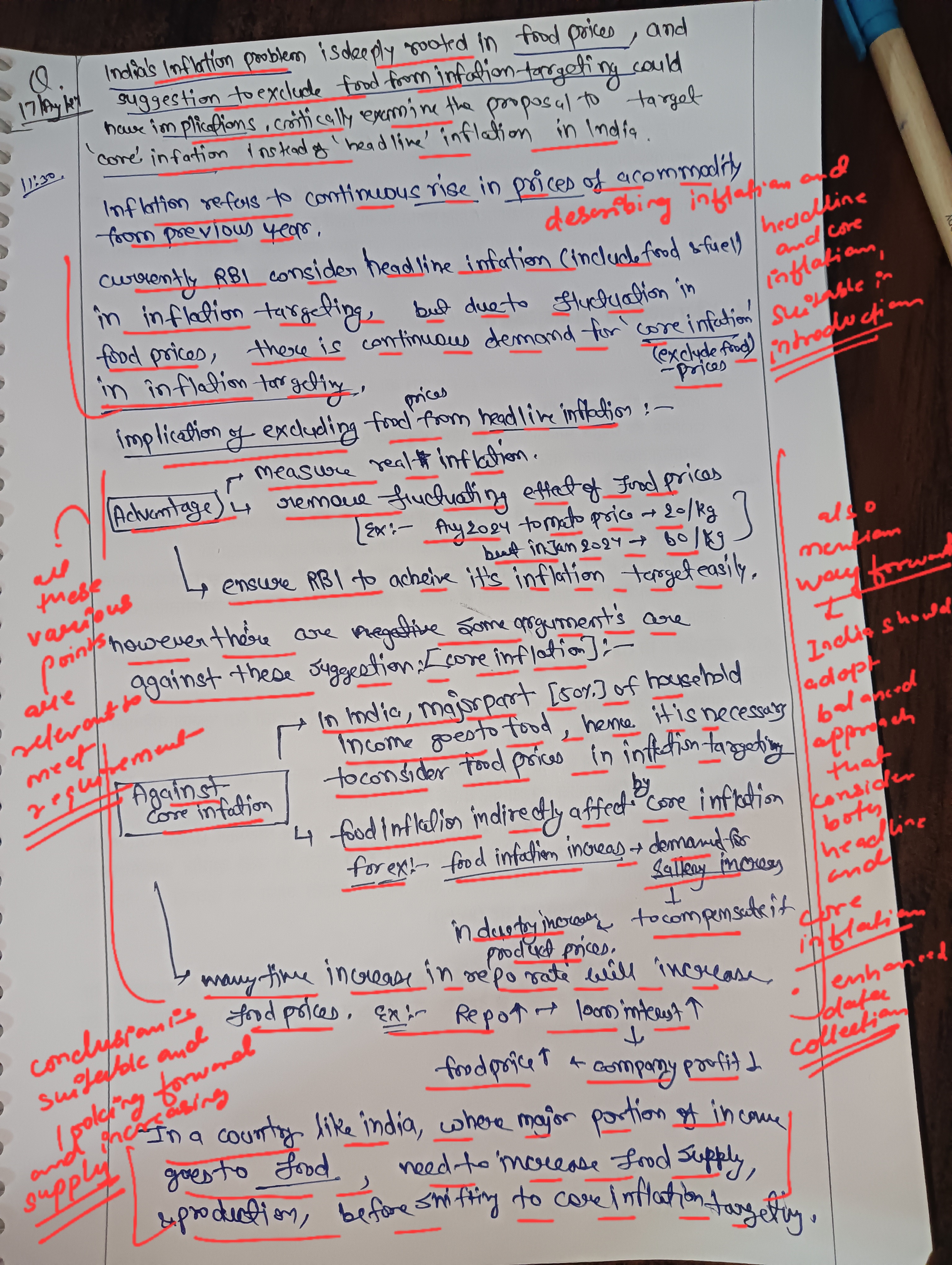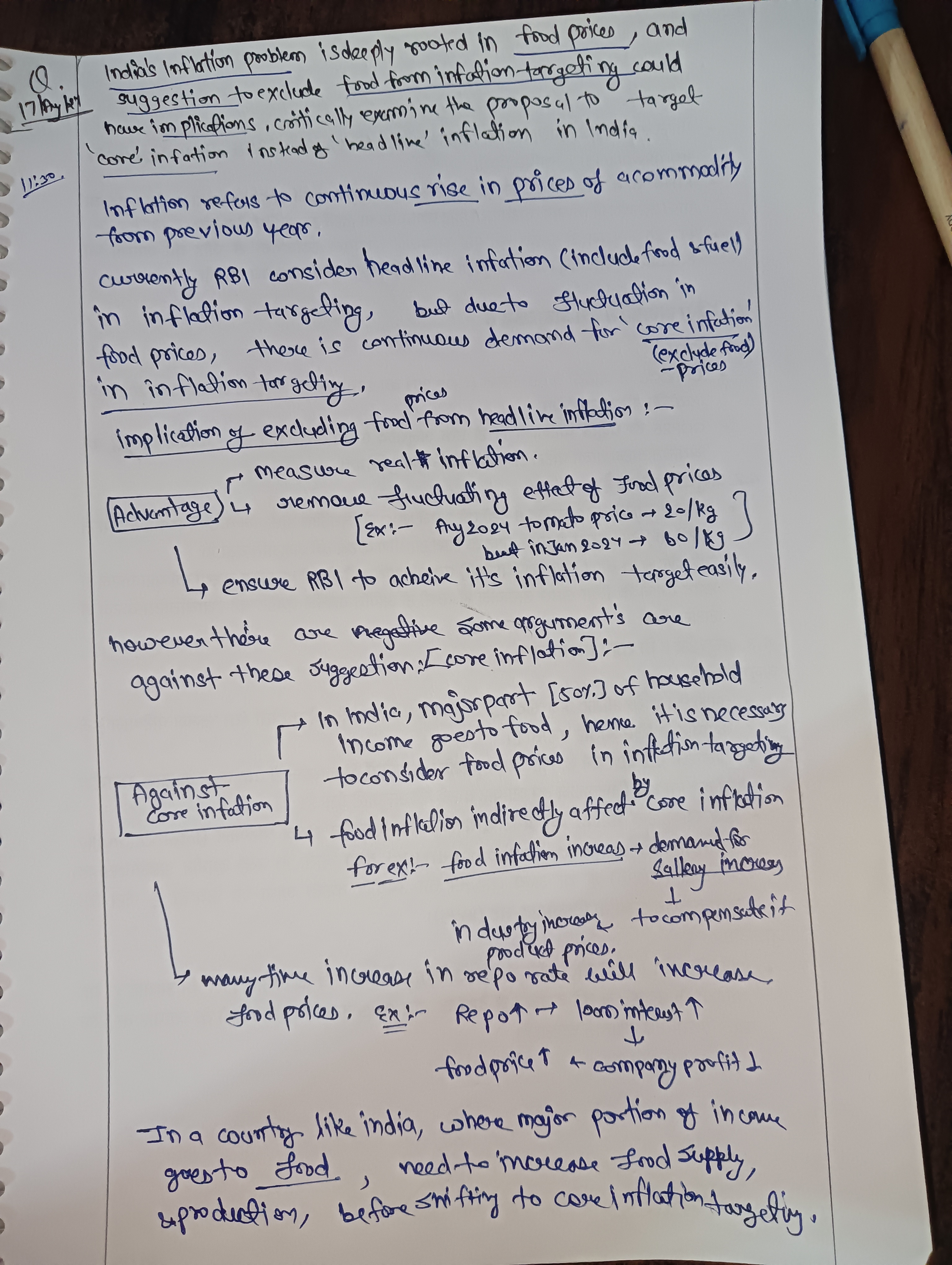 Examine how India’s inflation problem is deeply rooted in food prices and how the suggestion to exclude food from inflation targeting could have significant implications. Examine the proposal to target ‘core’ inflation instead of ‘headline’ inflation in India.Highlight its shortcomings.Suggest a way ahead |