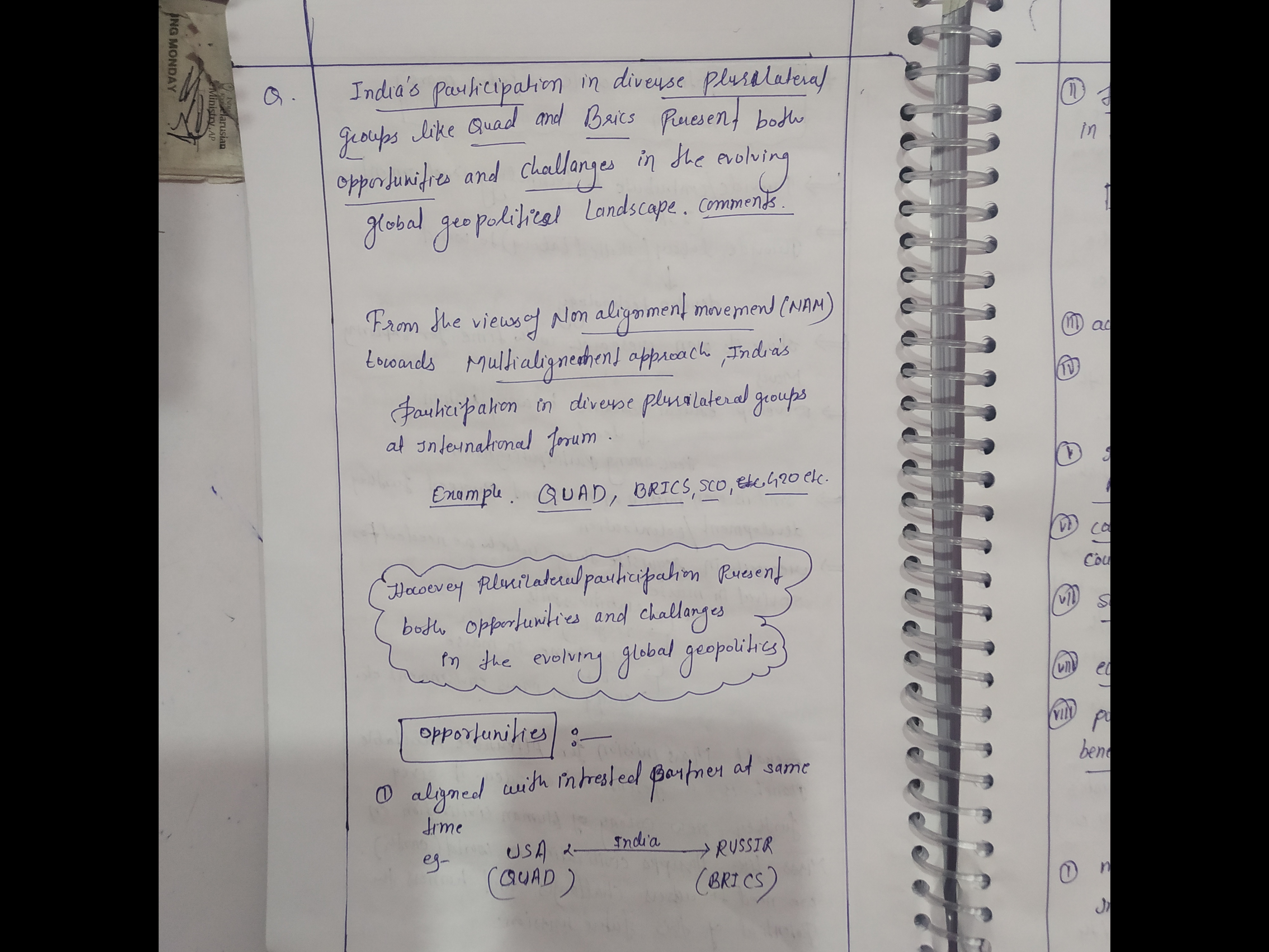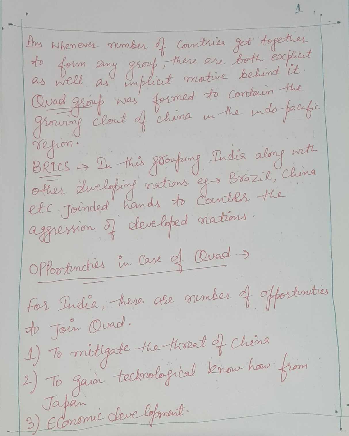 - Elaborate the opportunities presented by India’s participation in diverse plurilateral groups like QUAD and BRICS in the evolving global geopolitical landscape.