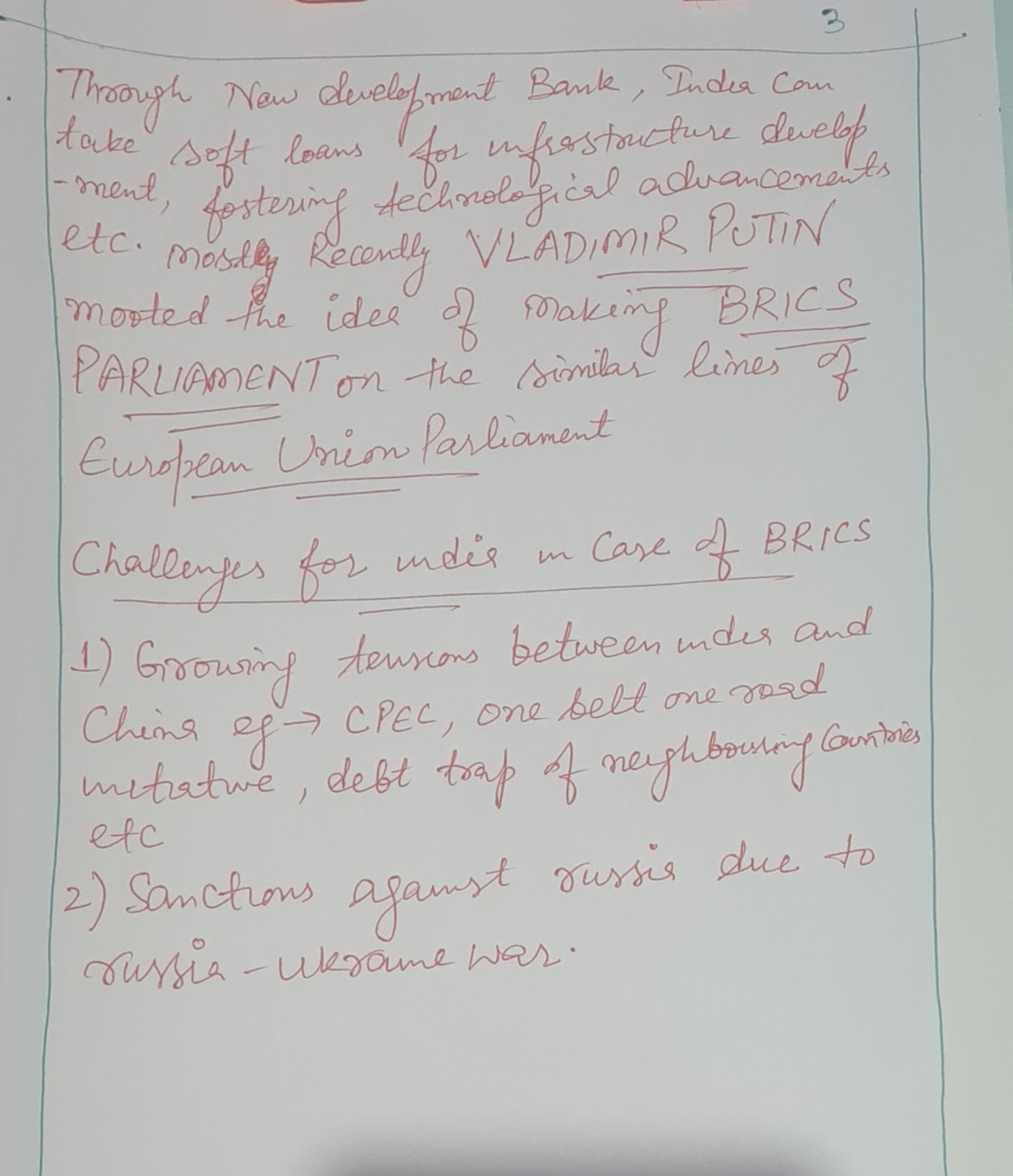 For example: The New Development Bank (NDB) under BRICS provides India with access to funding for infrastructure and sustainable development projects.