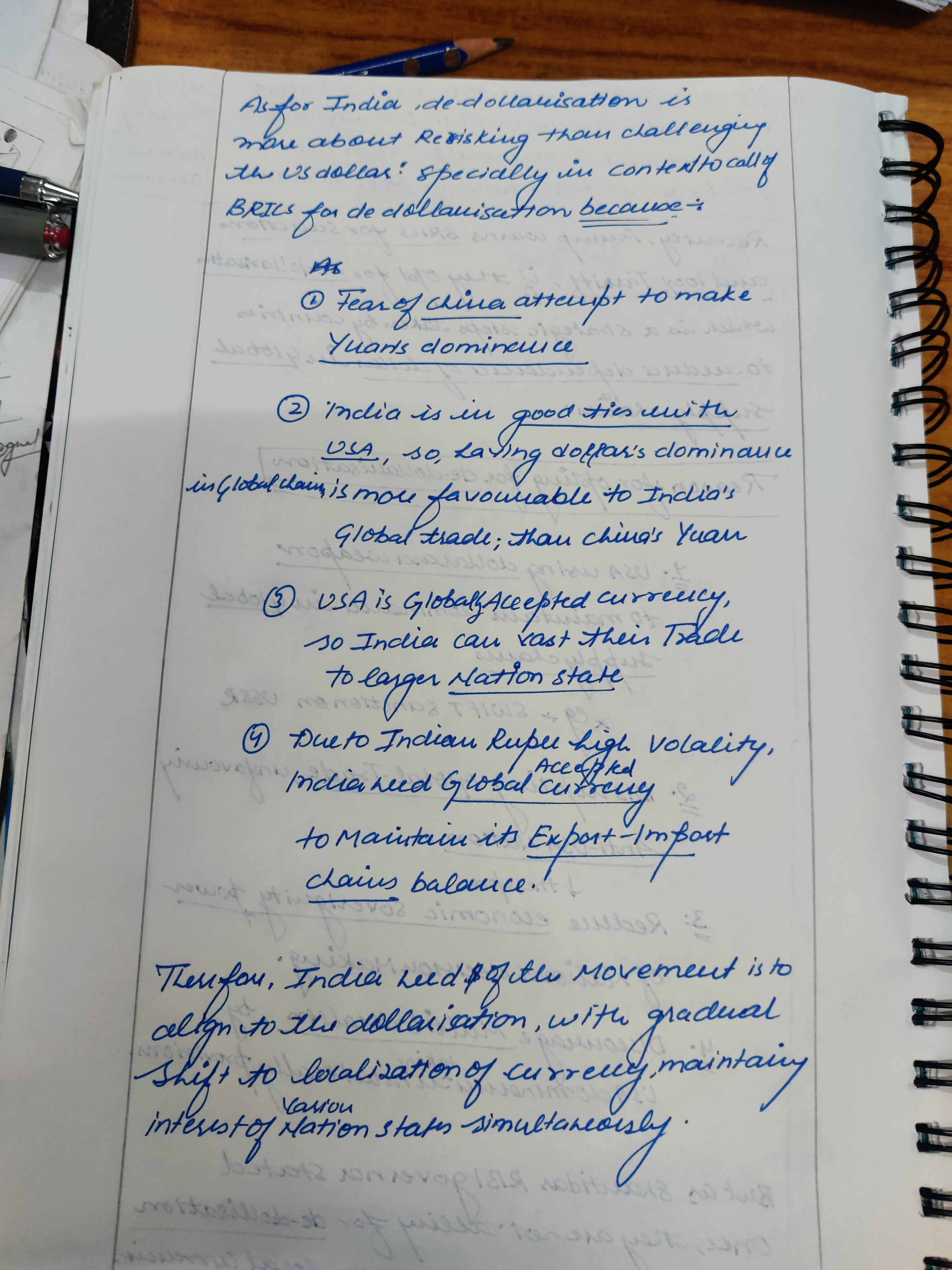 De-dollarisation offers India an opportunity to diversify trade mechanisms, reduce reliance on volatile global currencies, and strengthen regional alliances like BRICS. By promoting the Rupee’s internationalisation, fostering bilateral trade agreements, and enhancing financial resilience, India can align its trade policies with global shifts, ensuring a balanced, robust, and future-ready economic framework.