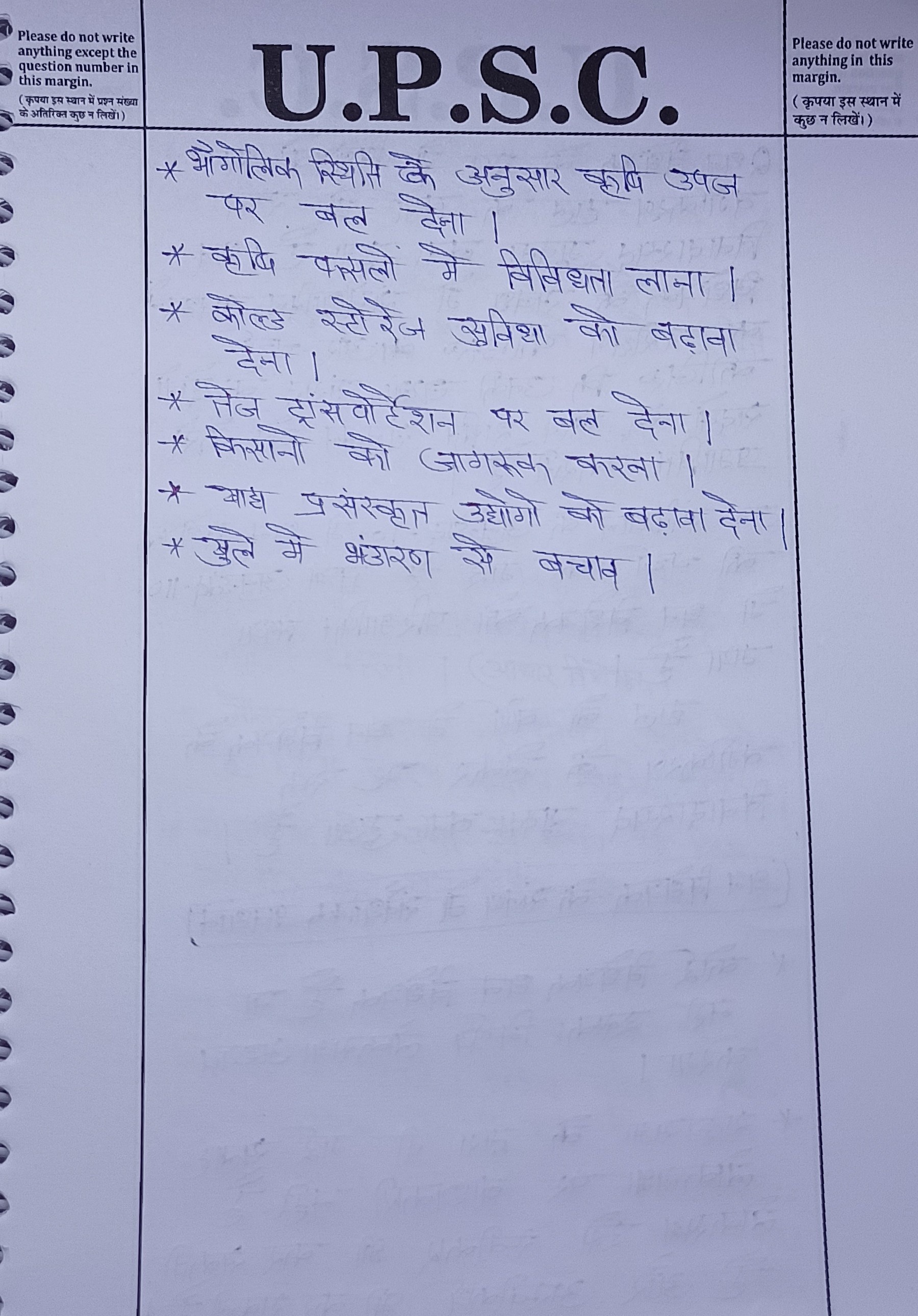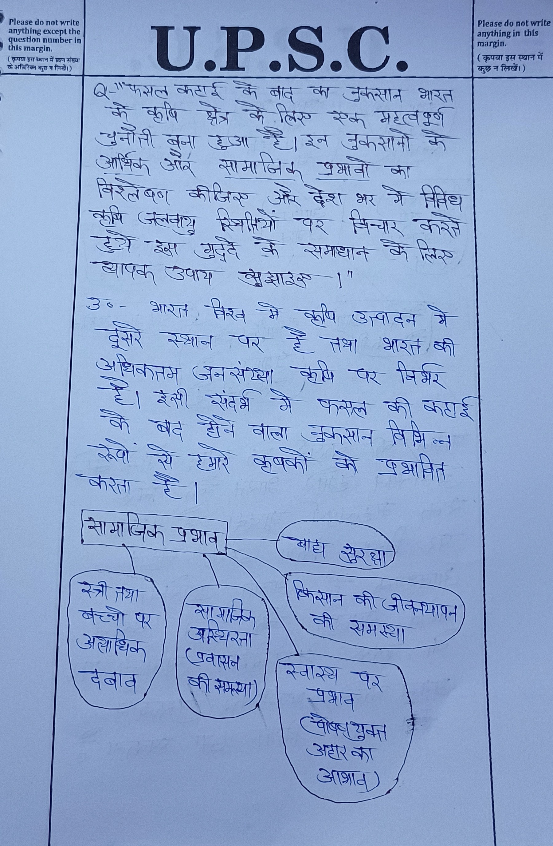 Q. "फसल की‌ कटाई के बाद का नुकसान भारत के कृषि क्षेत्र के लिए एक महत्वपूर्ण चुनौती बना हुआ है। इन नुकसानों के आर्थिक और सामाजिक प्रभावों का विश्लेषण कीजिए और देश भर में विविध कृषि-जलवायु स्थितियों पर विचार करते हुए इस मुद्दे के समाधान के लिए व्यापक उपाय सुझाएं।" (15 अंक, 250 शब्द)