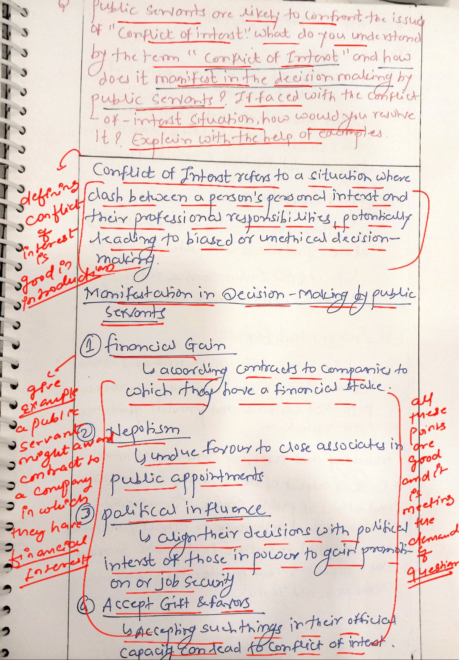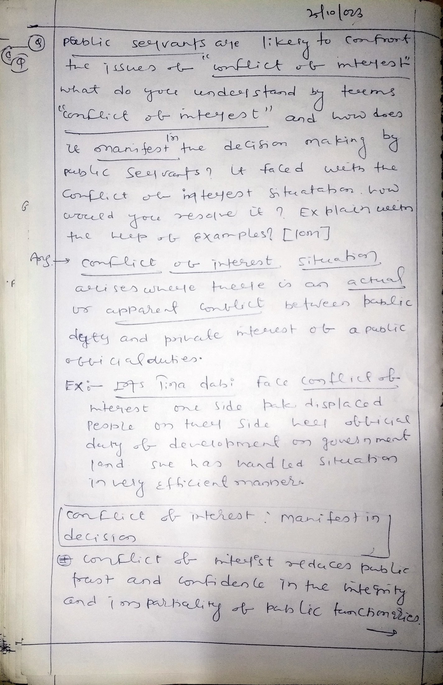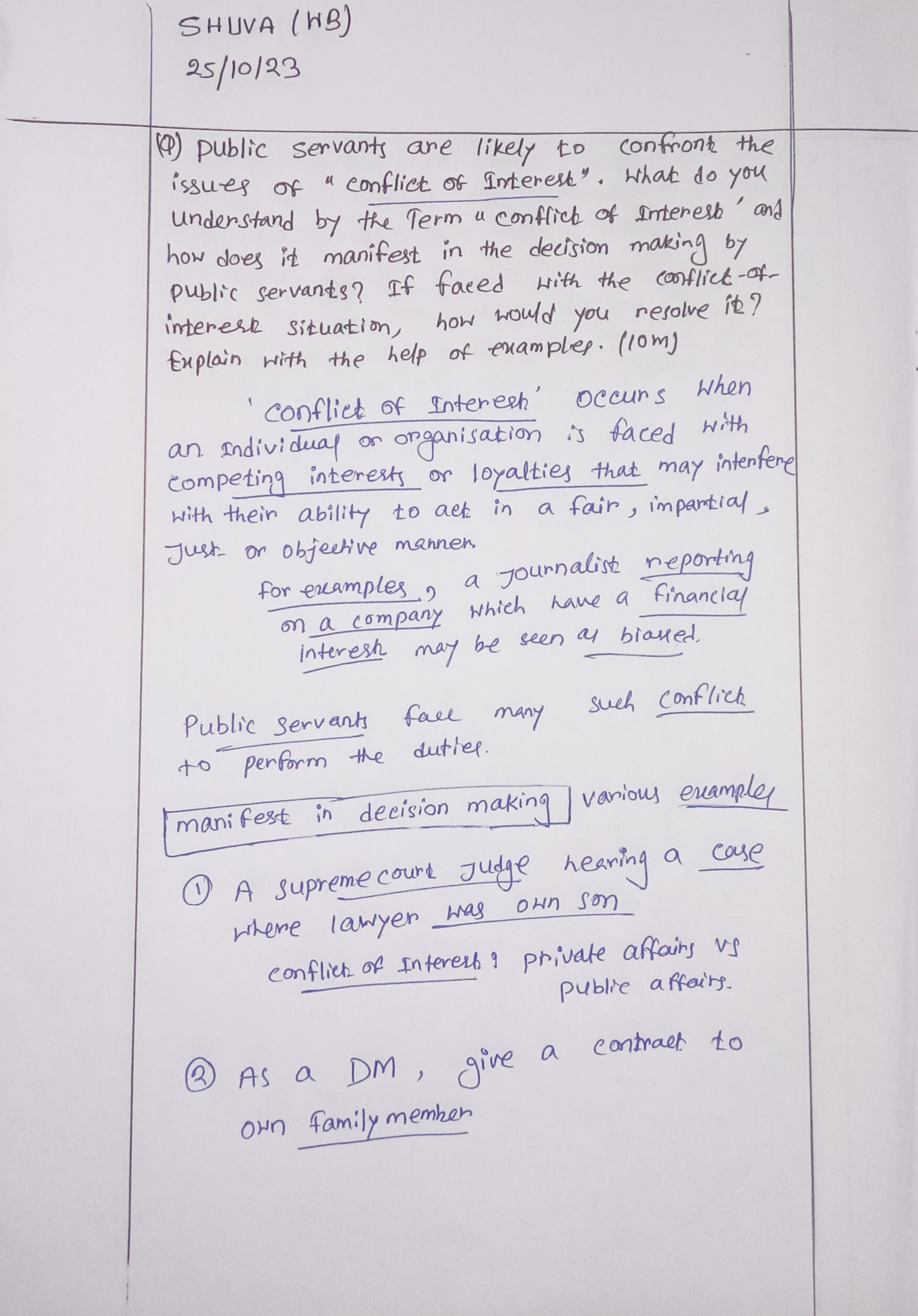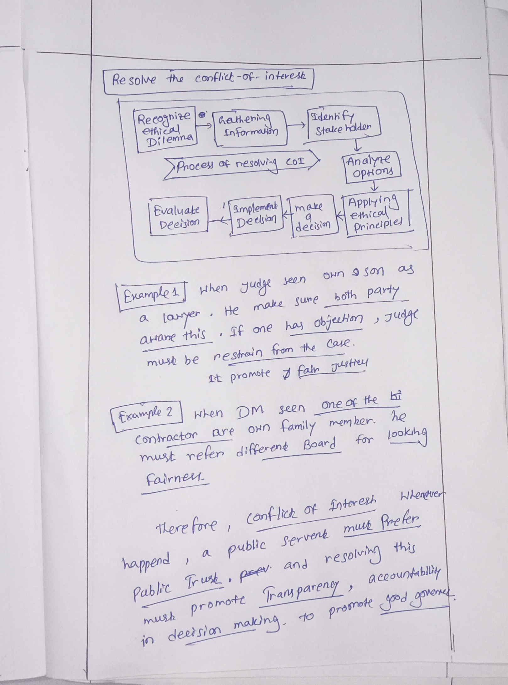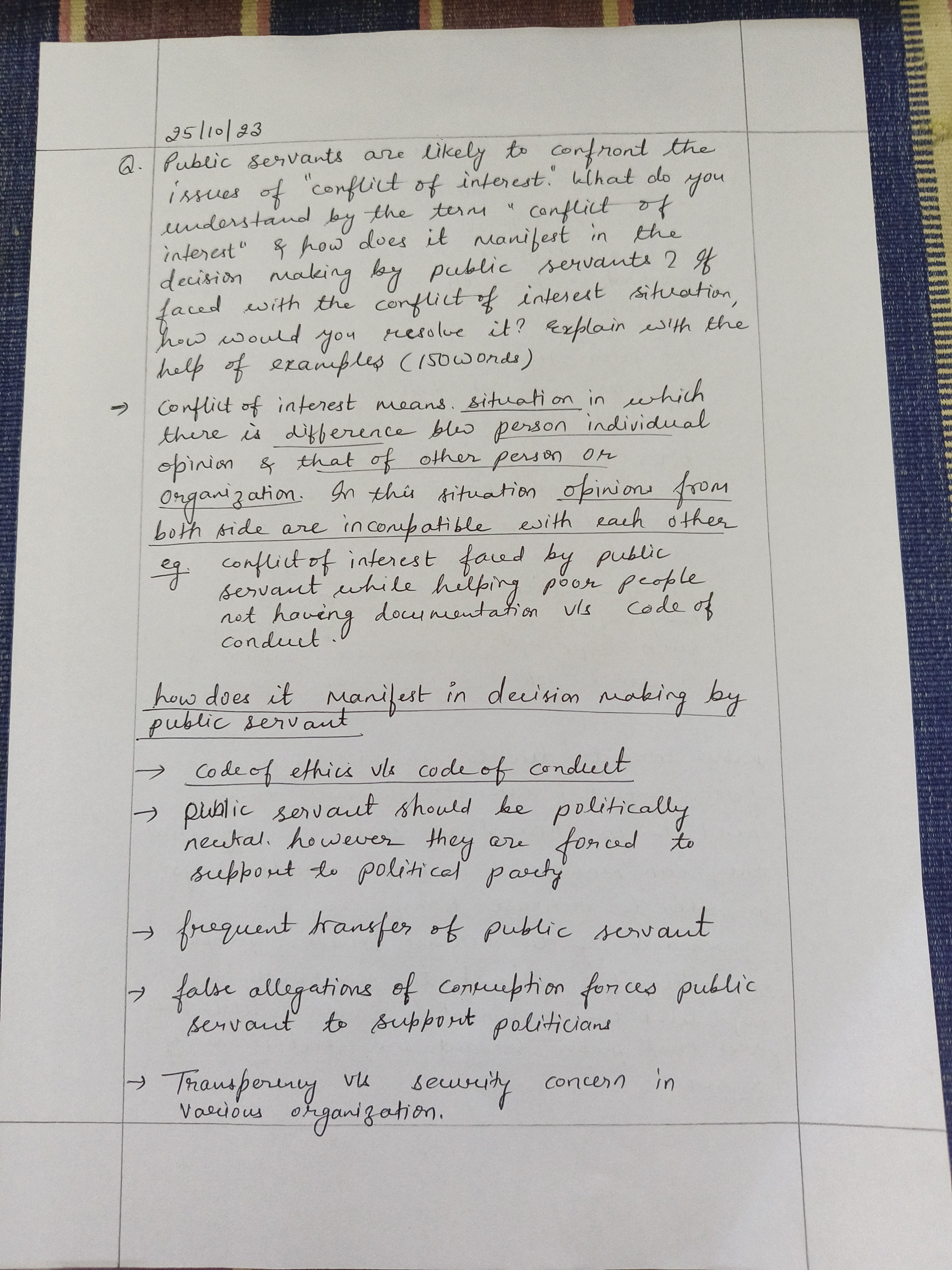 Q. Public servants are likely to confront the issues of “Conflict of Interest”. What do you understand by the term “Conflict of Interest” and how does it manifest in the decision making by public servants? If faced with the conflict-of-interest situation, how would you resolve it? Explain with the help of examples. (150 words, 10 Marks)