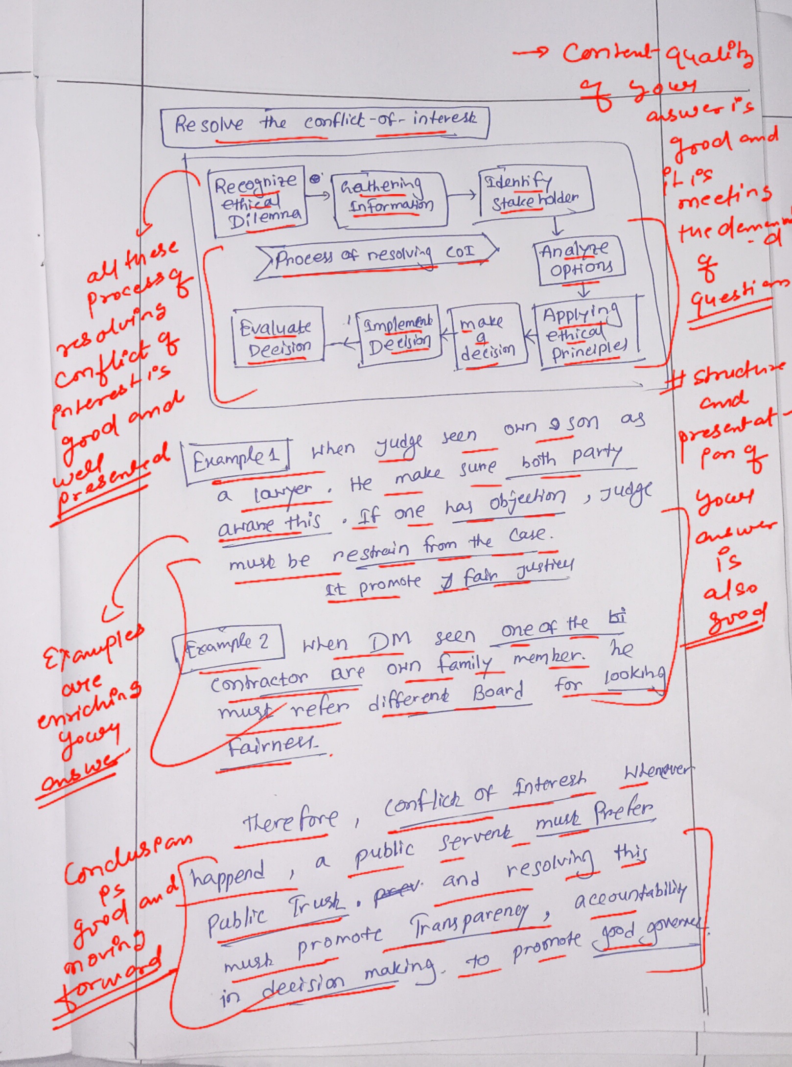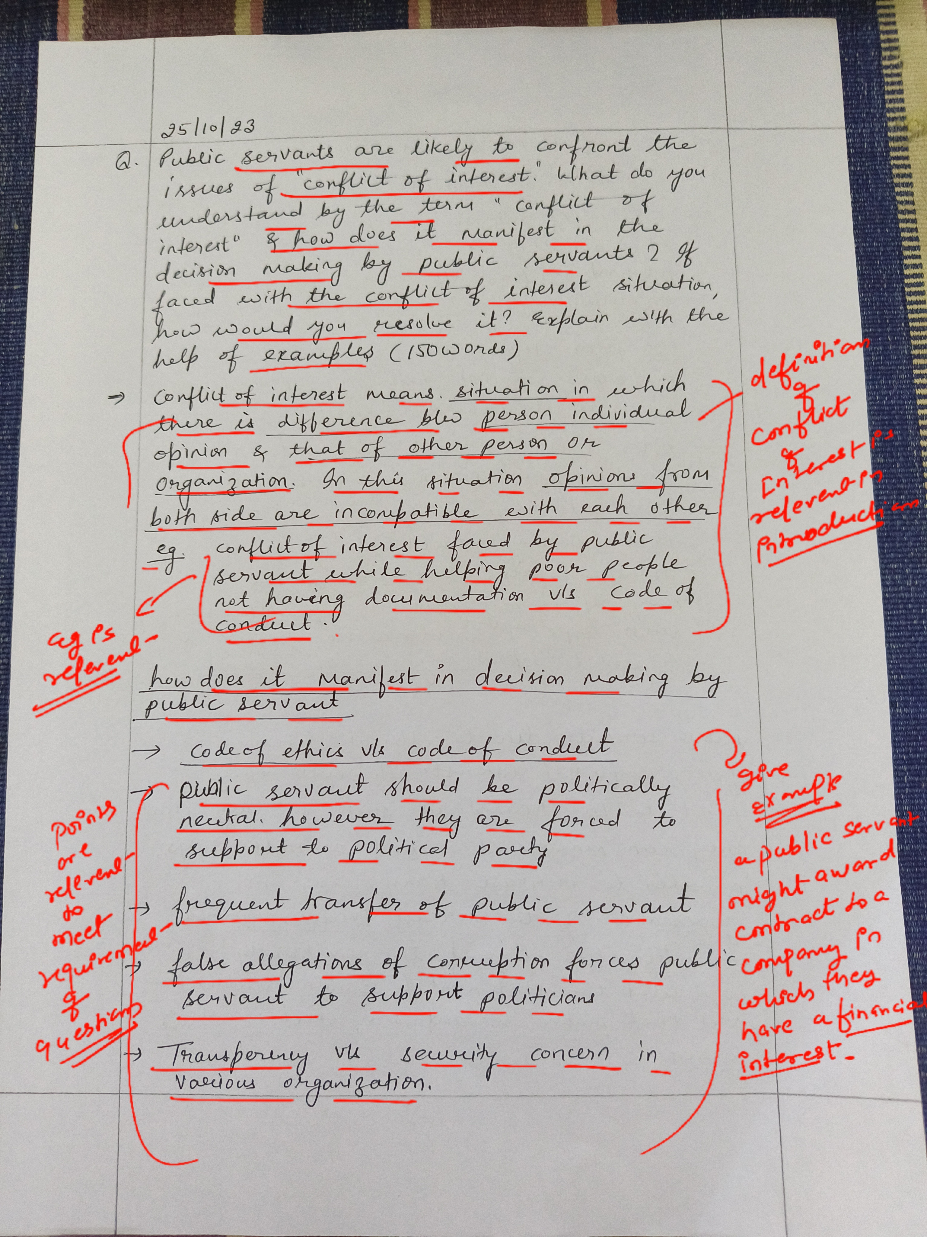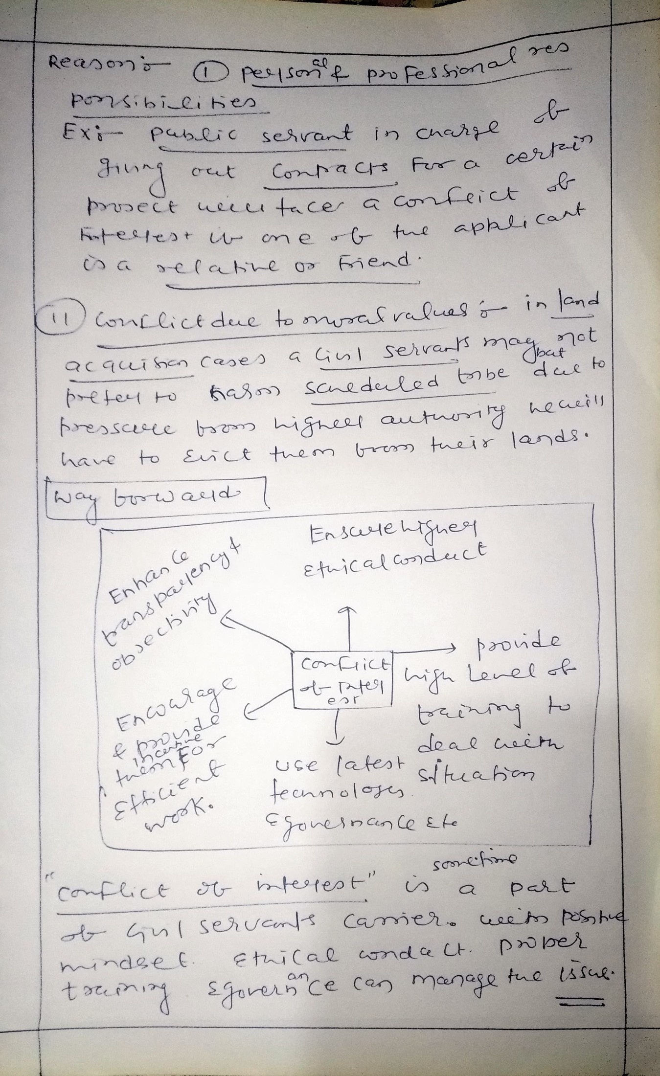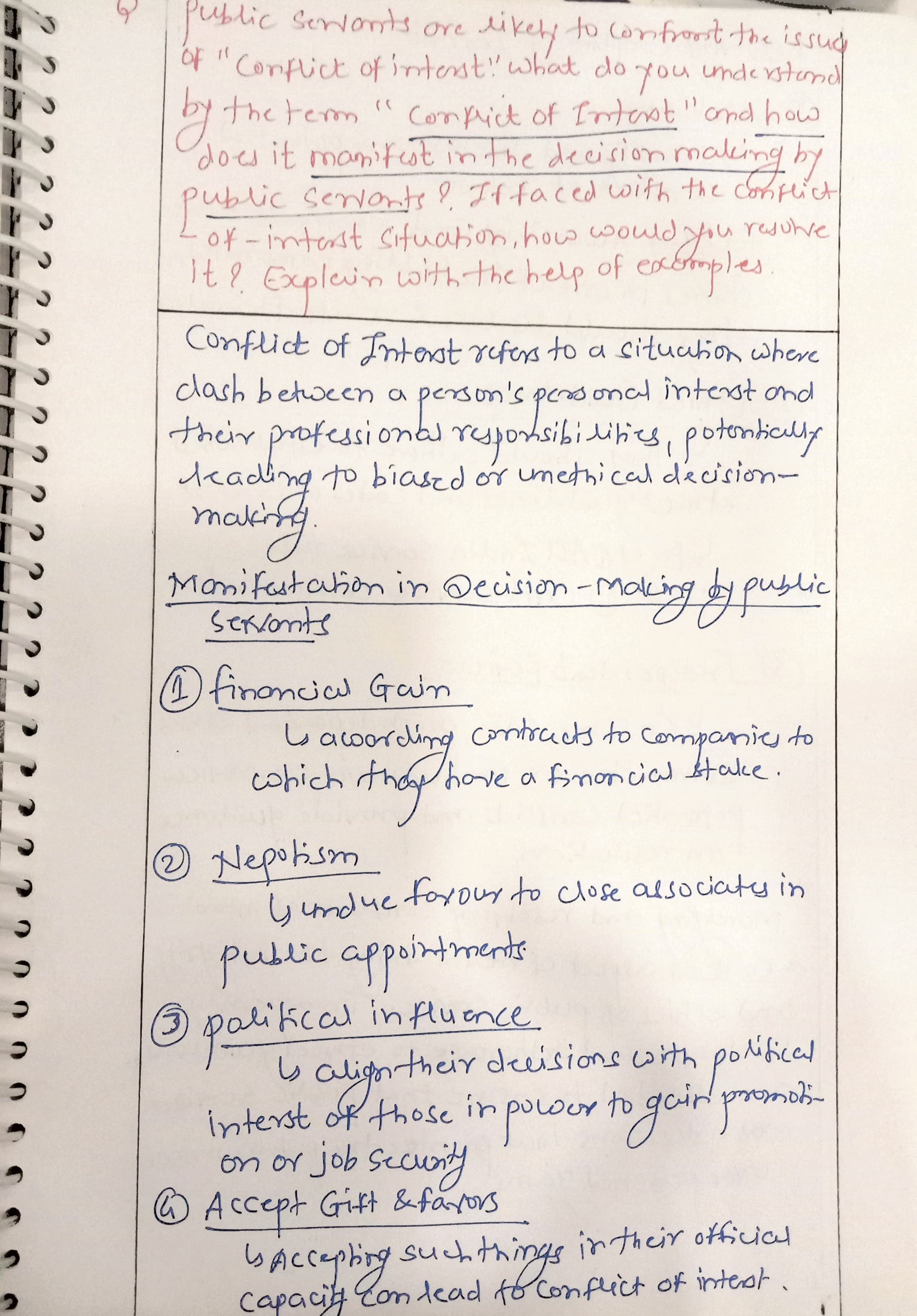 Q. Public servants are likely to confront the issues of “Conflict of Interest”. What do you understand by the term “Conflict of Interest” and how does it manifest in the decision making by public servants? If faced with the conflict-of-interest situation, how would you resolve it? Explain with the help of examples. (150 words, 10 Marks)