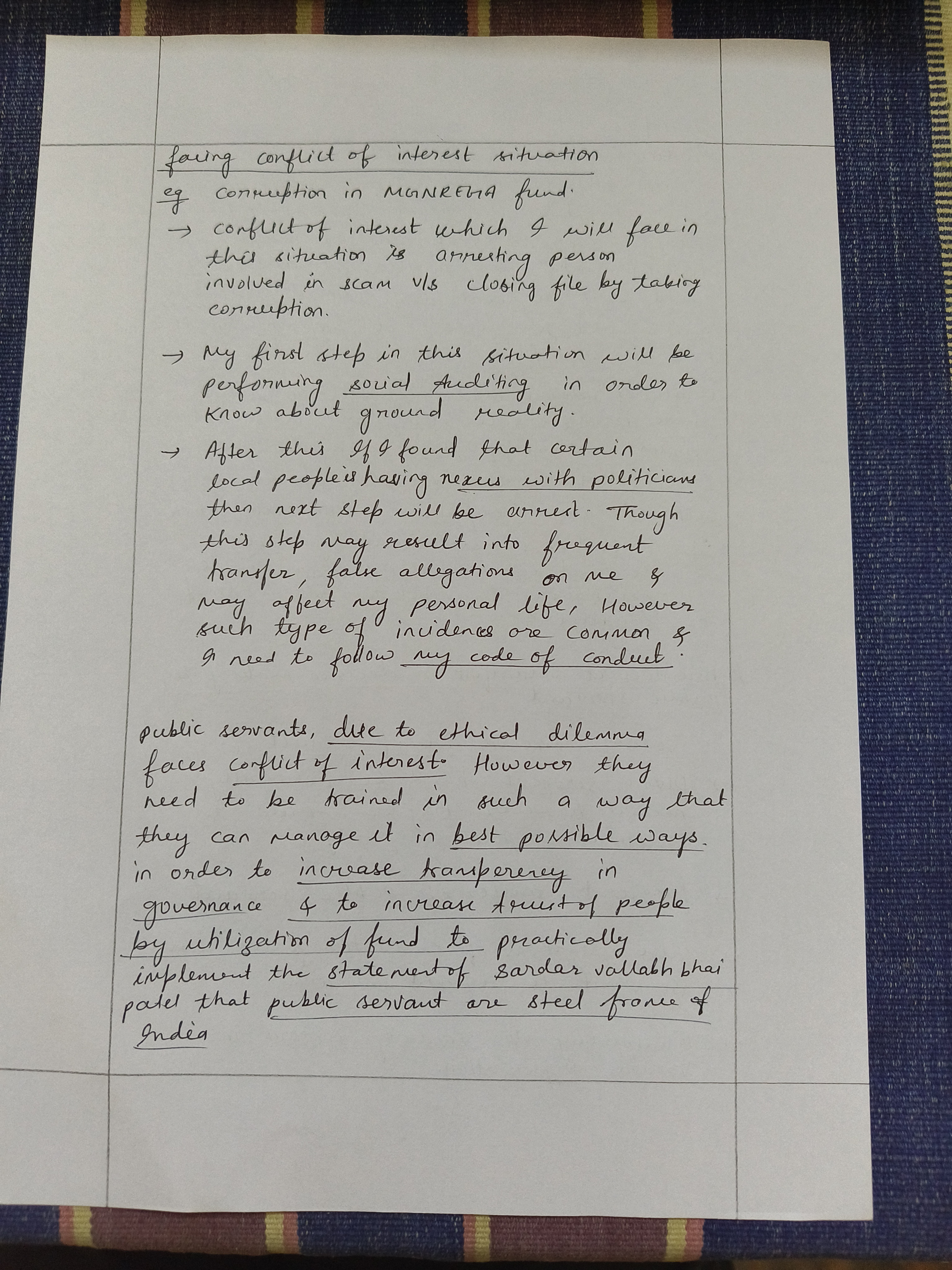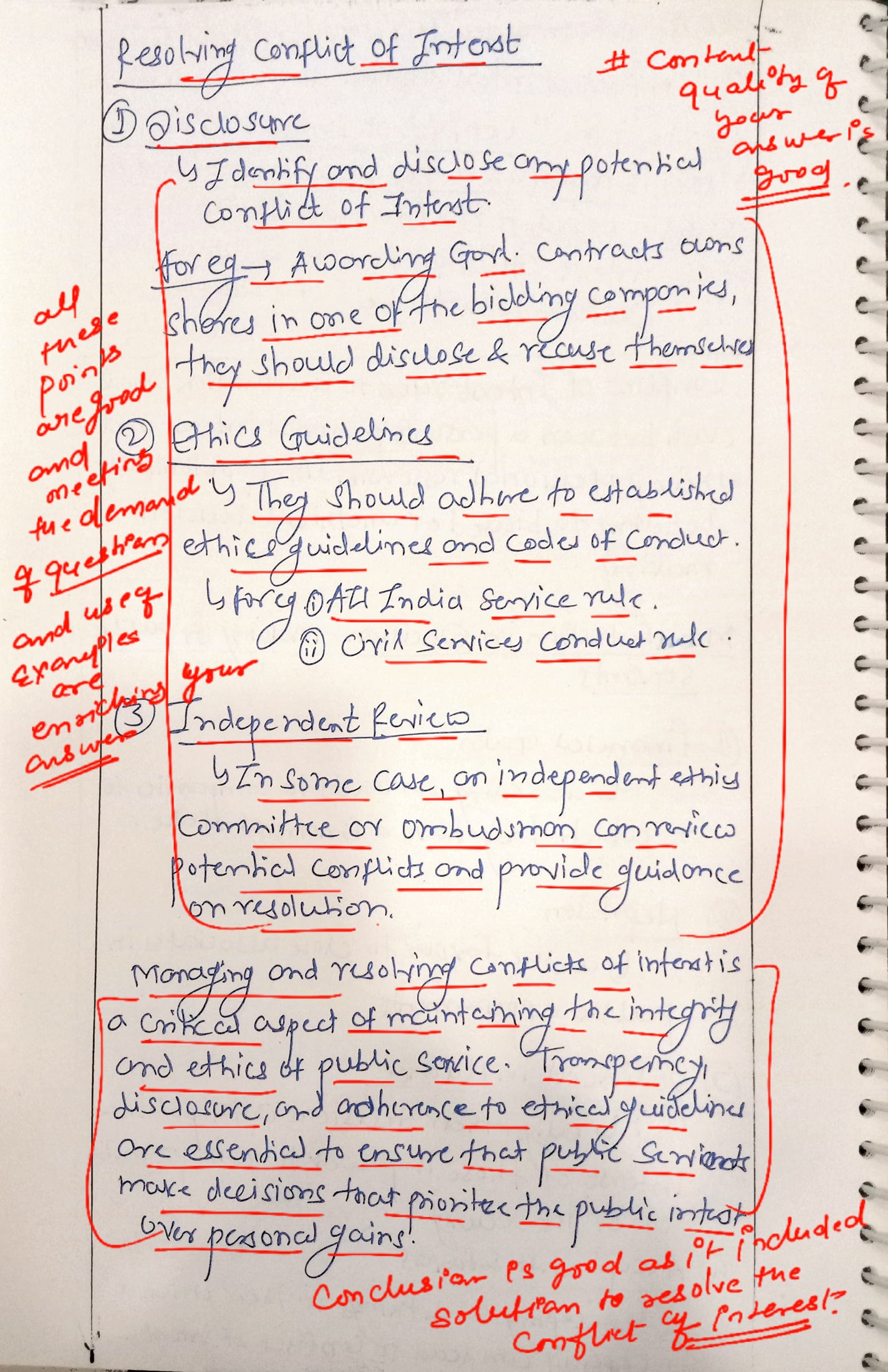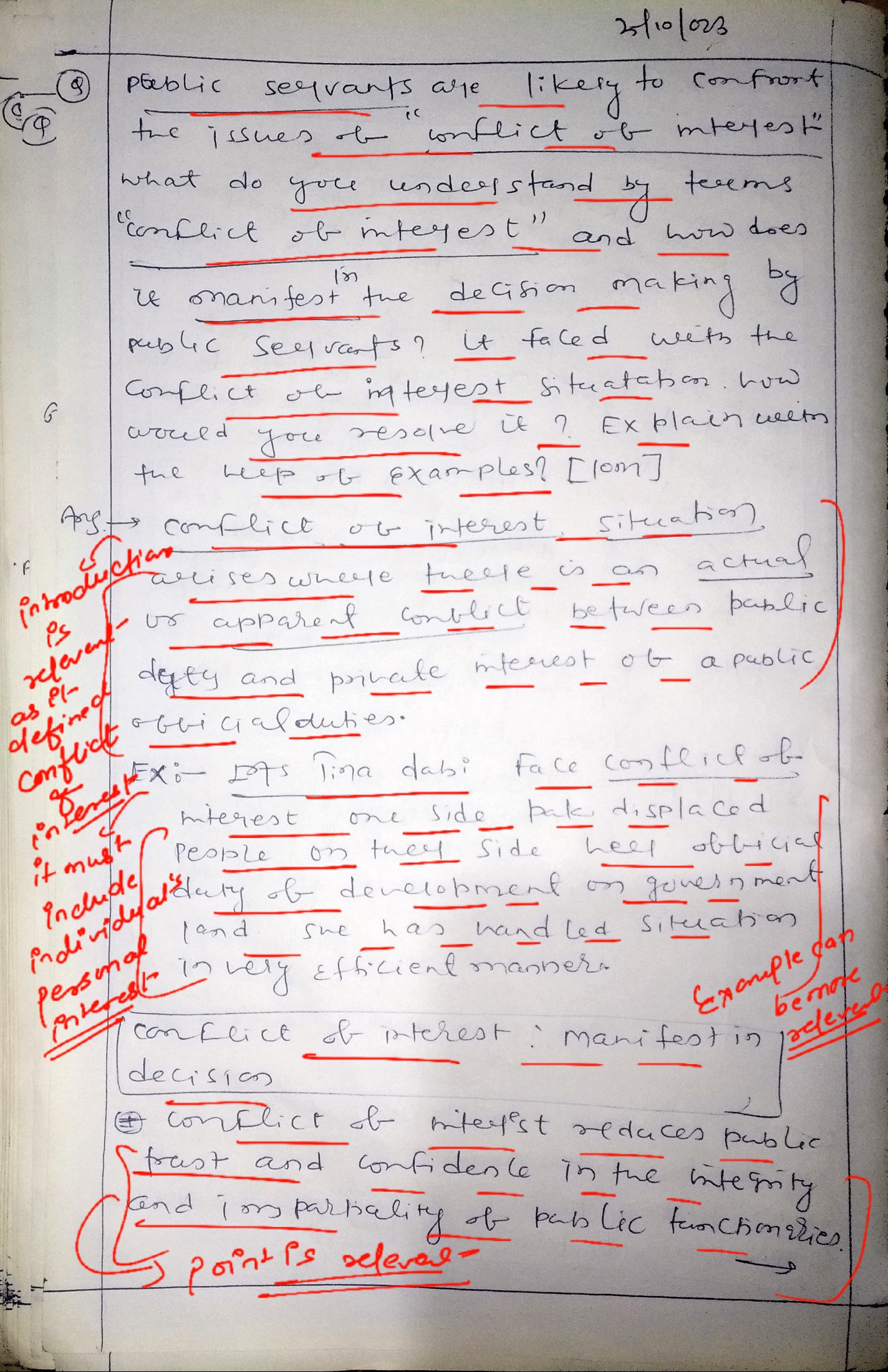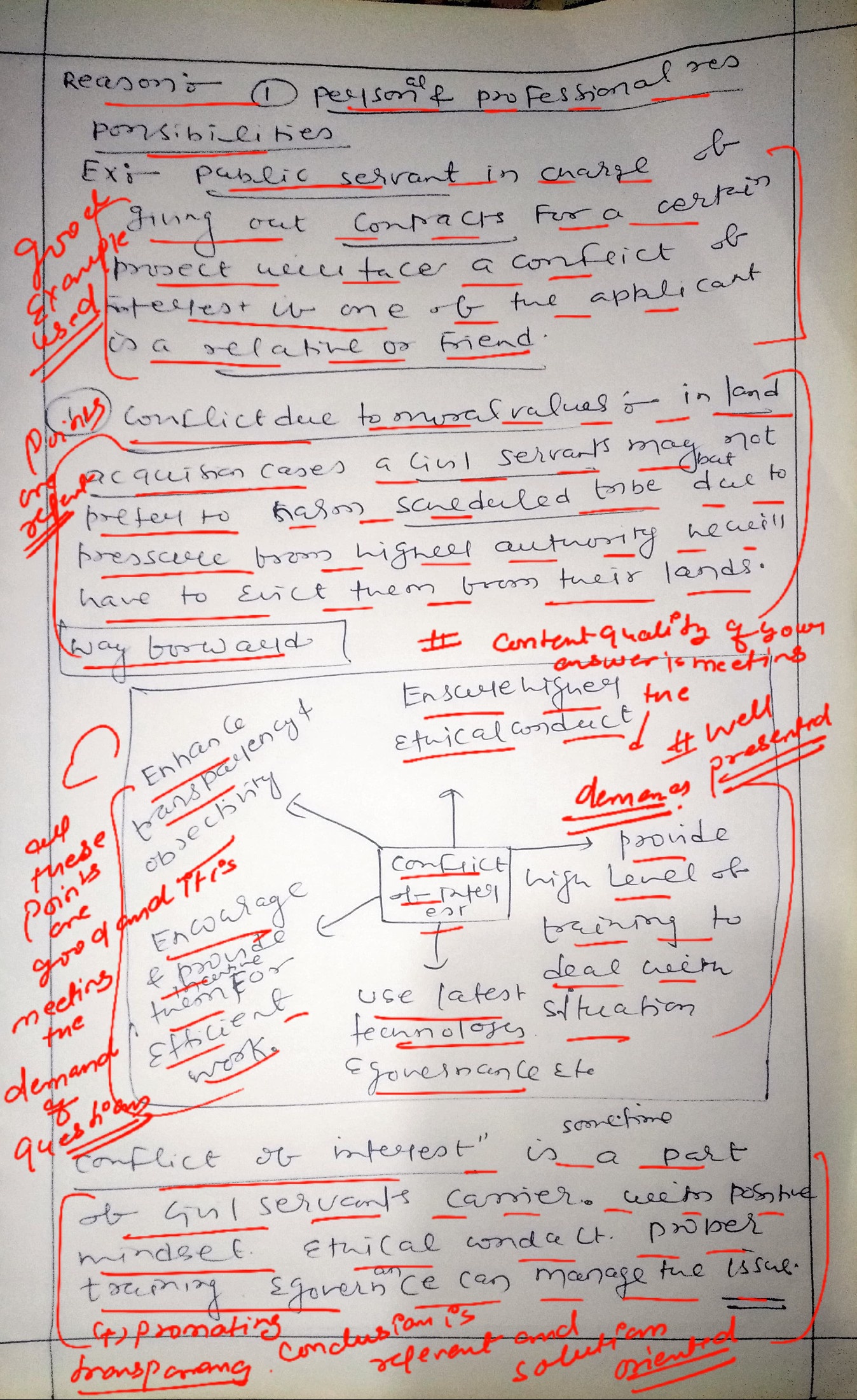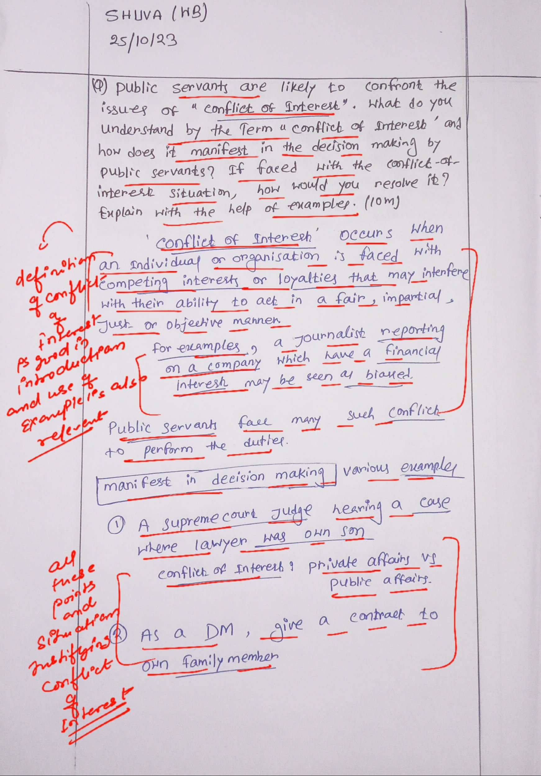 Q. Public servants are likely to confront the issues of “Conflict of Interest”. What do you understand by the term “Conflict of Interest” and how does it manifest in the decision making by public servants? If faced with the conflict-of-interest situation, how would you resolve it? Explain with the help of examples. (150 words, 10 Marks)