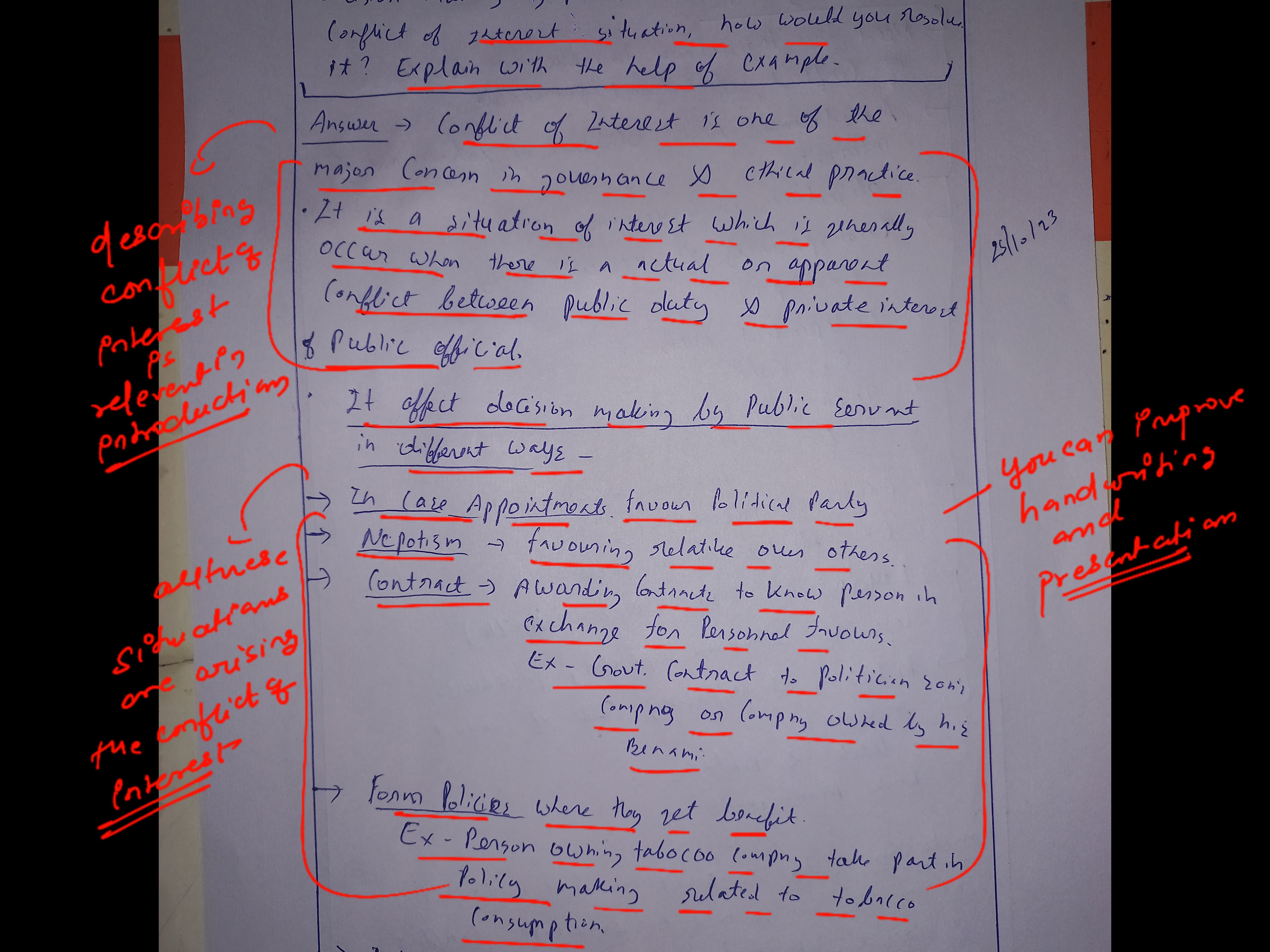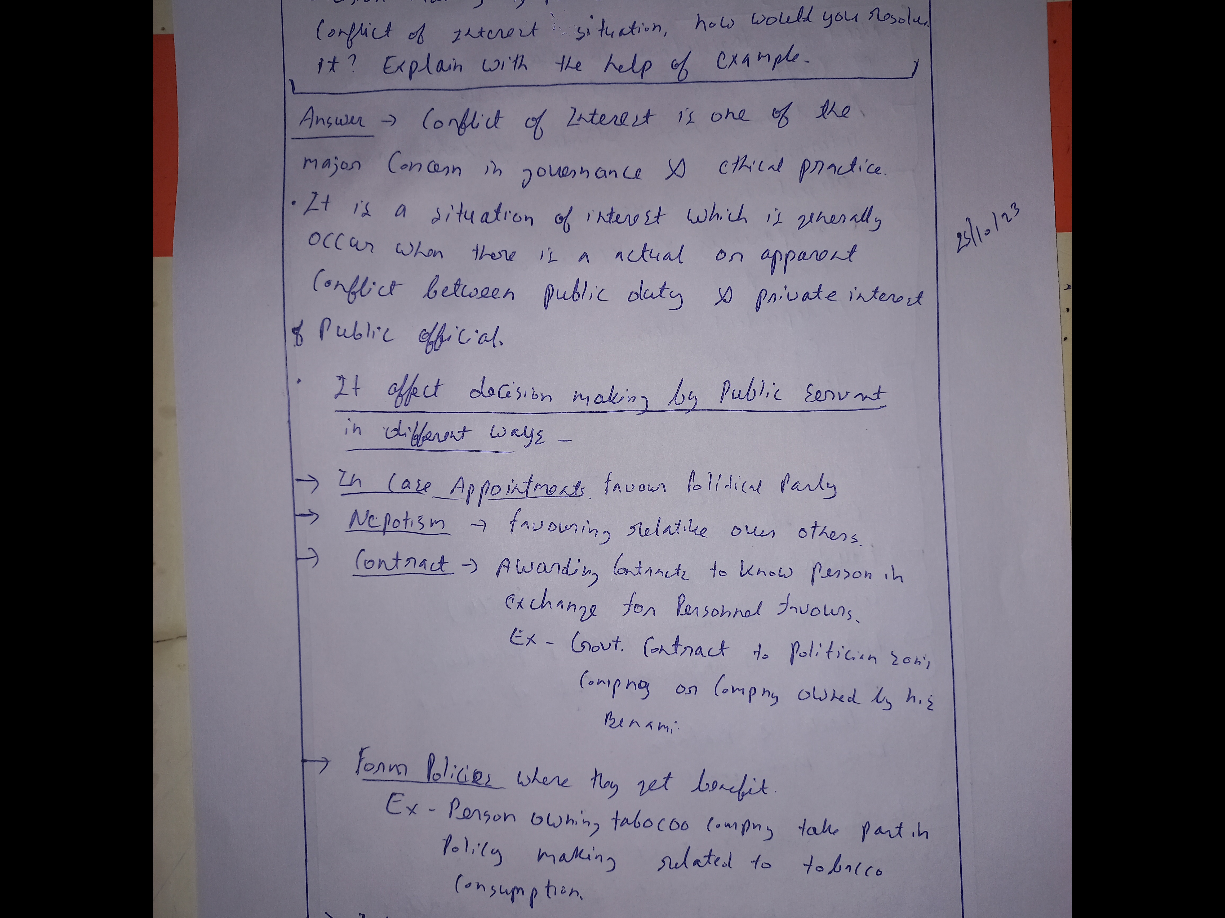 1. Mention how conflict of interest manifests in decision making by public servants.