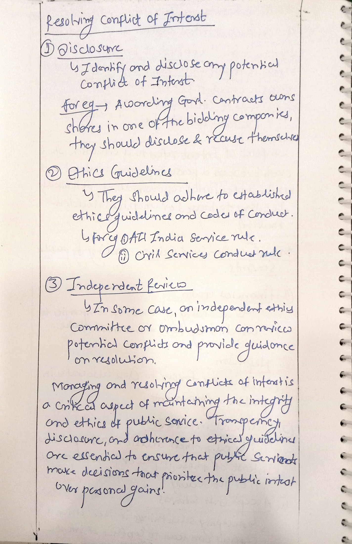 For example, if a public servant has a financial interest in a particular project, they should disclose this conflict to their supervisor and recuse themselves from the decision-making process to avoid any appearance of impropriety.