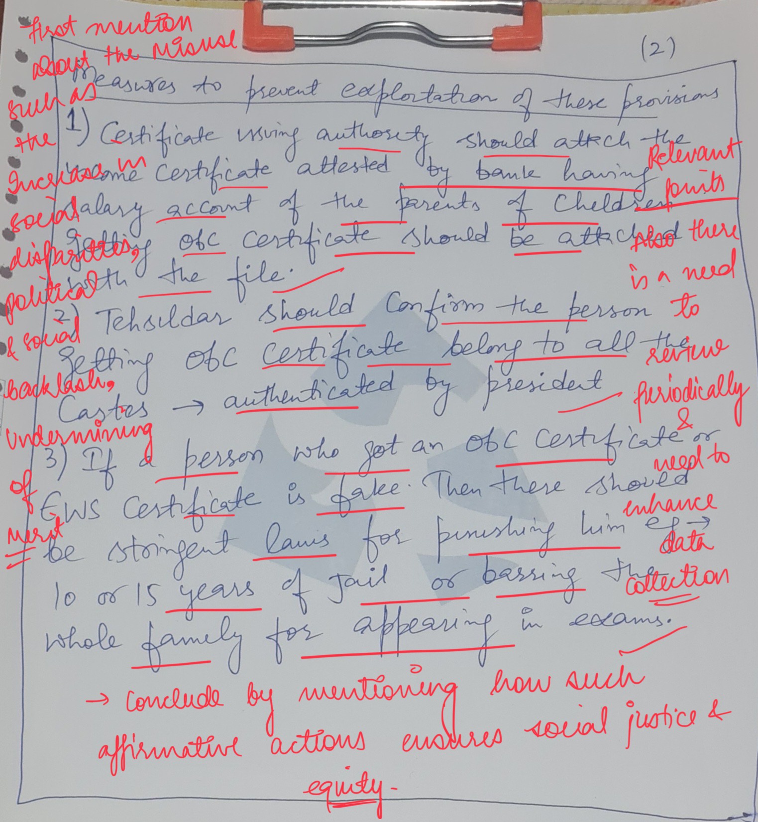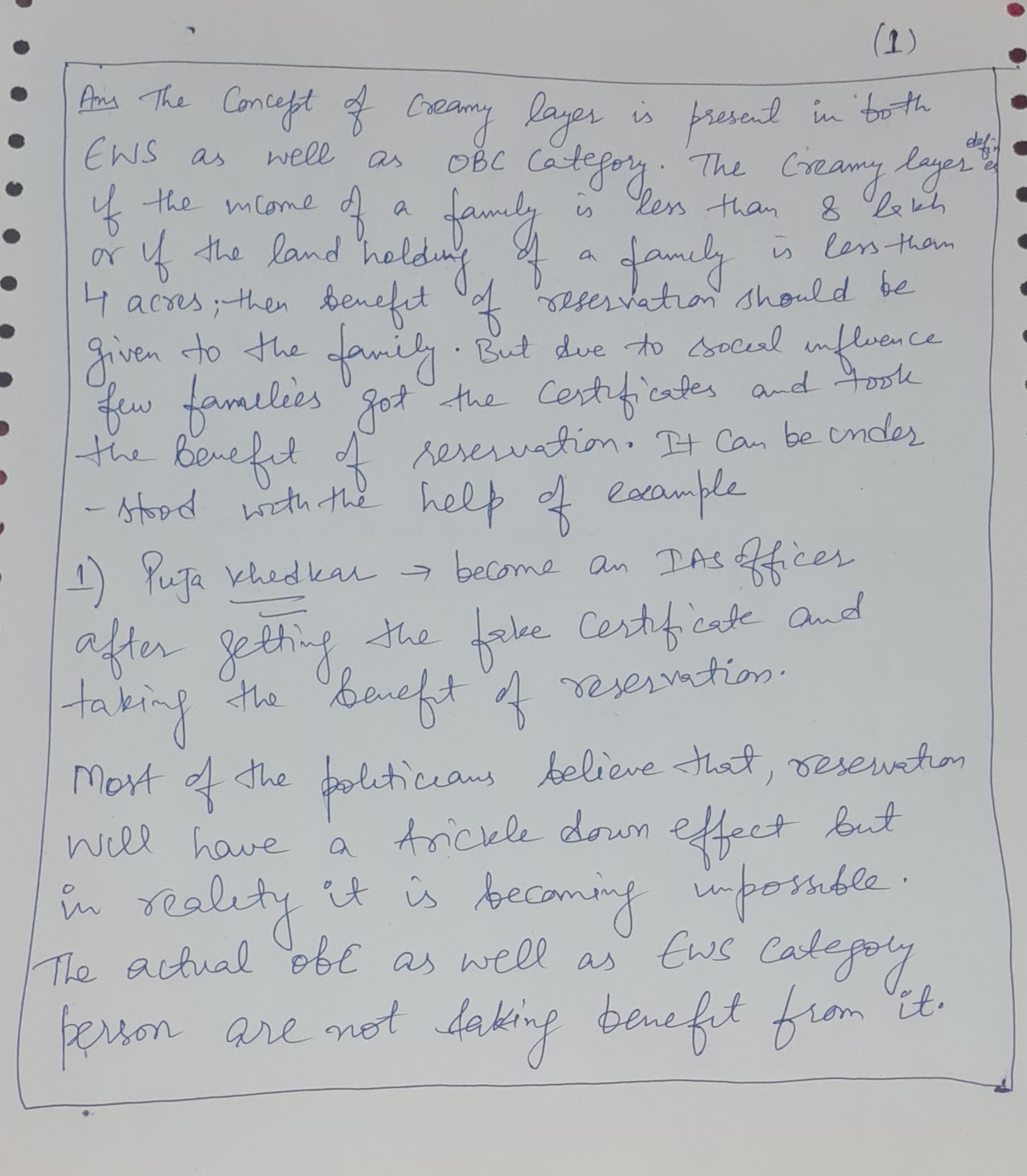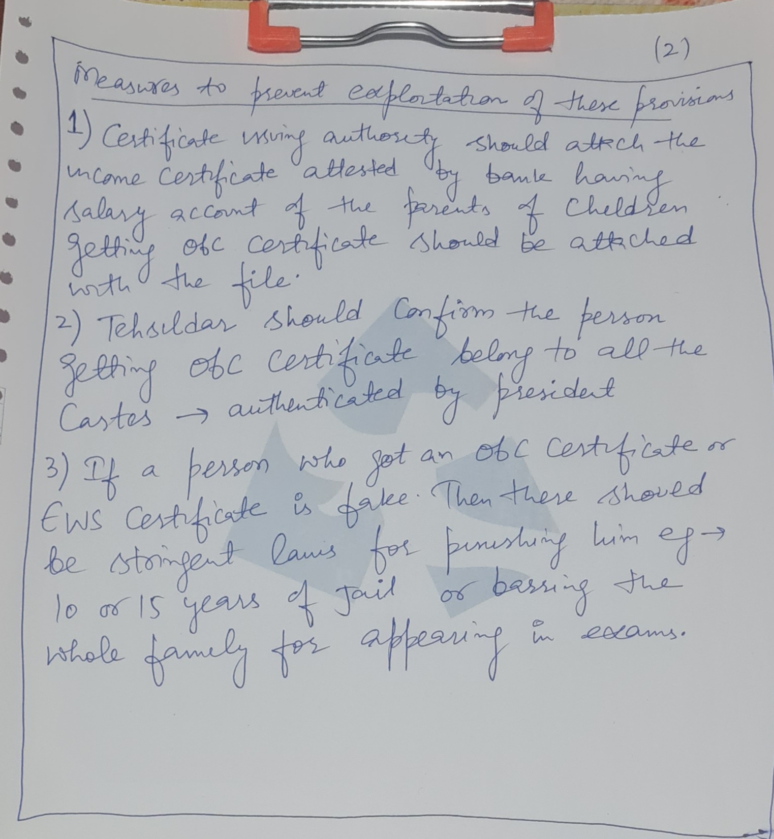 Q. In light of the recent cases of misuse of the creamy layer provision, examine how this misuse impacts the reservation system’s intended beneficiaries. Suggest measures to prevent the exploitation of these provisions while ensuring fair representation. (10 Marks, 150 Words)
