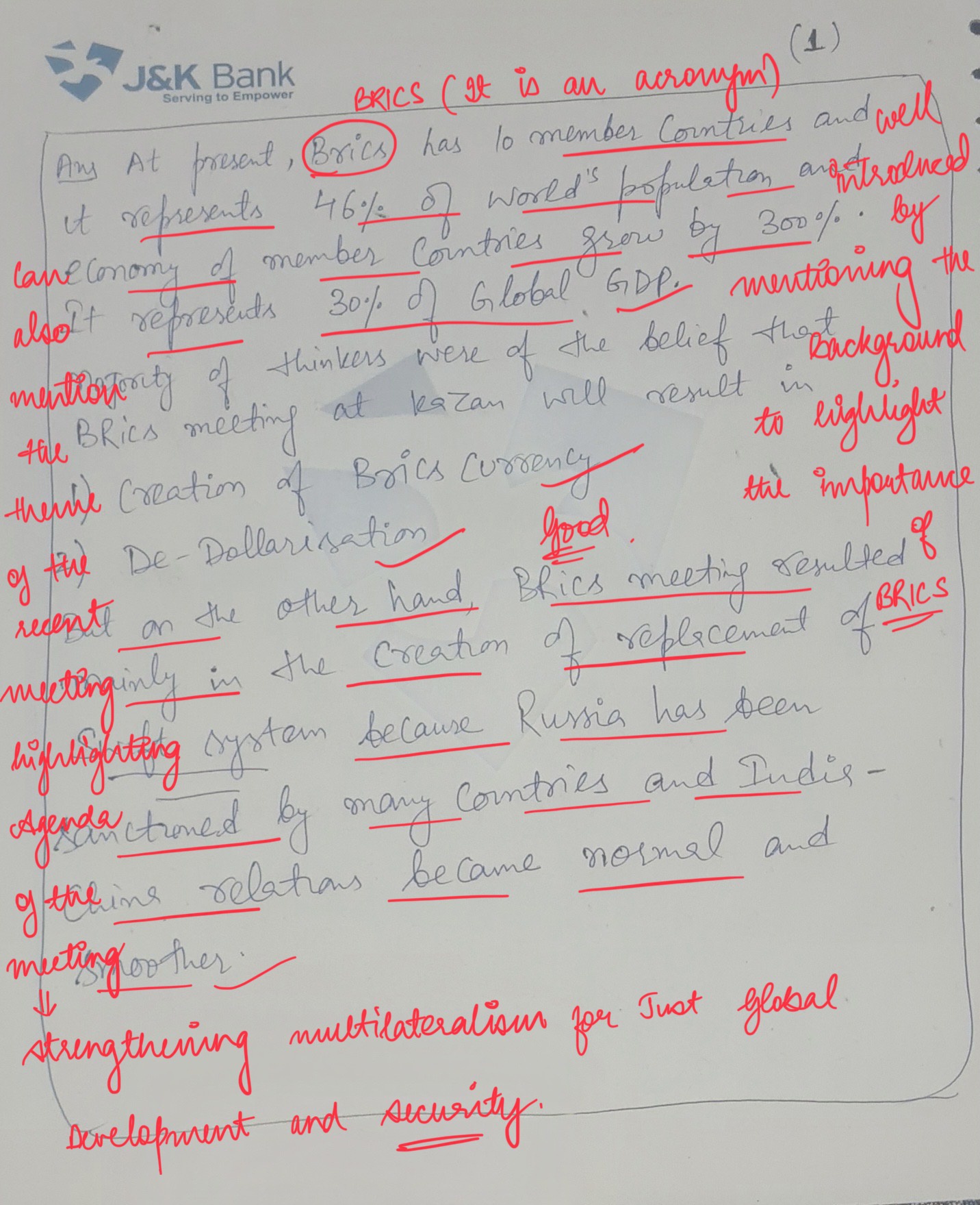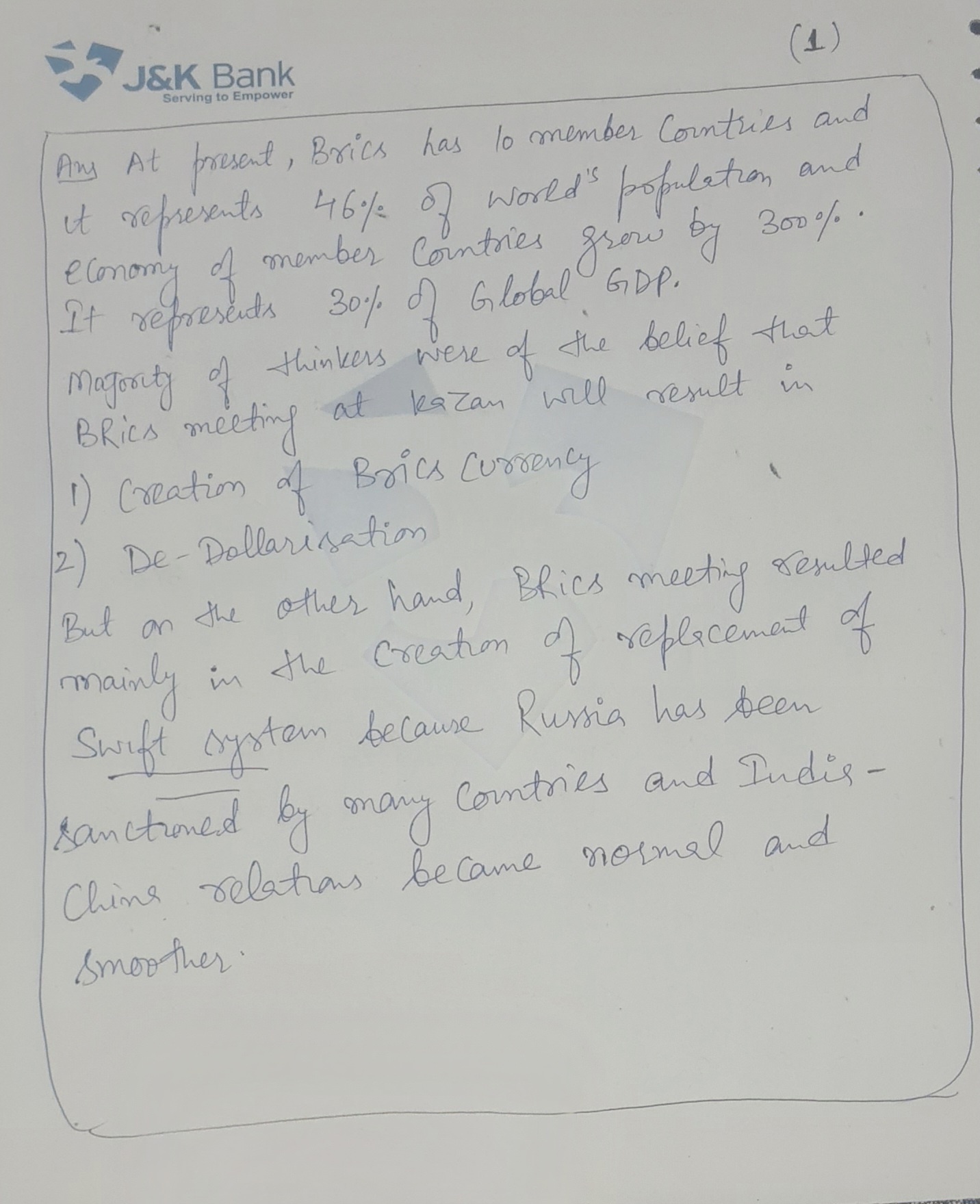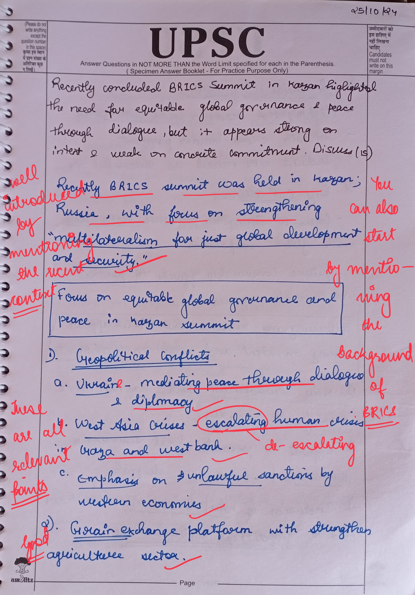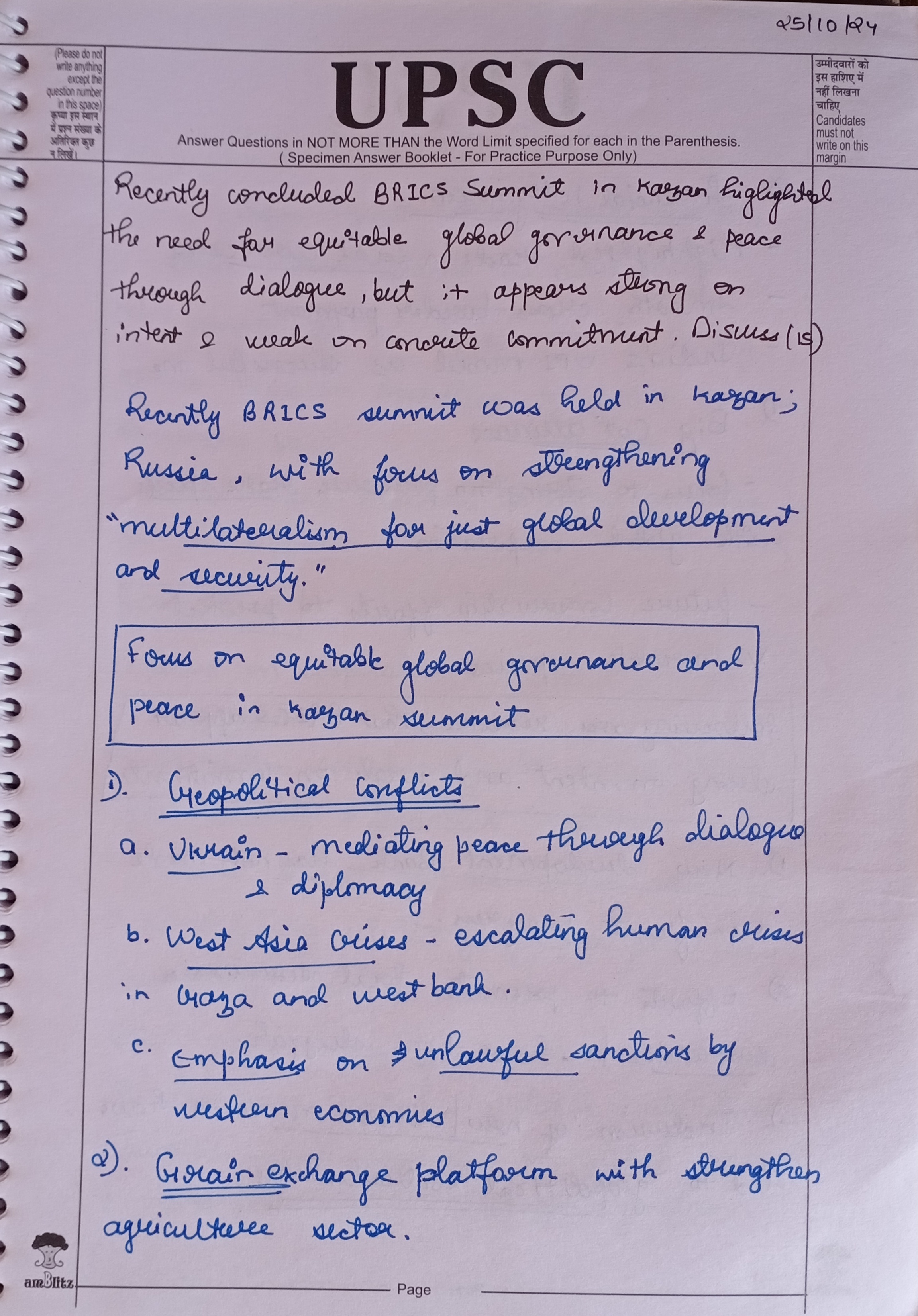 - Highlight how the recently concluded BRICS Summit in Kazan emphasised the importance of equitable global governance and promoting peace through dialogue.