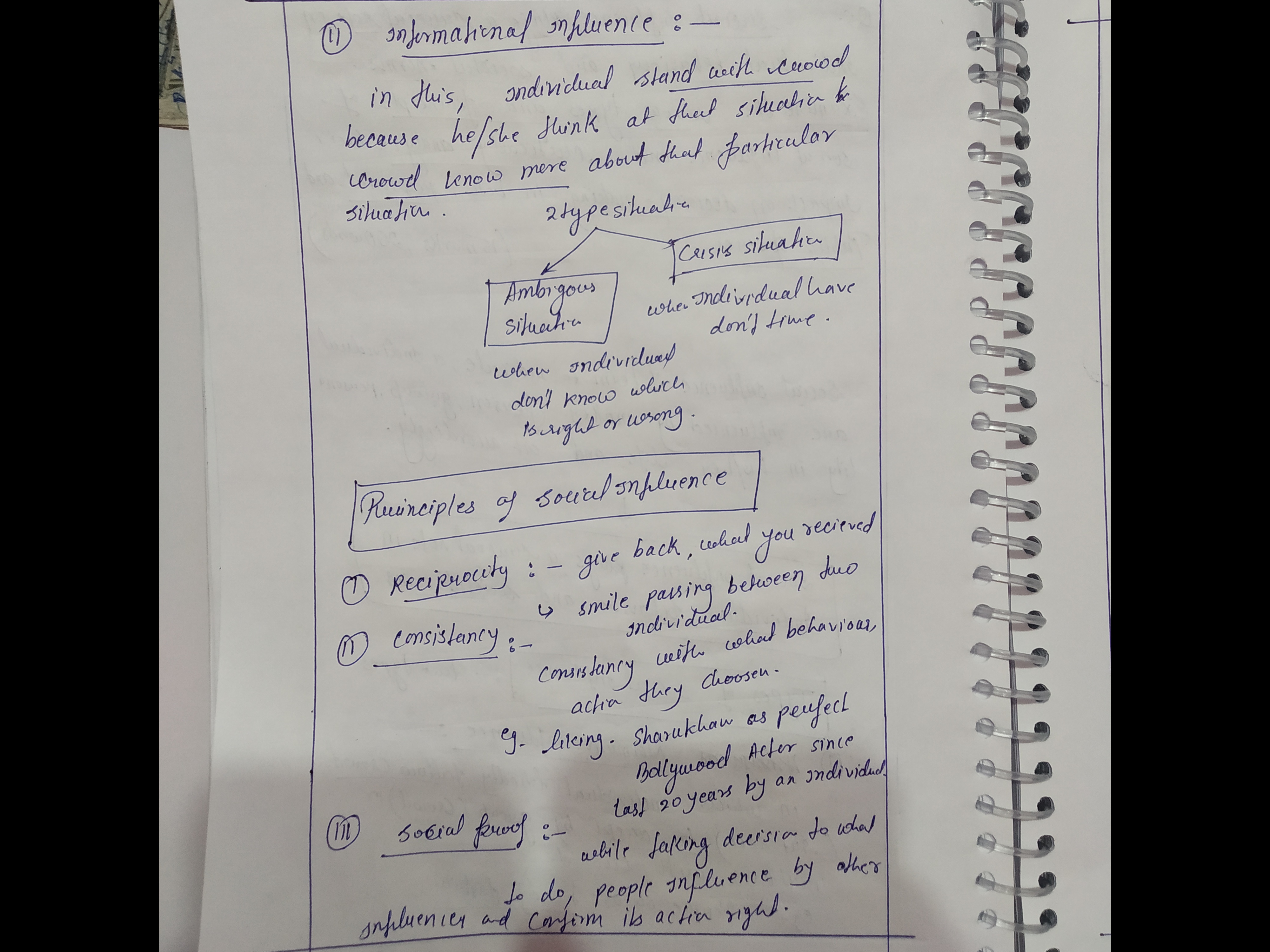 - Informational Social Influence: When uncertain, people look to others for guidance, especially in unfamiliar situations, assuming that the group’s behaviour is correct.