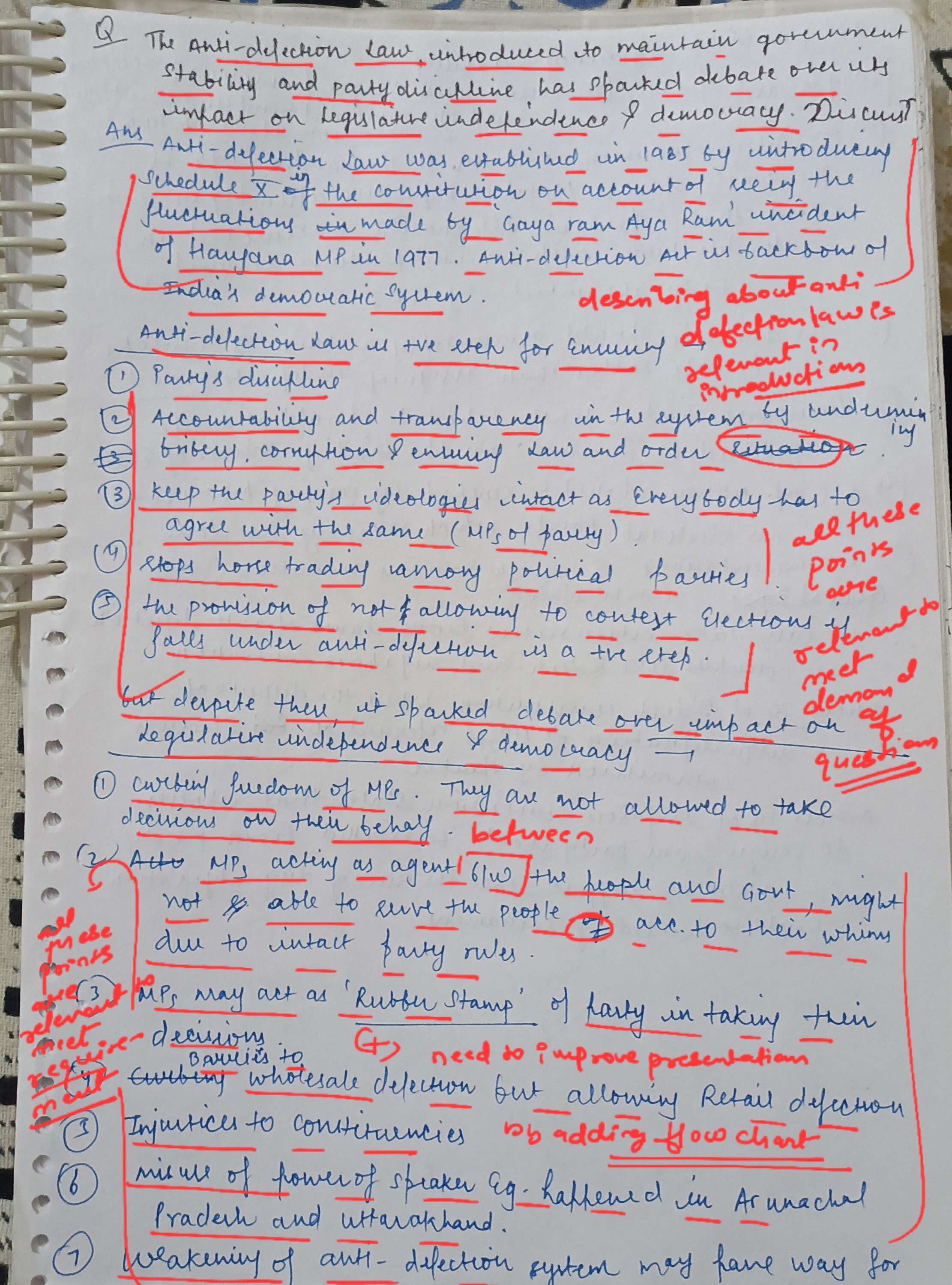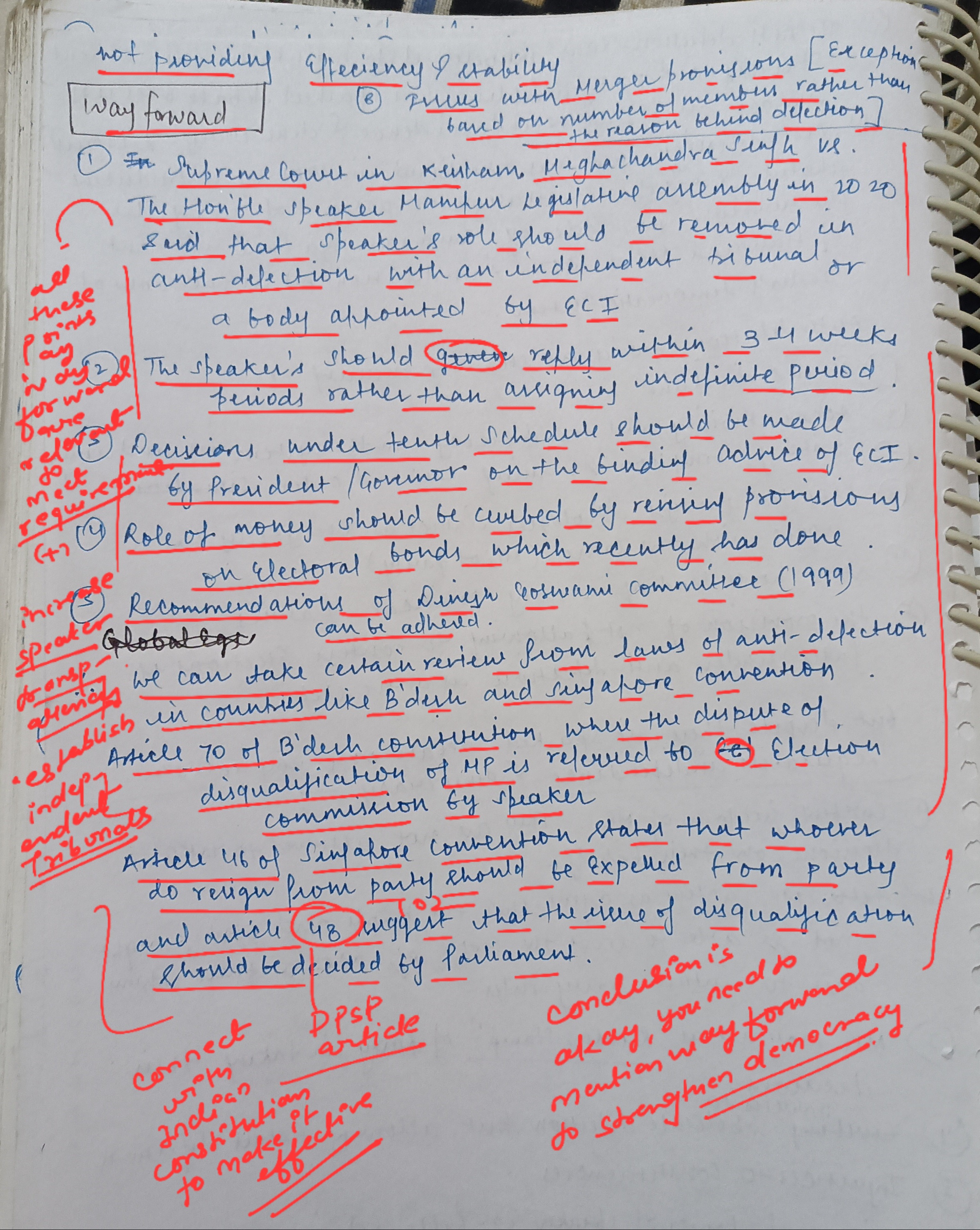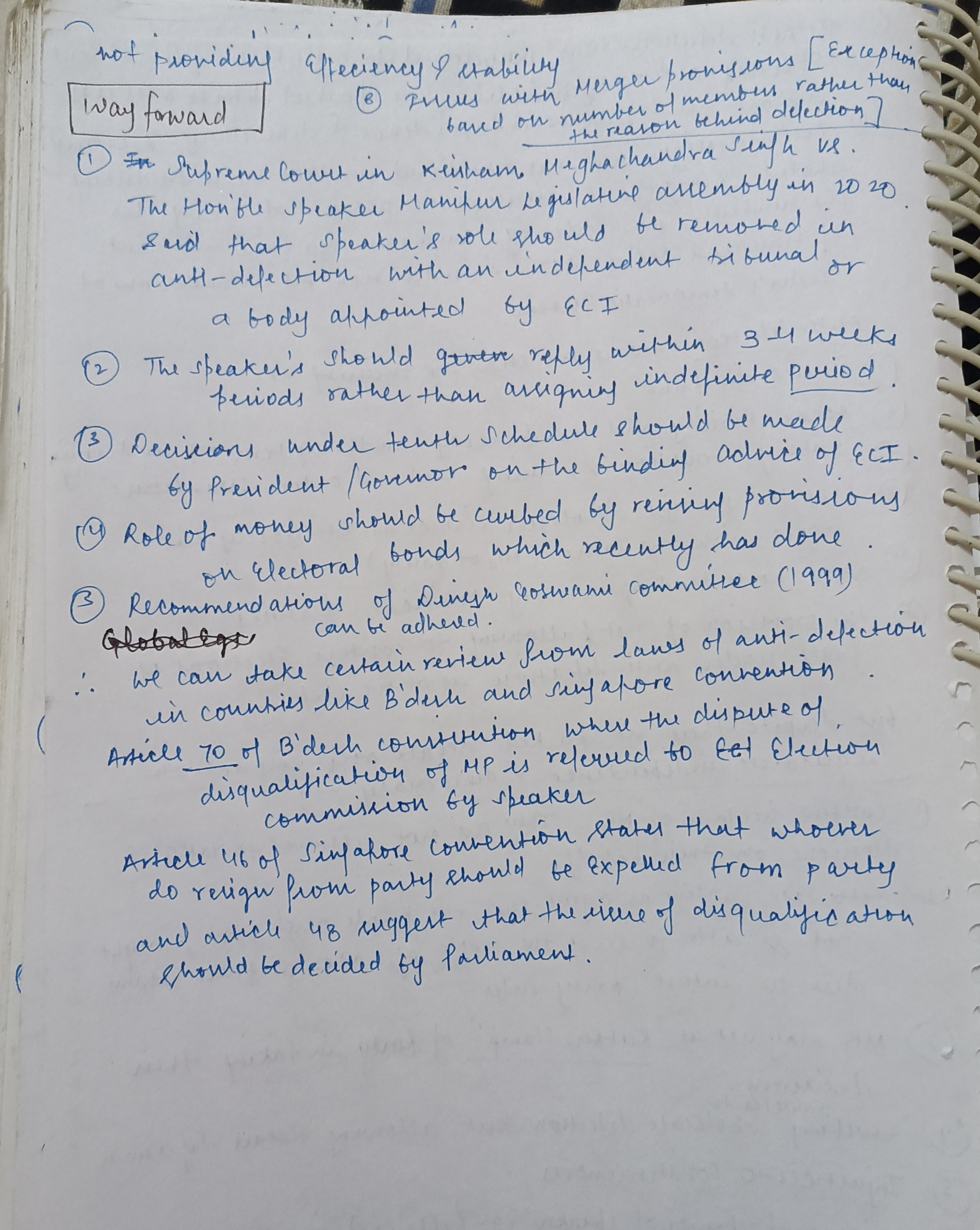 For instance: The National Commission to Review the Working of the Constitution recommended strengthening internal party democracy for smoother legislative processes.